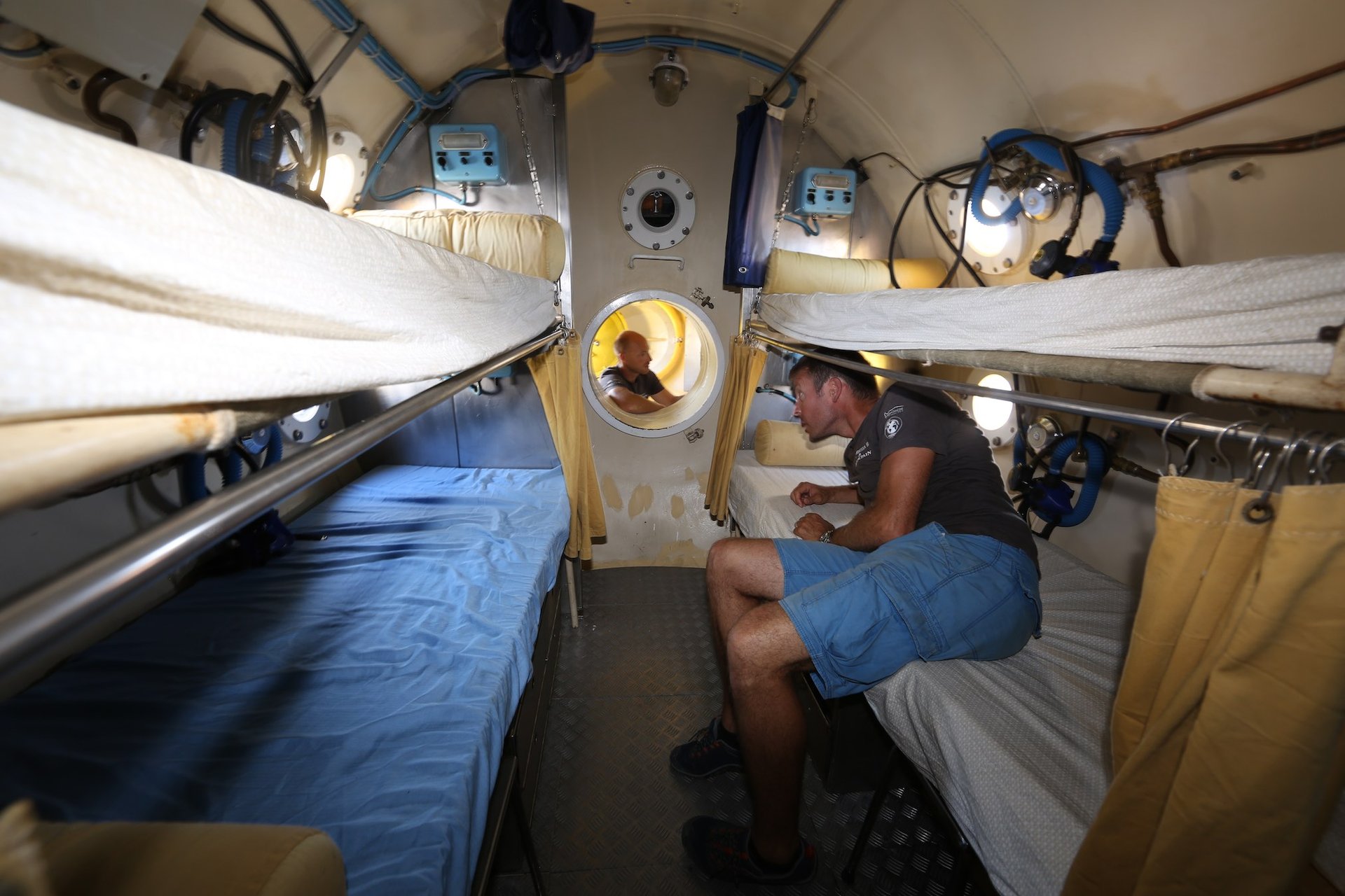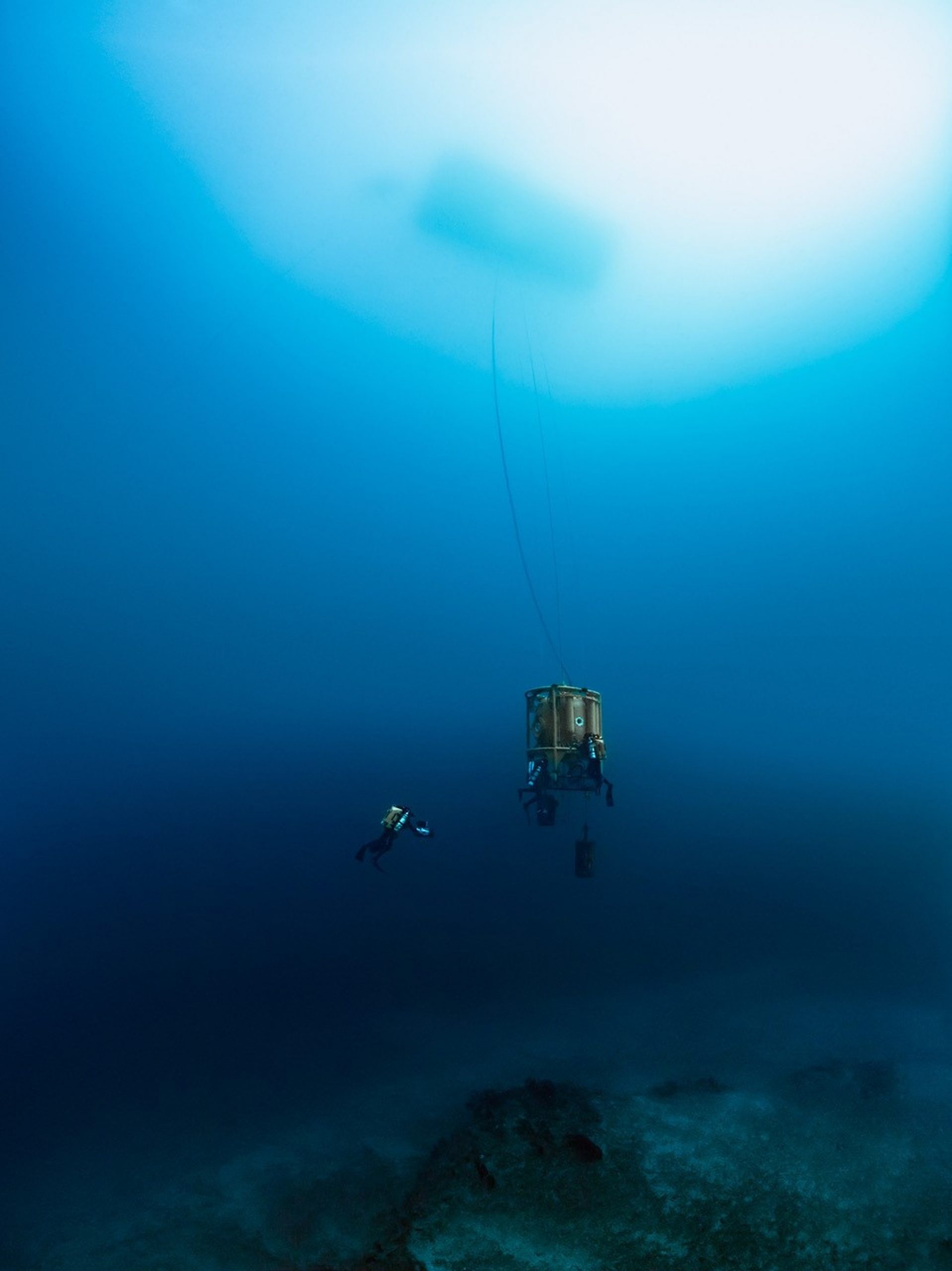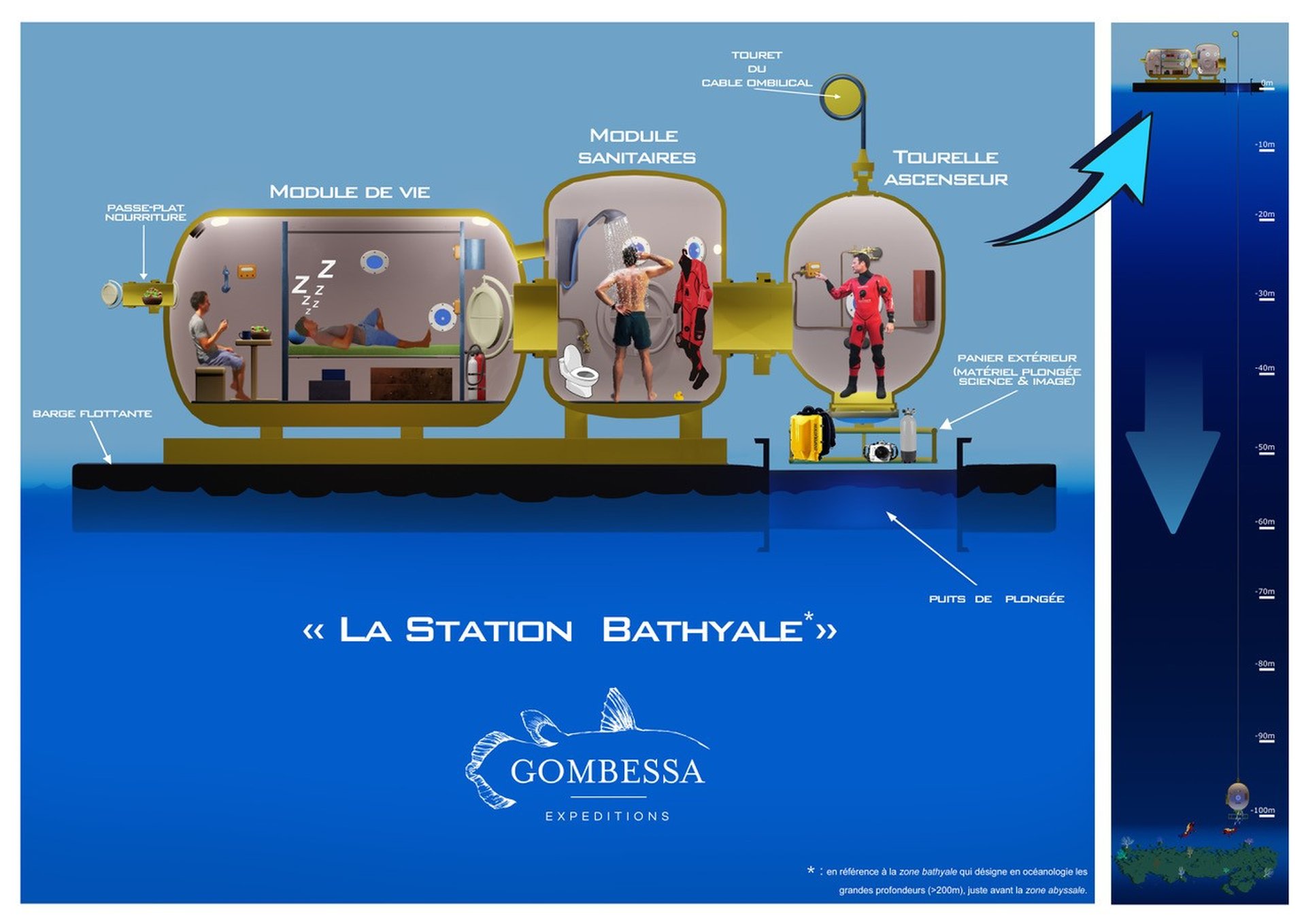 Each Gombessa expedition is characterized by a scientific mystery, a diving challenge and the promise of unprecedented images. Gombessa V is no exception to this rule. In order to allow the time to perform a whole series of scientific protocols commissioned by research centers and to illustrate these deep ecosystems, the Gombessa team has developed a world first: the combination of saturation diving with scuba using closed circuit rebreathers. Saturation diving enables professional divers to work on underwater construction sites by connecting them to the surface with an umbilical that both provides them with respiratory gas and allows them to communicate. The length of time they spend underwater is theoretically unlimited, but they can only move a few meters around the area in which they are working. Scuba diving, as its name suggests, allows free movement, but is characterized by strict time constraints. Indeed, for a few minutes spent at great depth, it is necessary to undergo several hours of decompression in order to avoid any risk of accident. The combination of these two techniques makes it possible for the first time ever to avoid any need for decompression during the expedition and to conduct a single four-day session at the end of the mission. Laurent Ballesta and his three companions will thus be able to perform explorations lasting up to eight hours a day in order to achieve their ambitious objectives.