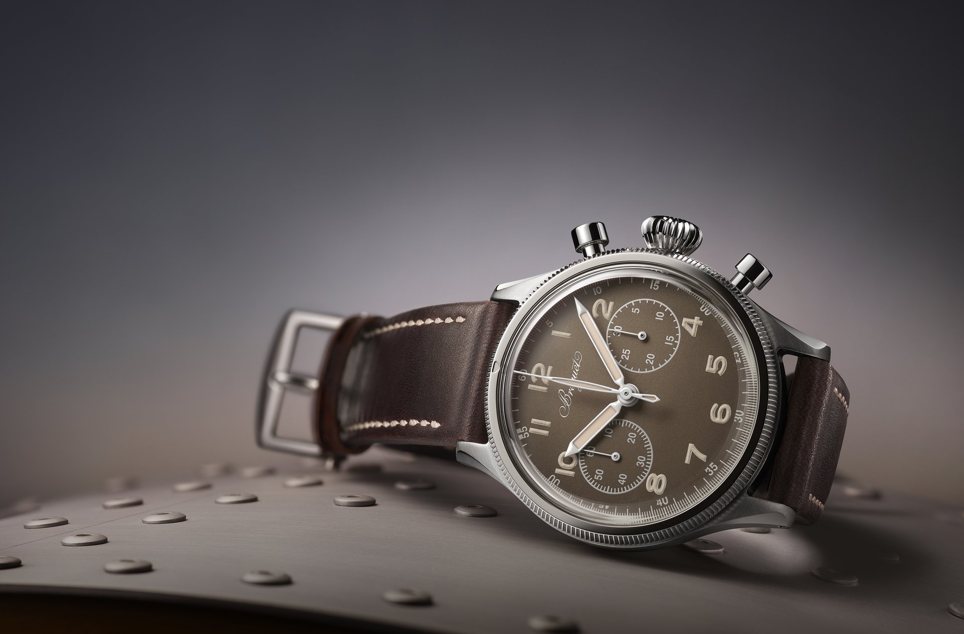 The dial of the watch is inspired by the very rare civilian and military models with a bronze-colored dial sold at the time. Some black dials also took on a shade of bronze after long exposure to the sun. The Type 20 Only Watch 2019 displays small seconds and a 30-minute totalizer. It offers sharp legibility in all conditions and sports the distinctive hands of the historical Type XX watches, which are treated with Super-LumiNova®, as well as the large Arabic numerals. A notable difference between the Type 20 Only Watch 2019 and the Air Force’s historical model is the Breguet signature at 12 o’clock.