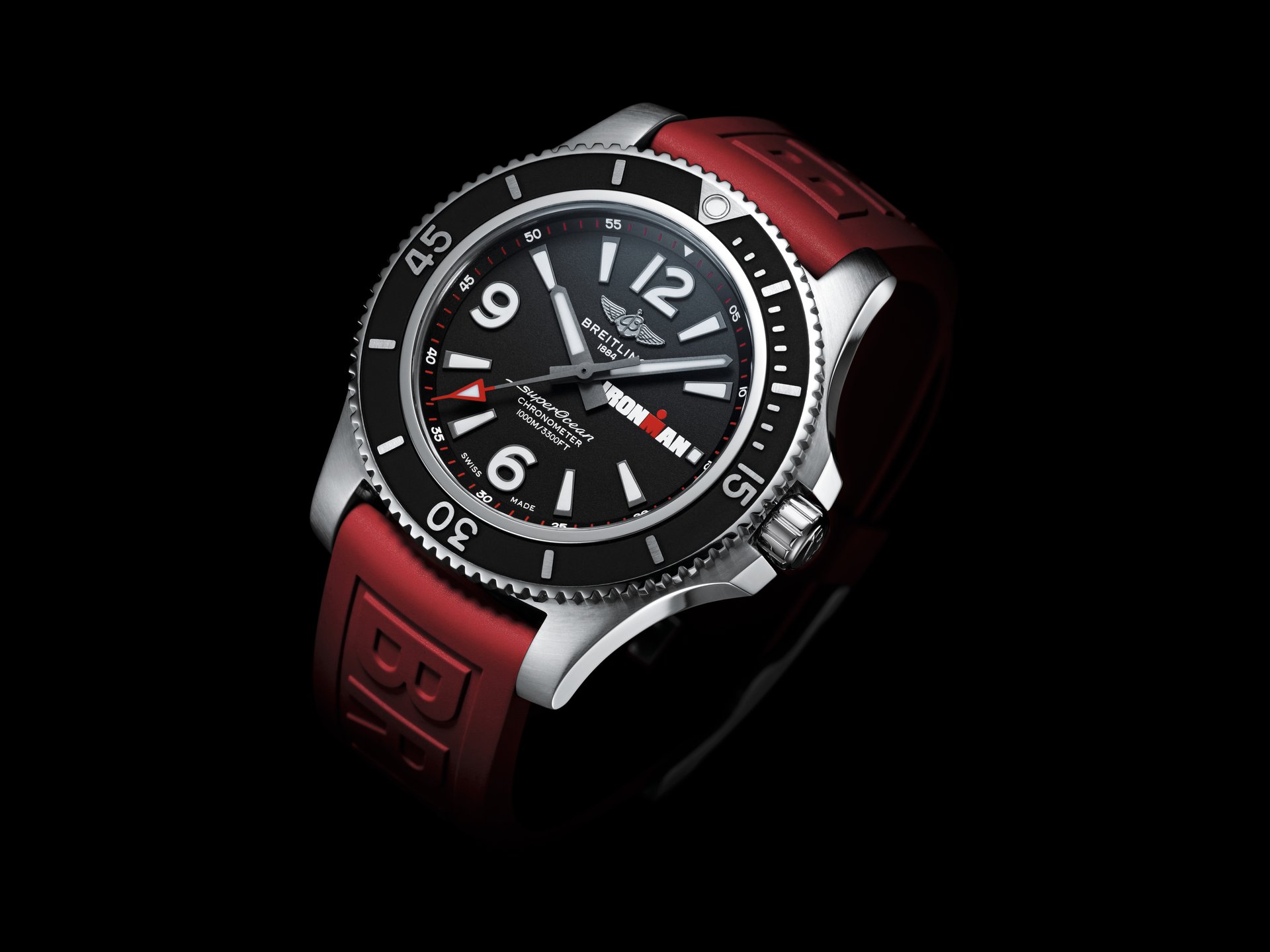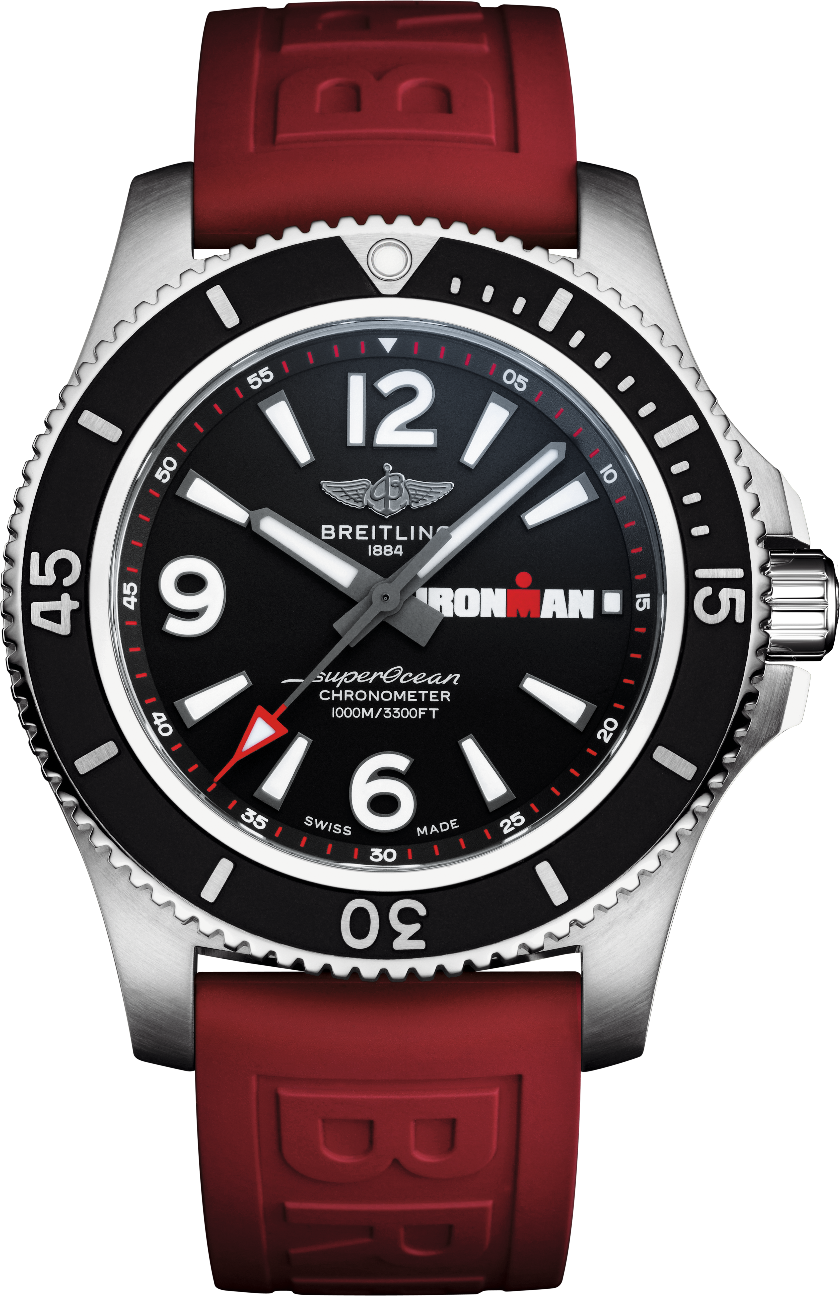 The Breitling Superocean Automatic 44 IRONMAN® Limited Edition, which celebrates the partnership with IRONMAN and its events, is a member of Breitling’s popular family of Superocean divers’ watches. It has a 44-millimeter stainless-steel case and a black dial featuring the unmistakable IRONMAN® logo. It is presented on a red Diver Pro III rubber strap with a pin buckle. Its ratcheted unidirectional rotating bezel is an essential feature for divers as it can be used to track the elapsed time underwater.