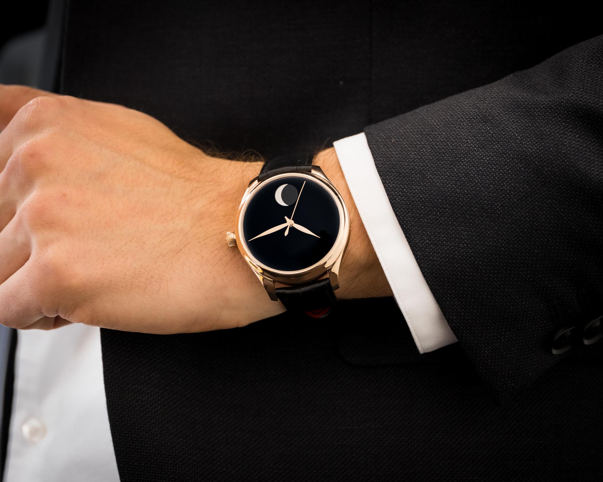 Within the 5N red gold case of the Endeavour Perpetual Moon Concept Only Watch beats the HMC 801 hand-wound Manufacture movement, equipped with the interchangeable Moser escapement. This calibre ensures the watch has a minimum 7-day power reserve, with an indicator on the movement side. The moon phase system is an extremely precise display that can be set to within a minute. A perpetual moon, the Endeavour Perpetual Moon Concept Only Watch is one of the most precise moon phases available, with one day’s deviation every 1027 years.