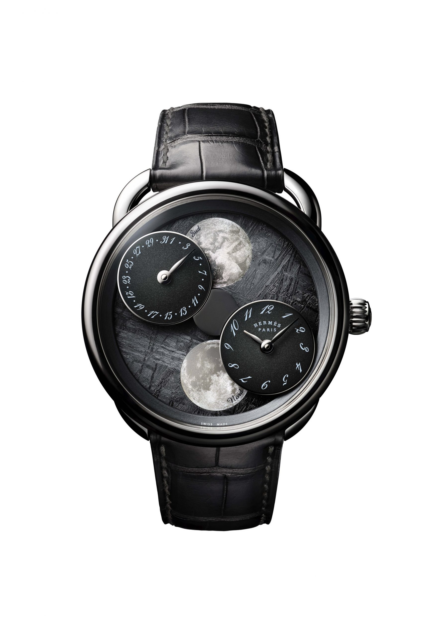 Within this space-time, metal, stars and rock seamlessly merge the watch exterior with the movement to form an unprecedented technical and aesthetic display of simple and graphic readability. The double moon here eclipses a traditional aperture-type display, instead covering the entire surface of the dial. The result is a free-spirited and impertinent vision of mechanical watchmaking according to Hermès. The Arceau case with its asymmetrical lugs, designed by Henri d’Origny in 1978, becomes a lunar crater made of meteorite stone, while the lacquered dials, gravitating like satellites, display Arabic numerals with a distinctive sloping font. This unique Haute Horlogerie timepiece is f itted with a matt alligator strap in graphite grey with a blue zephyr calfskin.