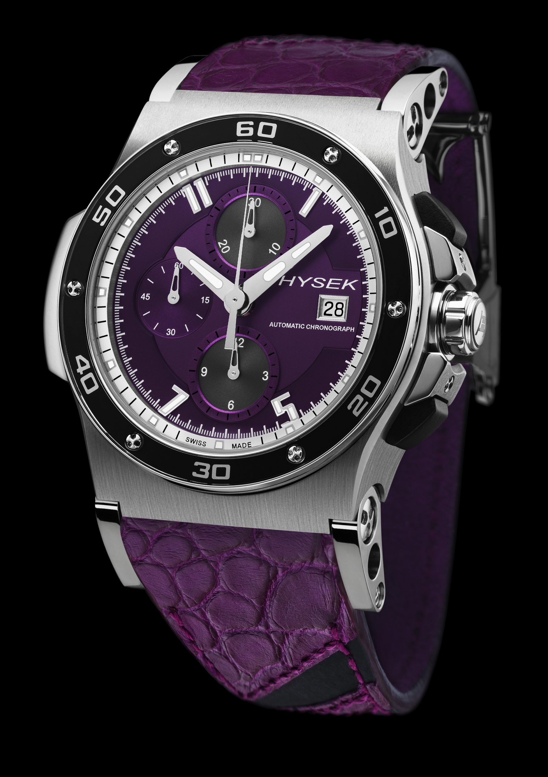 Dressed « sur mesure » of purple and black, all in elegance, this chronograph tends to impose itself as a staple in the men’s wardrobe. Last visible colour of the chromatic spectrum, the violet is here associated with black, for a rendering that offers a deep and inspired perception. The bracelet here offers an original composition, alternating between alligator and calf.