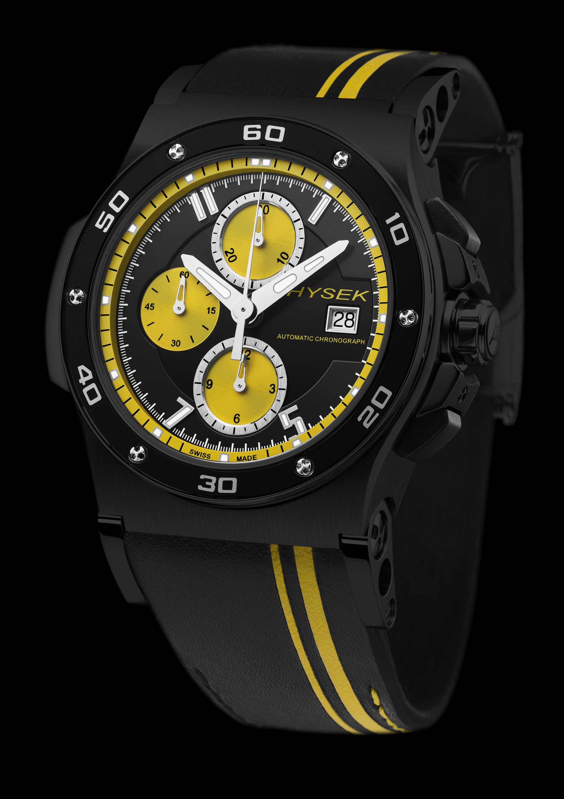 Black and yellow, this new combination is inspired by powerful and nerve-shifting sports. The double yellow marking line is made of veal marquetry. Unique and highly specialized technique consisting in assembling very carefully different pieces of leather according to a precise and seamless pattern. This technique is at the service of a contemporary approach confirming the taste of Hysek for the diversion of know-how to its DNA. The colour code is then transferred to the dial, reinforcing the sporty look of the piece.