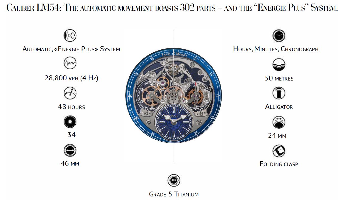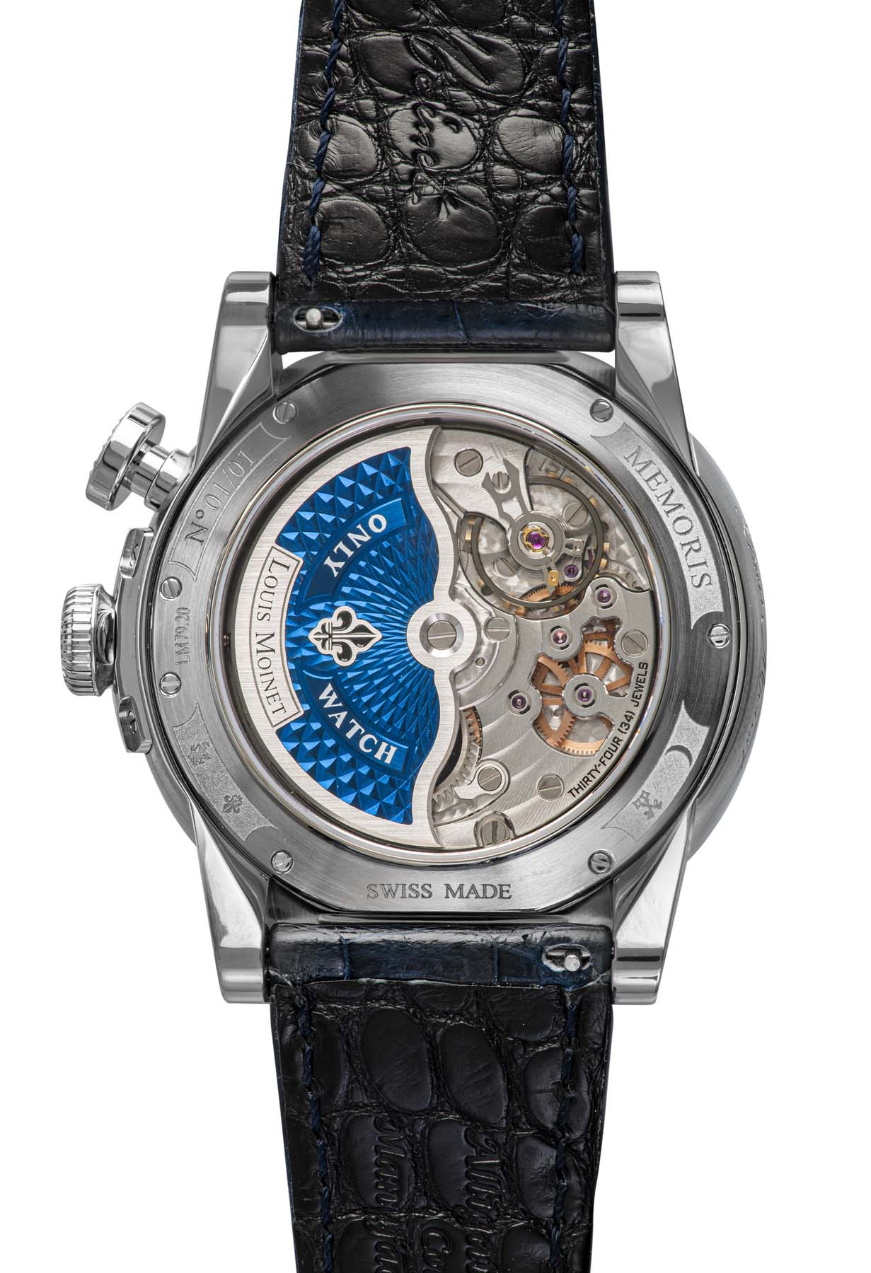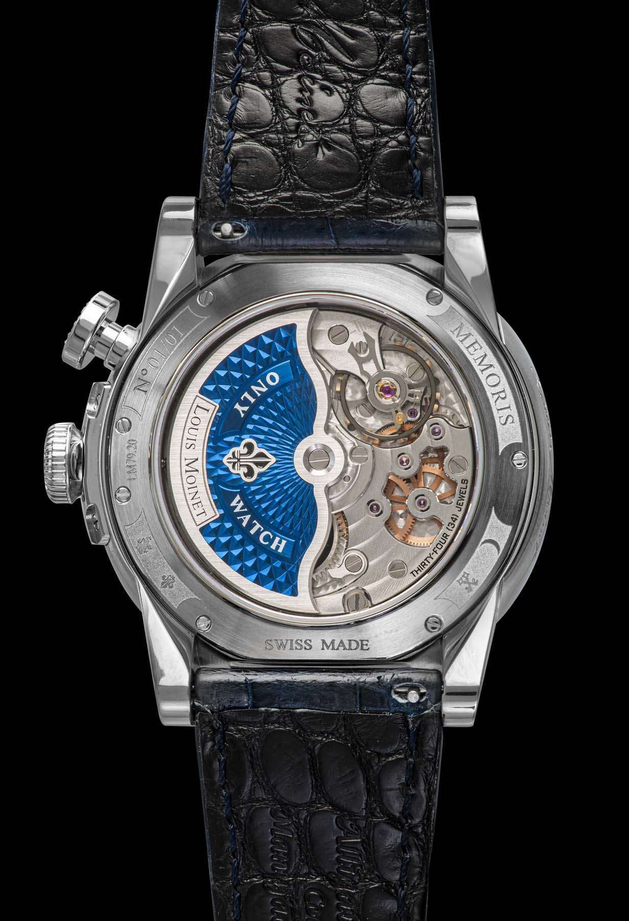 The case is made from polished titanium and bears the authentic Louis Moinet signature on the caseband. The entire back of the movement can be seen through a sapphire caseback, with “N°01/01” engraved around it. The watch is wound using an oscillating weight, decorated with a lacquered blue concentric Clou de Paris pattern and engraved with the words “ONLY WATCH”.