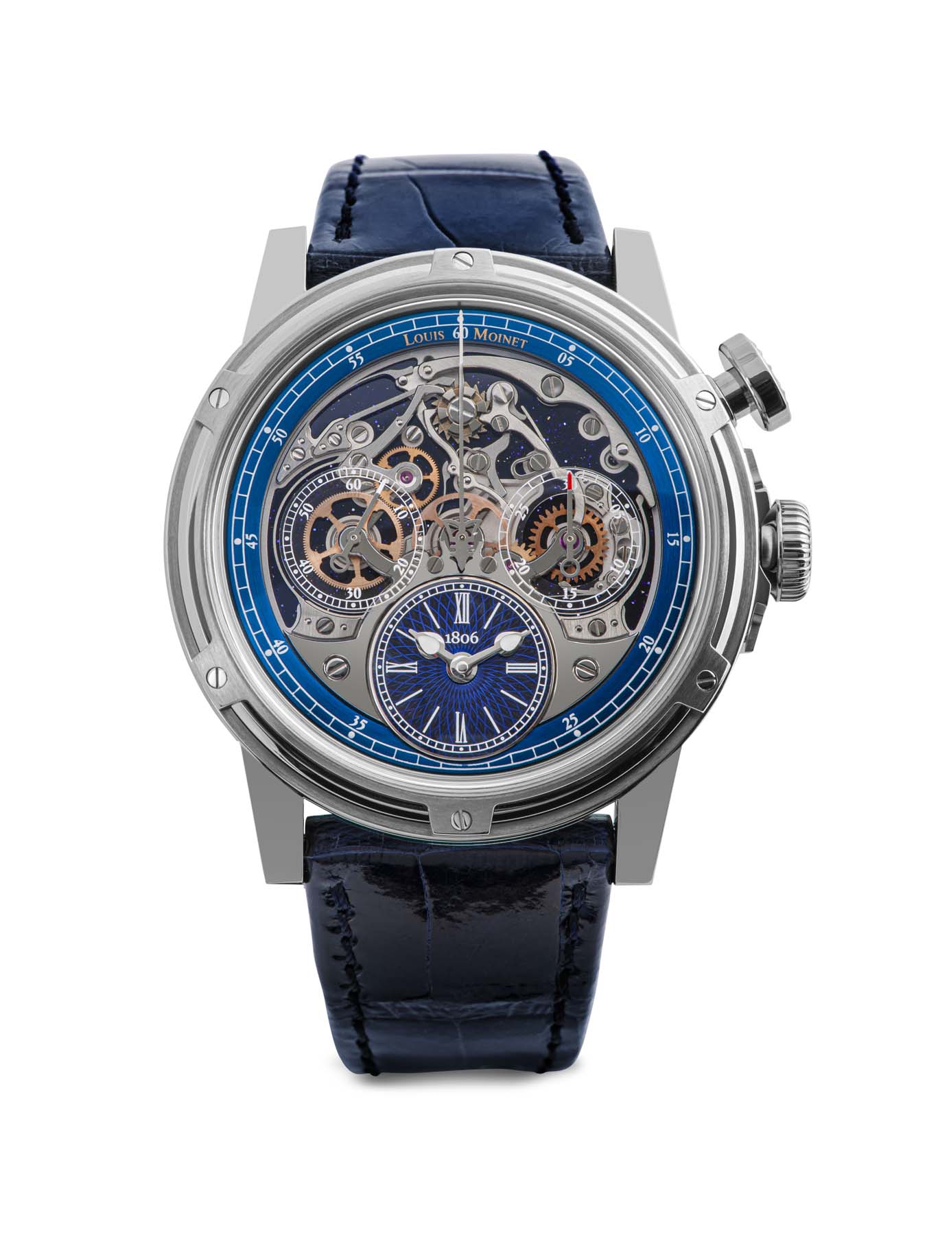 The Louisiana alligator strap and alligator lining are hand-sewn; the strap is fitted with a clasp bearing Louis Moinet’s fleur de lys emblem.