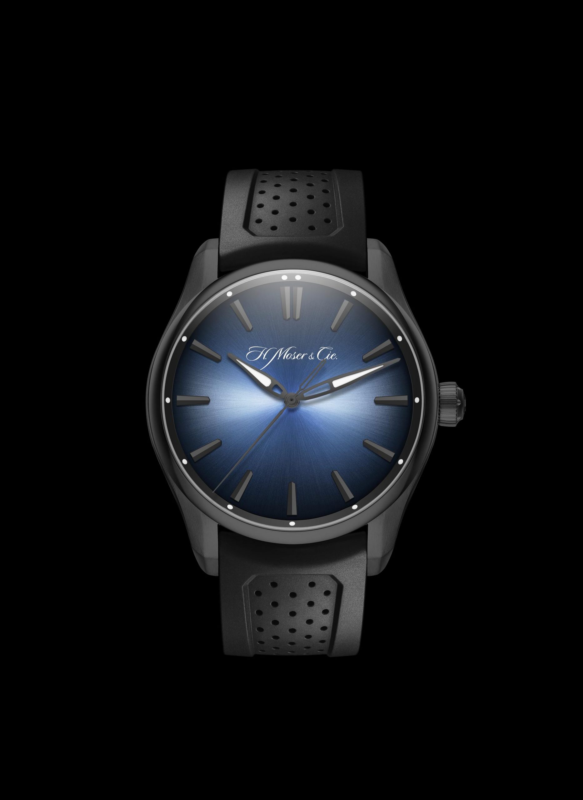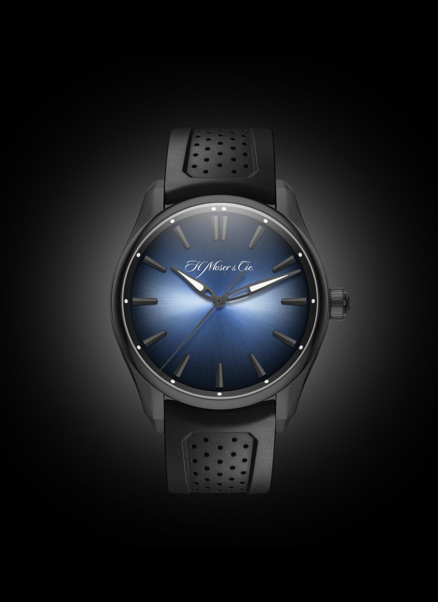 H. Moser & Cie. has encased their all-terrain model, the Pioneer, with a layer of DLC (Diamond-Like-Carbon) in pitch black. Under the domed sapphire crystal sits an iconic Moser fumé dial in stunning Funky Blue – a first for the Pioneer collection. The hour markers and hands, in luminescent Superluminova®, glimmer like stars in the night sky.