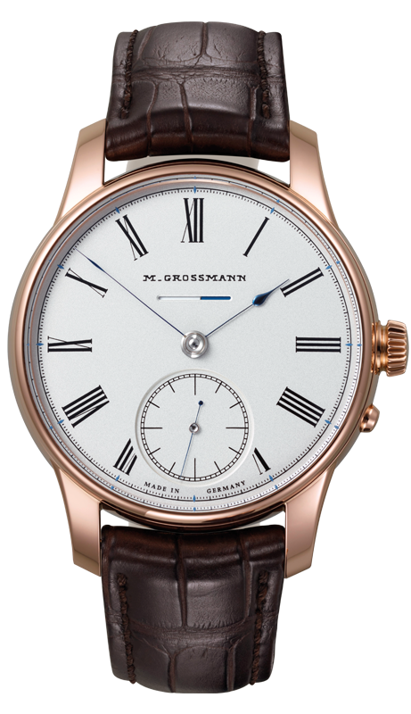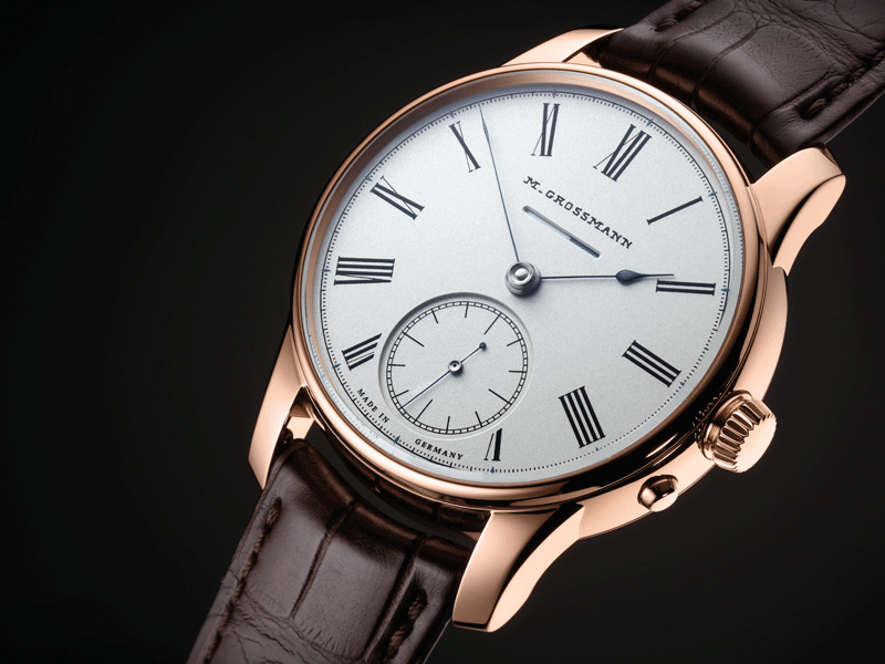 Finely crafted Roman numerals in black and the original logo featuring the ‘M. GROSSMANN’ typography from 1875 grace the dial paying tribute to the master, as he was respectfully called in Glashütte.