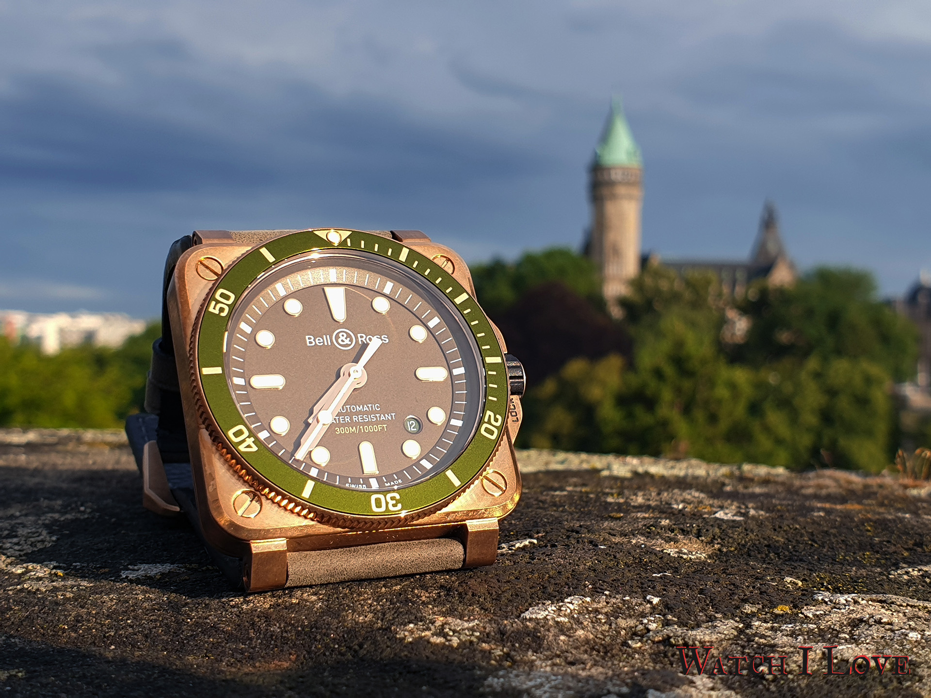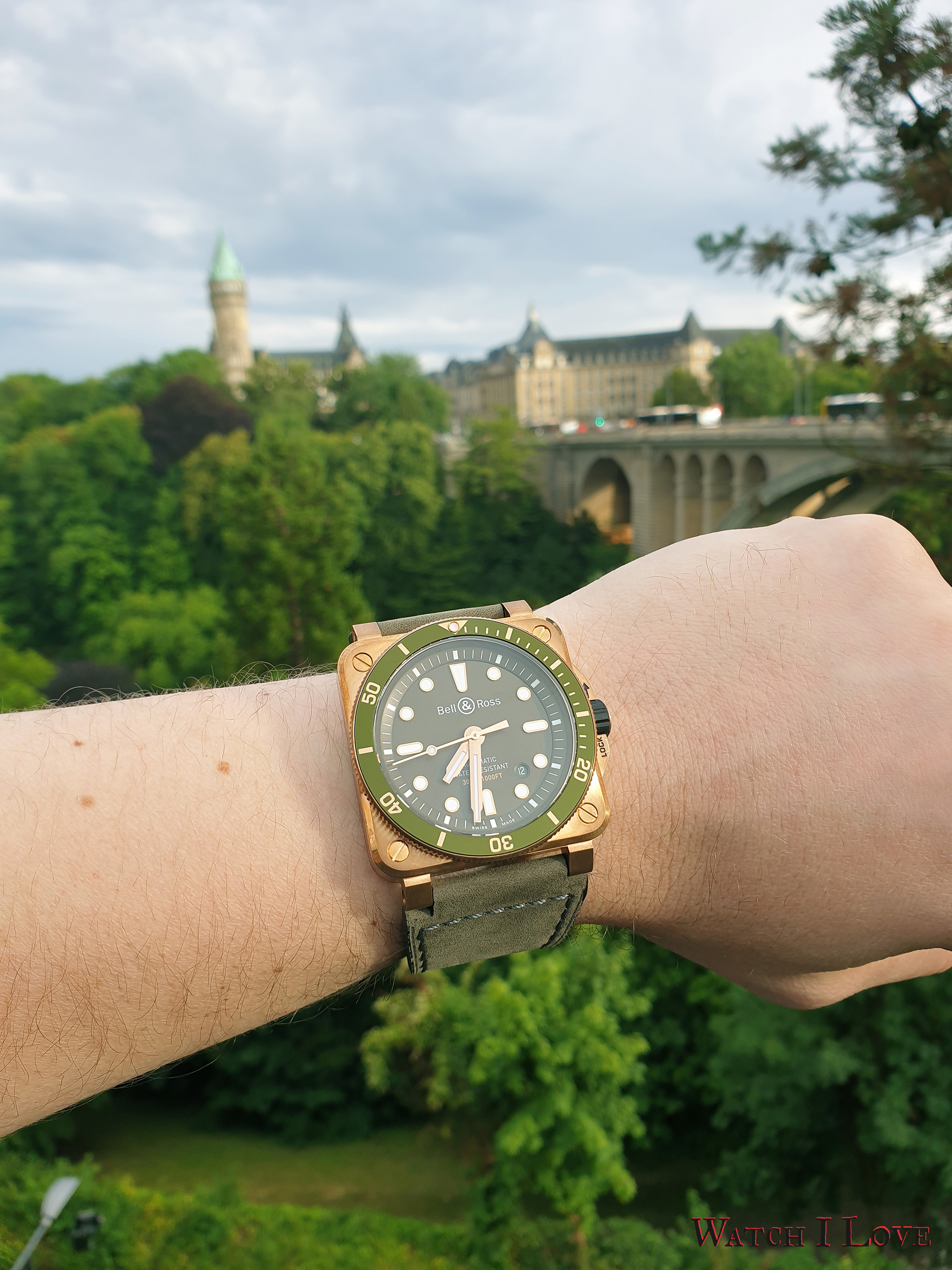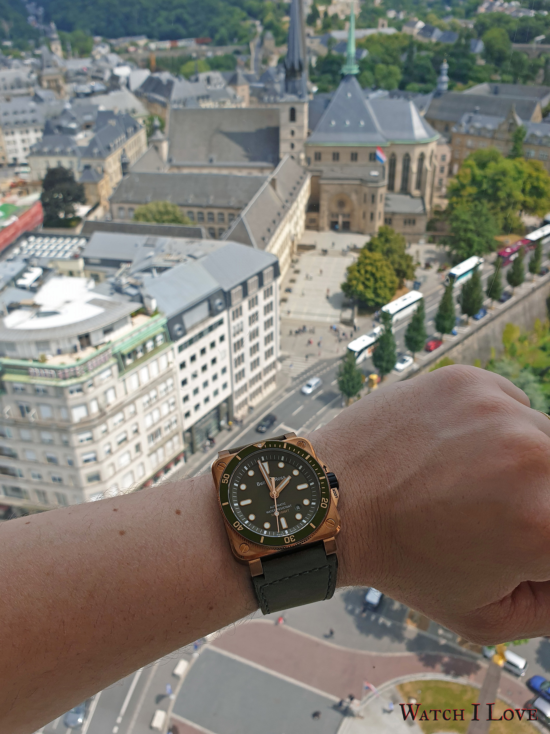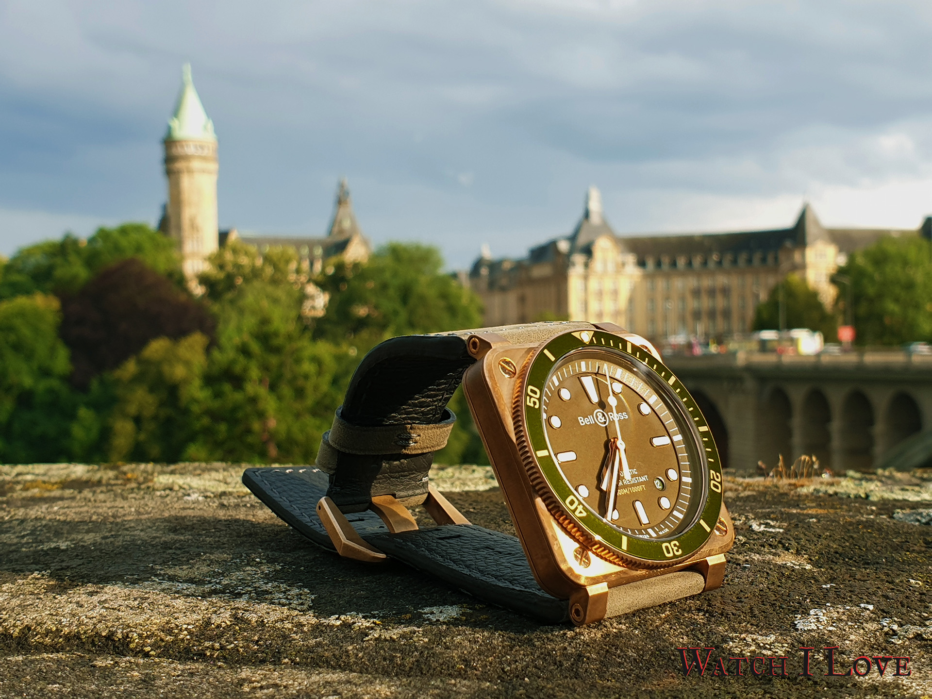 I reviewed last week the Bell & Ross BR03-92 Green Bronze Diver. That was the descriptive part of the review. Today, I want to present you a photographic review of the diver. The piece was a loan from Bell & Ross, the No. 441 of 999. The diver has joined me and my wife on a long weekend to Luxembourg. The most complex work that the Green Bronze Diver had to do is to stay on my wrist and to accept my photographic experiments. Some of the images are done with my phone, a Samsung S9plus since I forgot the camera in the car several times. These are my experiments and some comments.