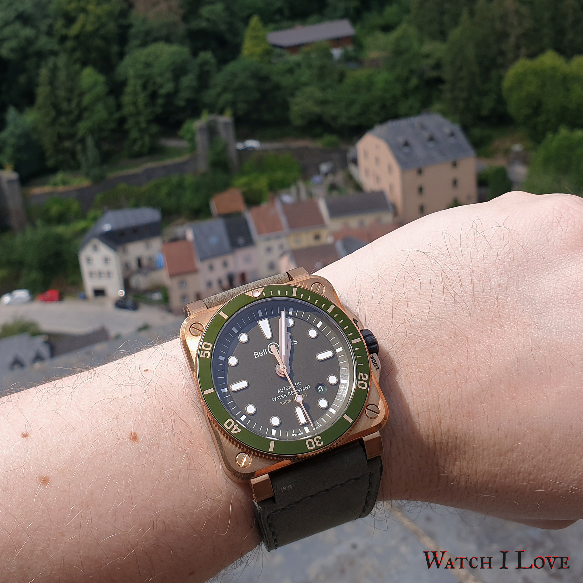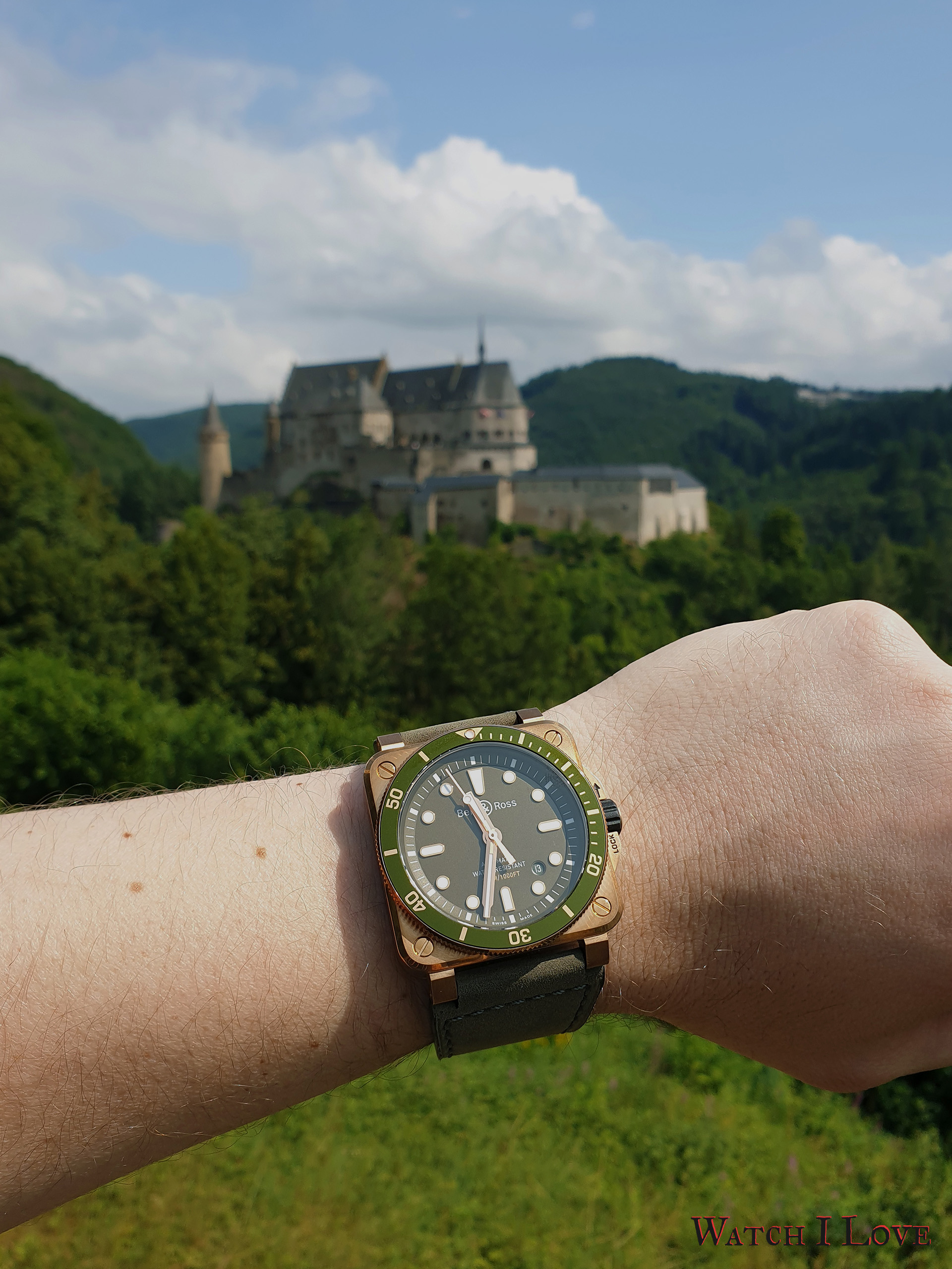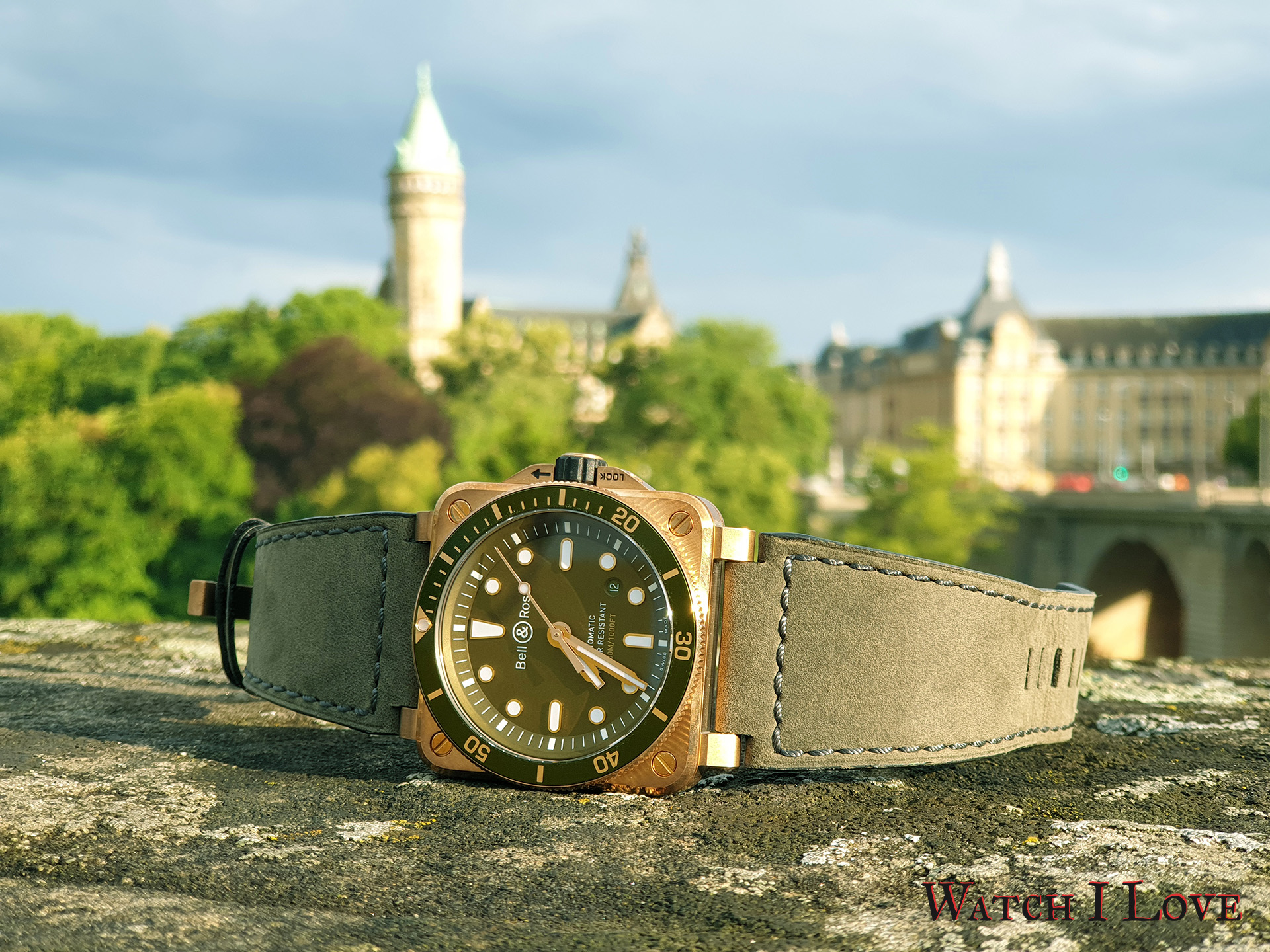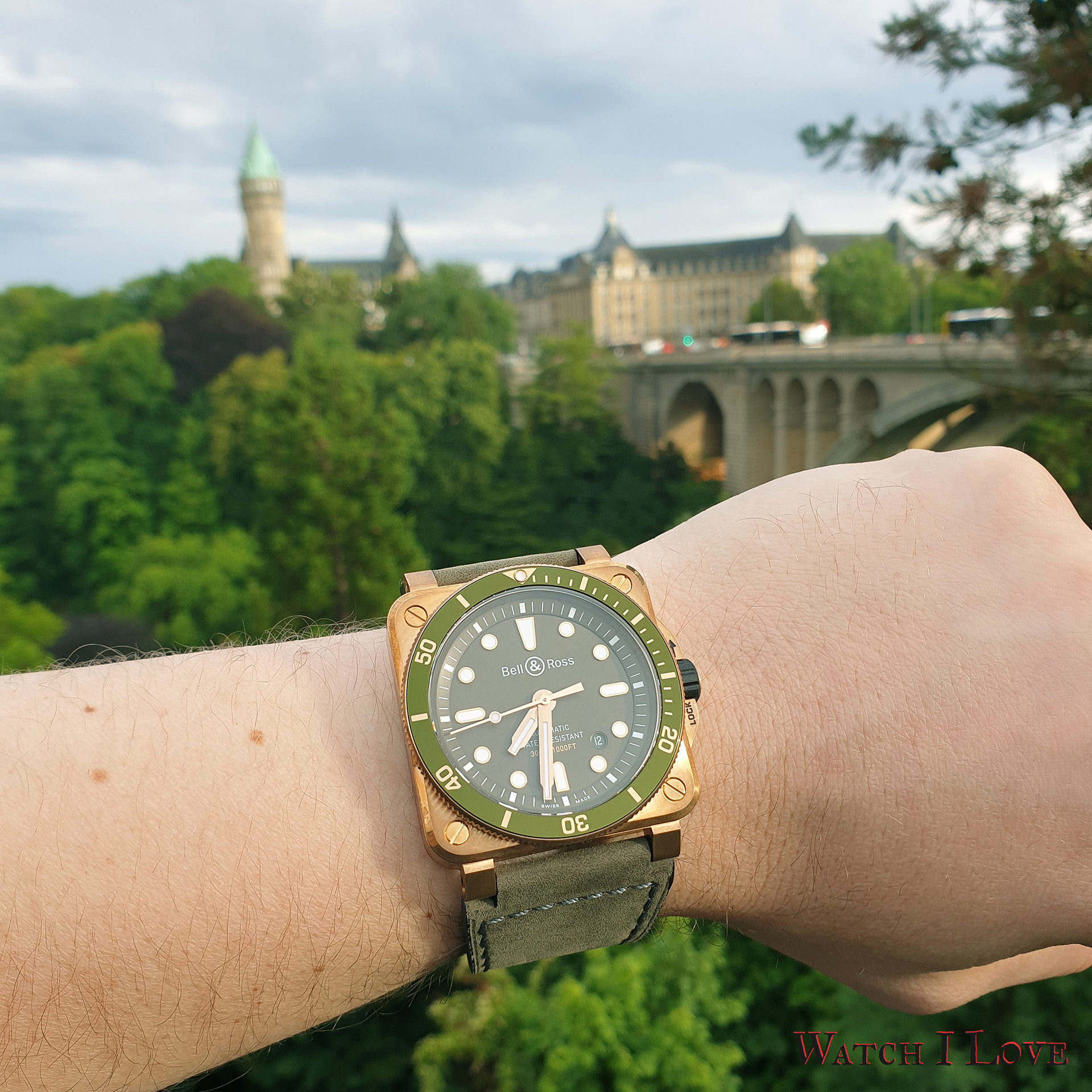 I reviewed last week the Bell & Ross BR03-92 Green Bronze Diver. That was the descriptive part of the review. Today, I want to present you a photographic review of the diver. The piece was a loan from Bell & Ross, the No. 441 of 999. The diver has joined me and my wife on a long weekend to Luxembourg. The most complex work that the Green Bronze Diver had to do is to stay on my wrist and to accept my photographic experiments. Some of the images are done with my phone, a Samsung S9plus since I forgot the camera in the car several times. These are my experiments and some comments.