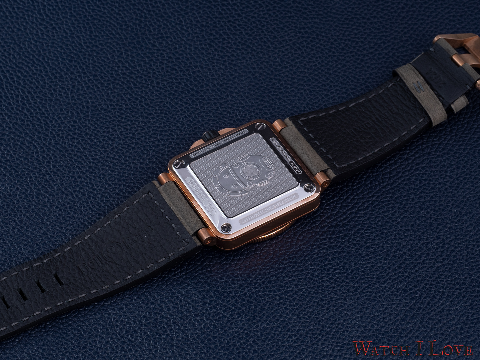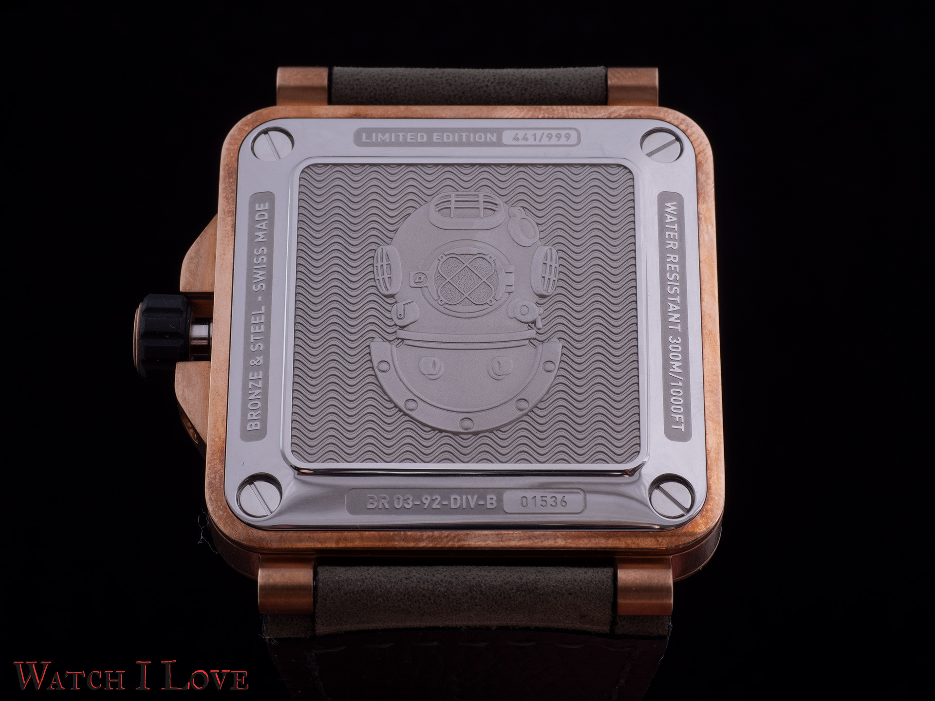 The stainless steel case back is lovely decorated with an engraving of a bronze diver helmet, specific to the driving gear of the 1940s. The decorations include the limited edition number, the serial number, case materials and water resistance capabilities.