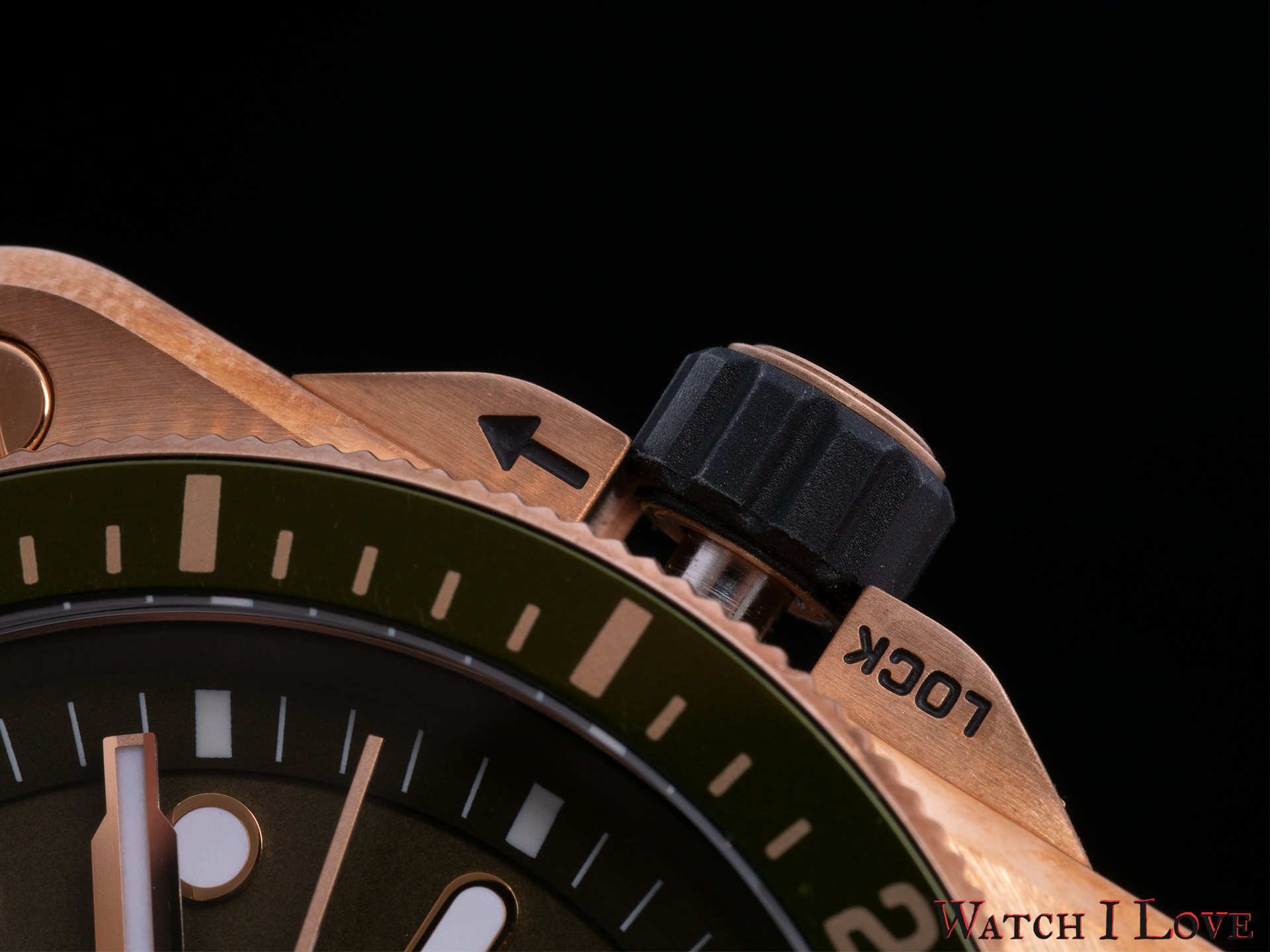 The bronze bezel with green anodised aluminium insert is decorated with a 60-minute scale. Interesting that the scale is continued up the 20th minute, instead of just up to the 15th minute. The uni-directional bezel feels nice and solid. It has a nice clicking sound. See the video above.