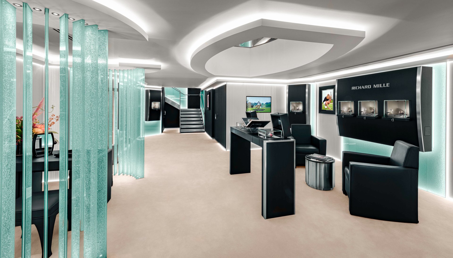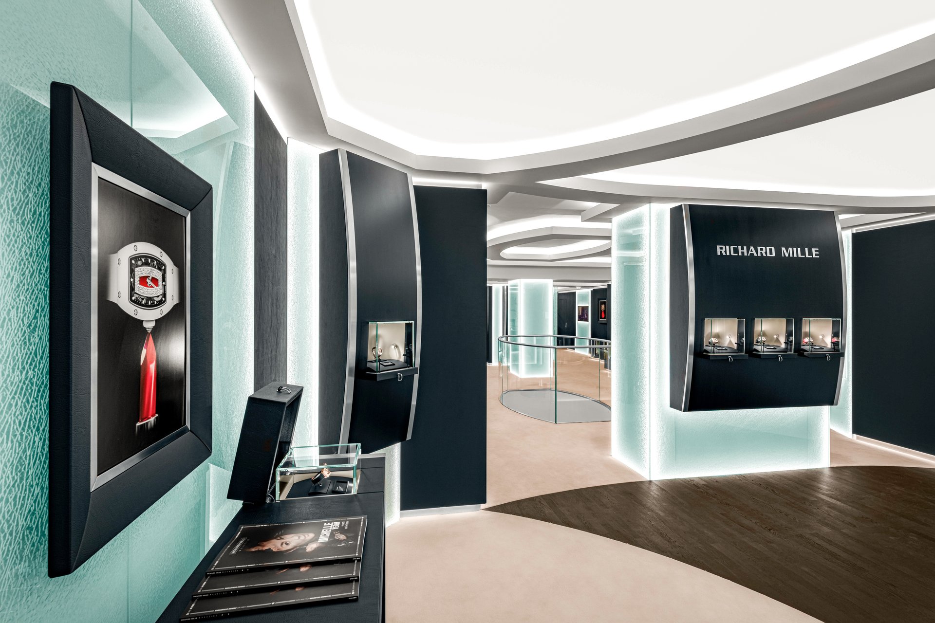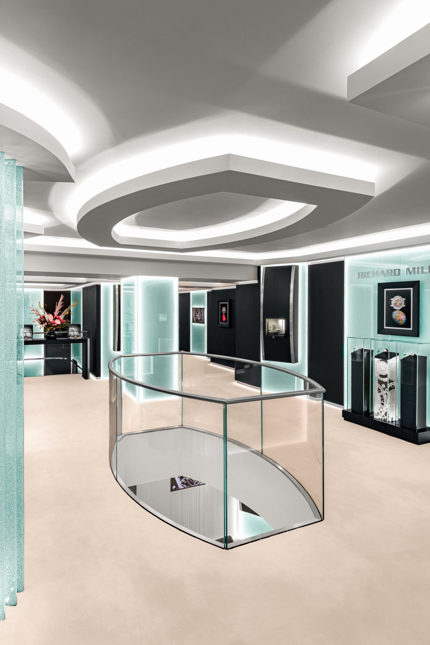On the ground floor, guests can watch the in-house watchmaker at his glass-enclosed, dust-free workplace. A tonneau-shaped atrium on the lower floor offers a view of the VIP lounge, which aims to provide customers with a well-stocked, walk-in wine cellar and cigar room for a most enjoyable and laid-back boutique experience. Other classic brand elements include the collection of selected art books of the Éditions Cercle d’Art, the Parisian publishing house of Picasso and Braque, which belongs to the Richard Mille Group.