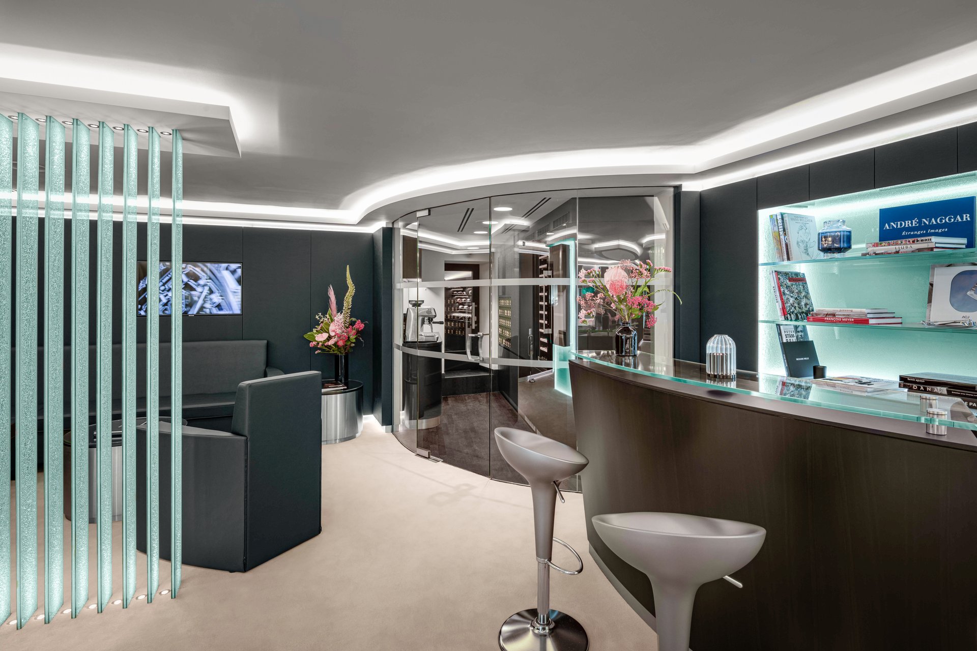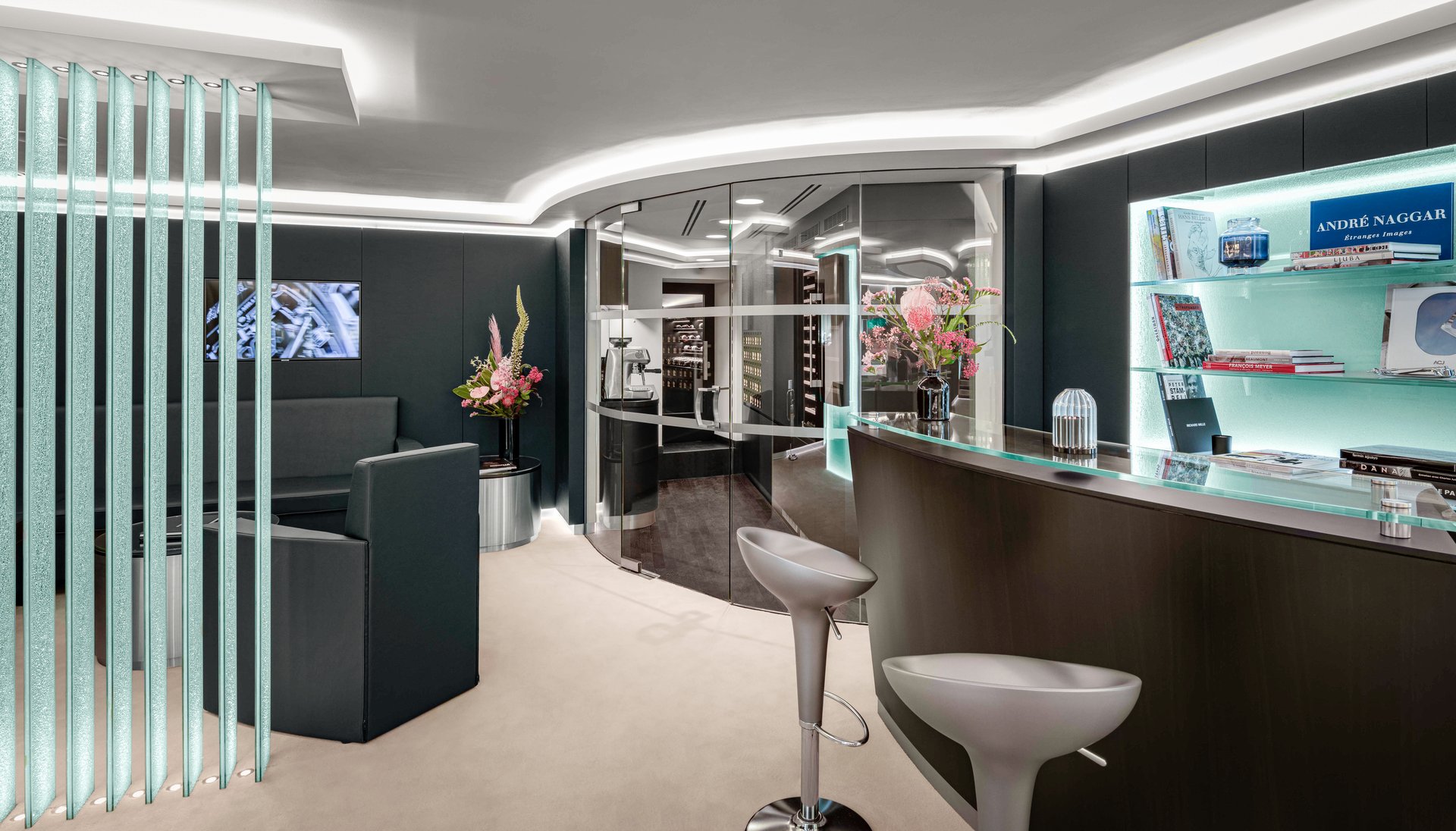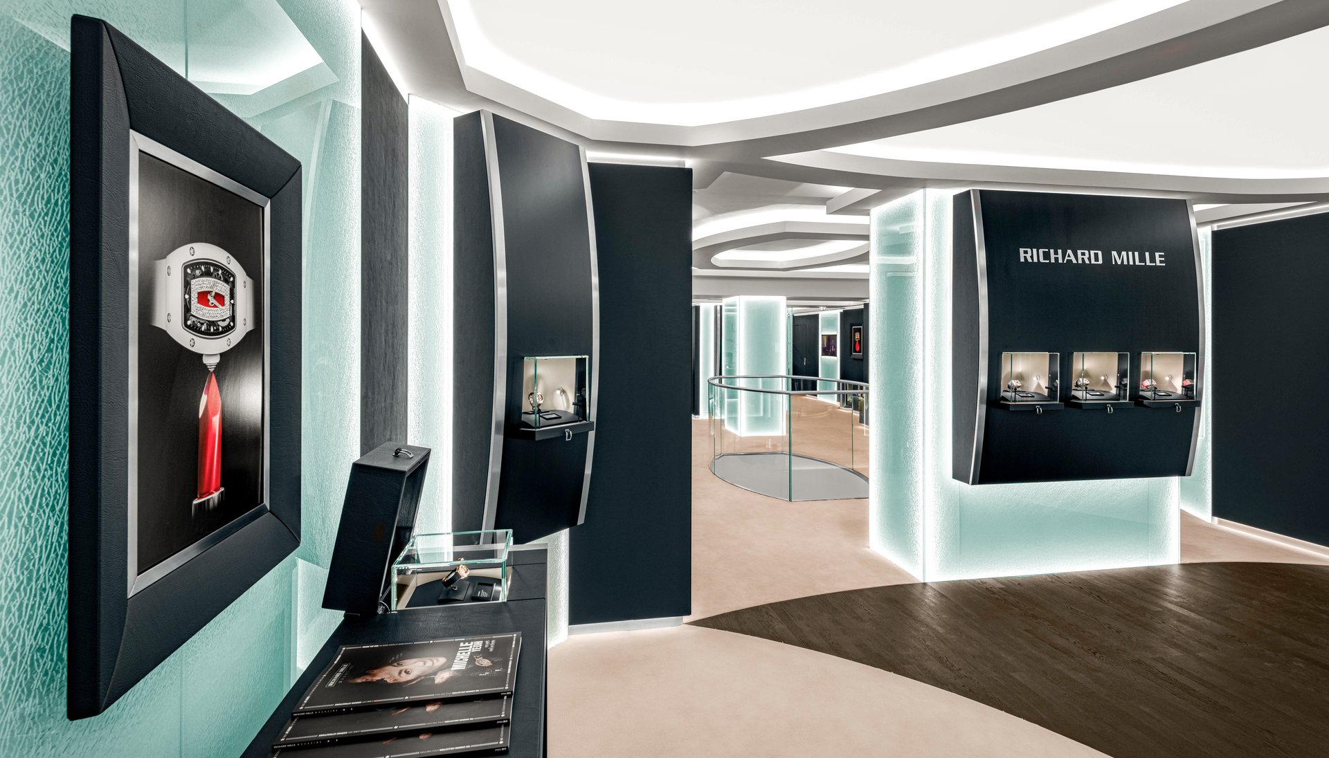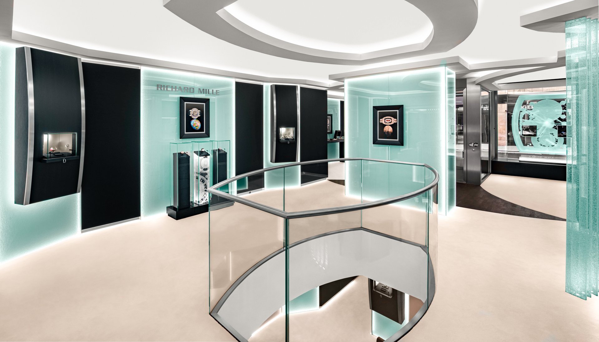 On the ground floor, guests can watch the in-house watchmaker at his glass-enclosed, dust-free workplace. A tonneau-shaped atrium on the lower floor offers a view of the VIP lounge, which aims to provide customers with a well-stocked, walk-in wine cellar and cigar room for a most enjoyable and laid-back boutique experience. Other classic brand elements include the collection of selected art books of the Éditions Cercle d’Art, the Parisian publishing house of Picasso and Braque, which belongs to the Richard Mille Group.