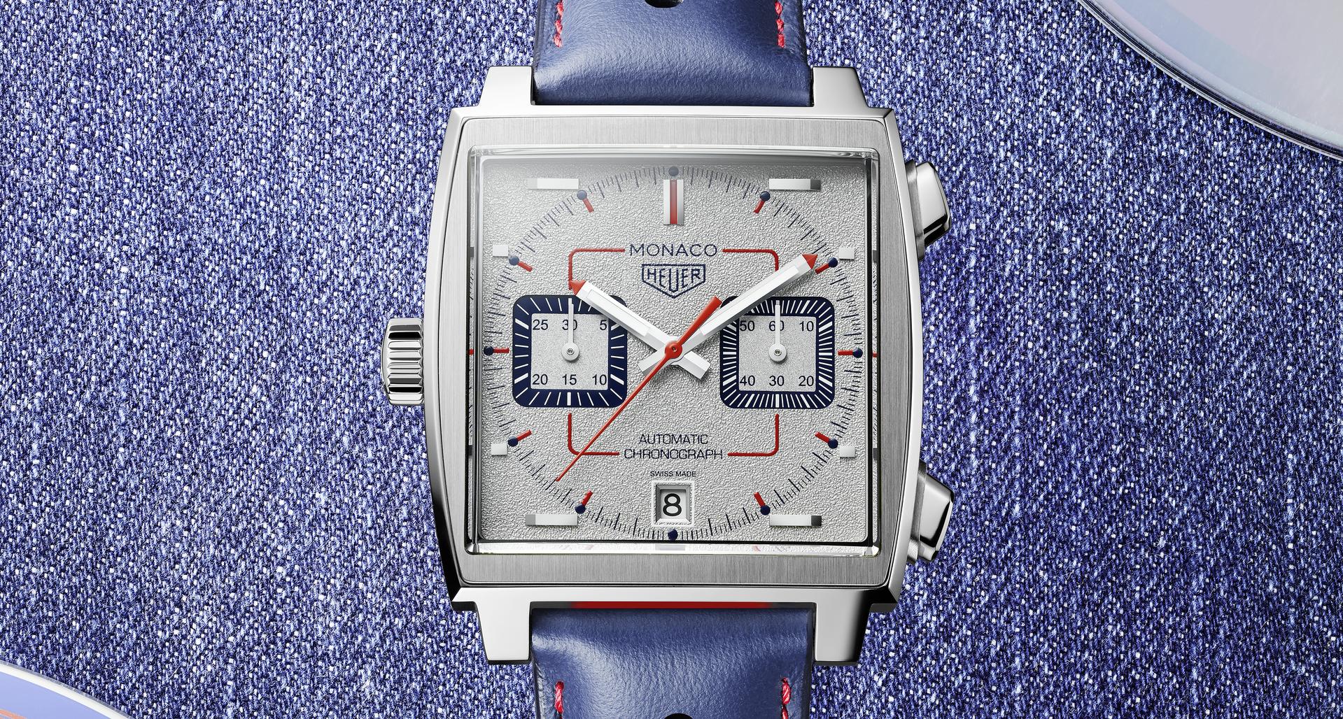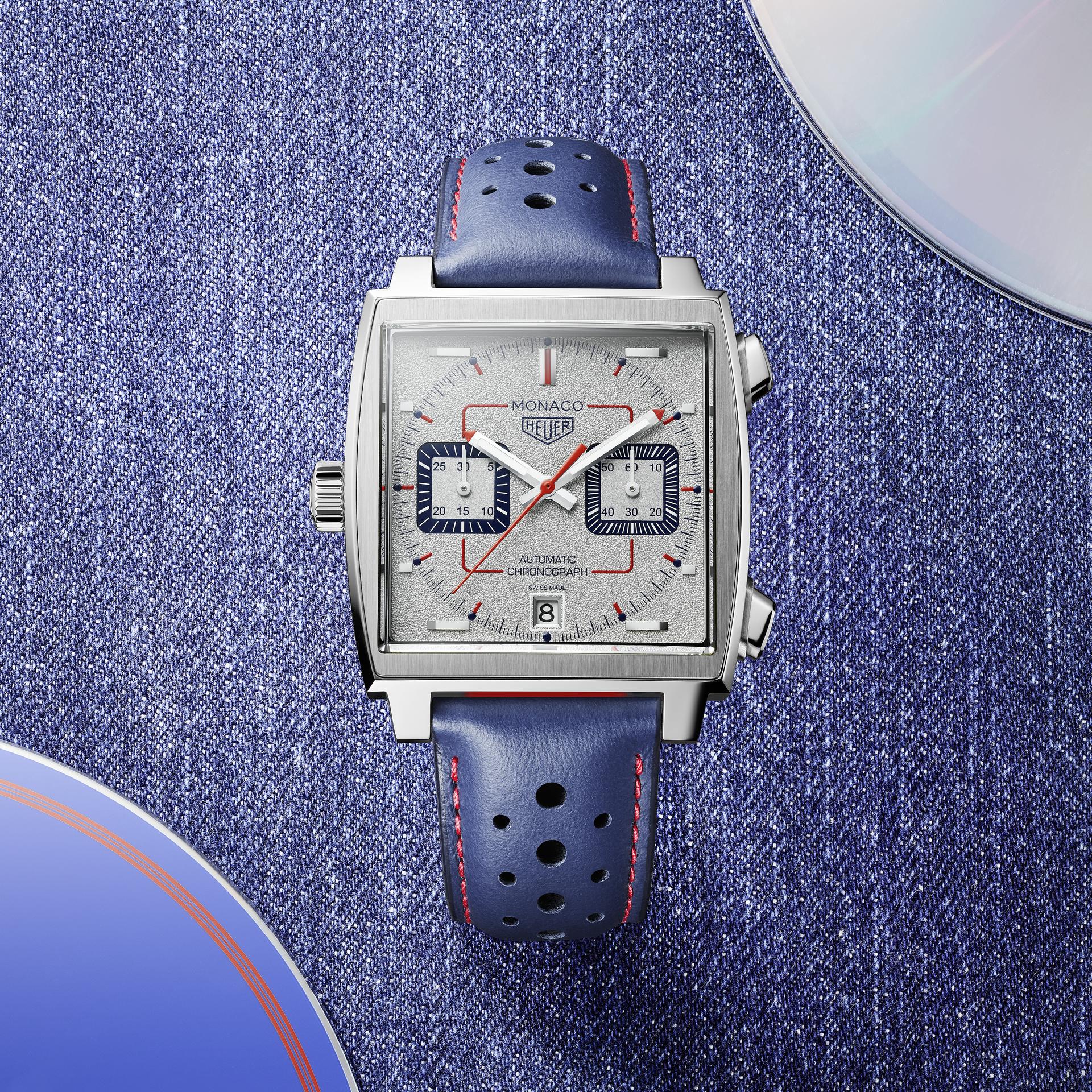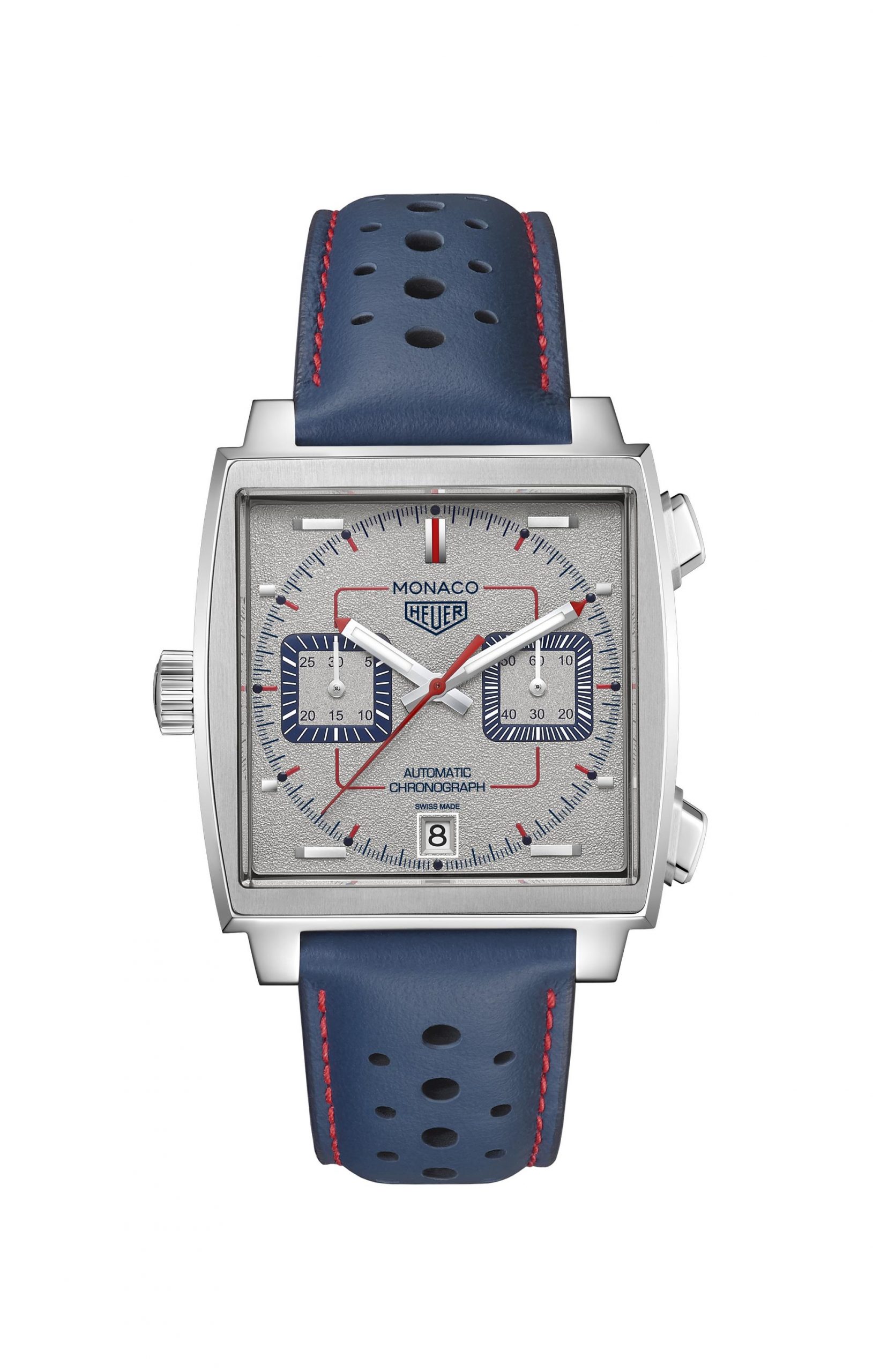 The third of five limited-edition tributes to the Monaco takes its inspiration from the themes, styles and trends of the 1990s. With a steely industrial appearance reflecting the straightforward street style characteristic of this beloved decade, this special collector’s edition features a blue and silvery appearance with dynamic red elements. The stainless-steel square chronograph has a grained rhodium-plated dial with sandblasted subdials featuring blue counters. The flange and Heuer logo are in blue, and the indexes and central seconds hand are red. The blue of the Heuer logo and minute and second scales counters provides a bold contrast to the red touches on the hands and indexes and the red motif featured on the dial. This colour scheme continues with the blue perforated calfskin strap with red stitching.