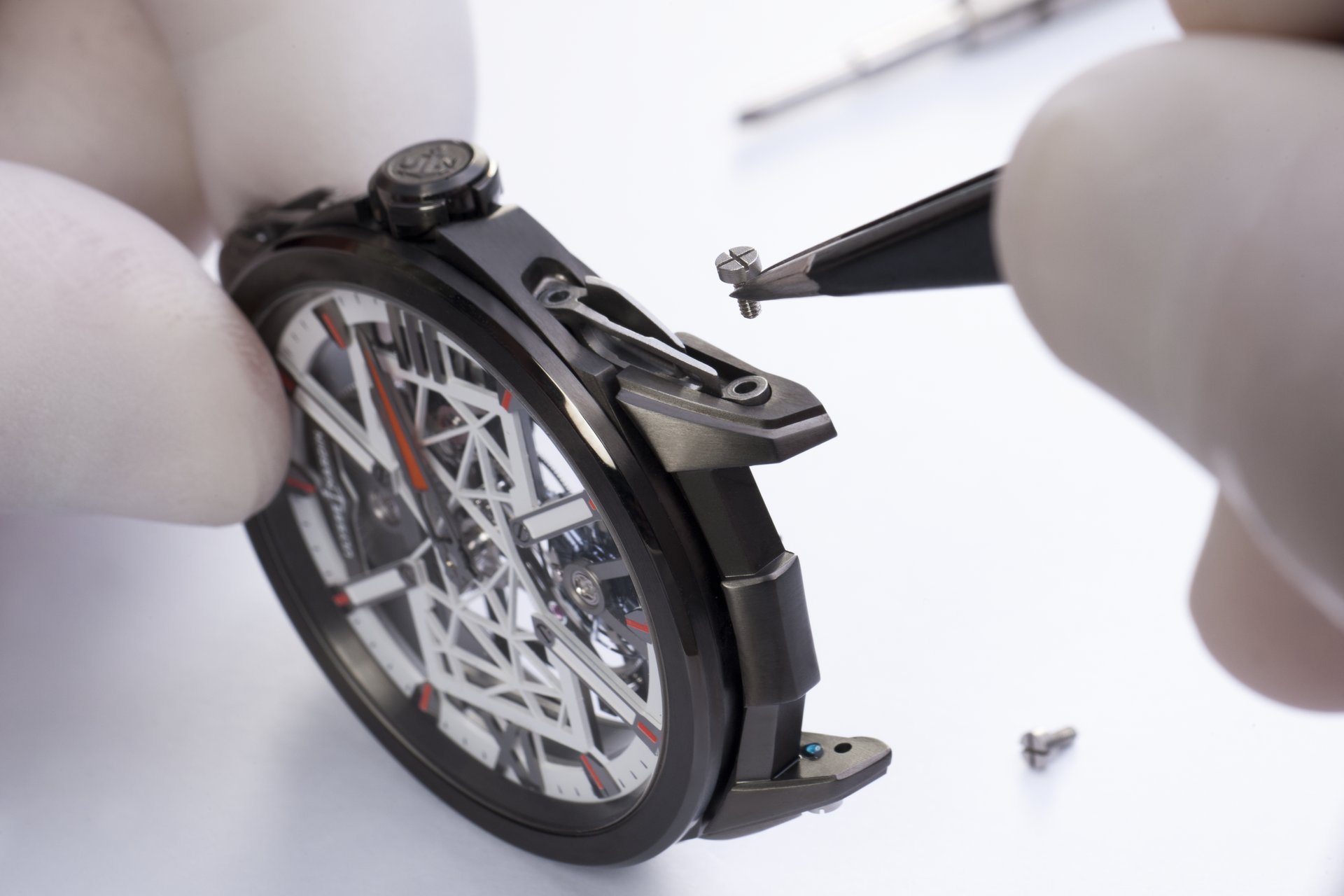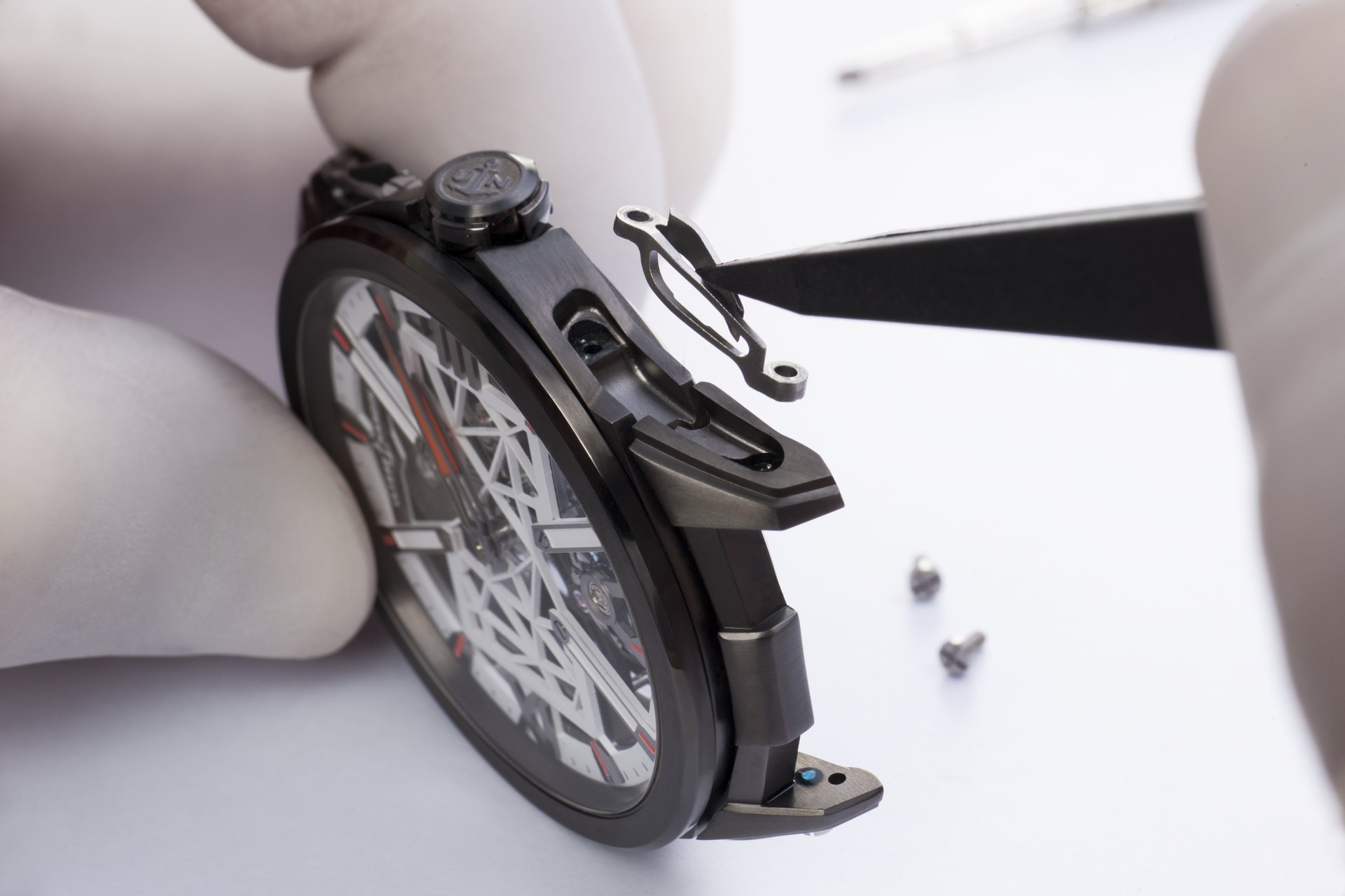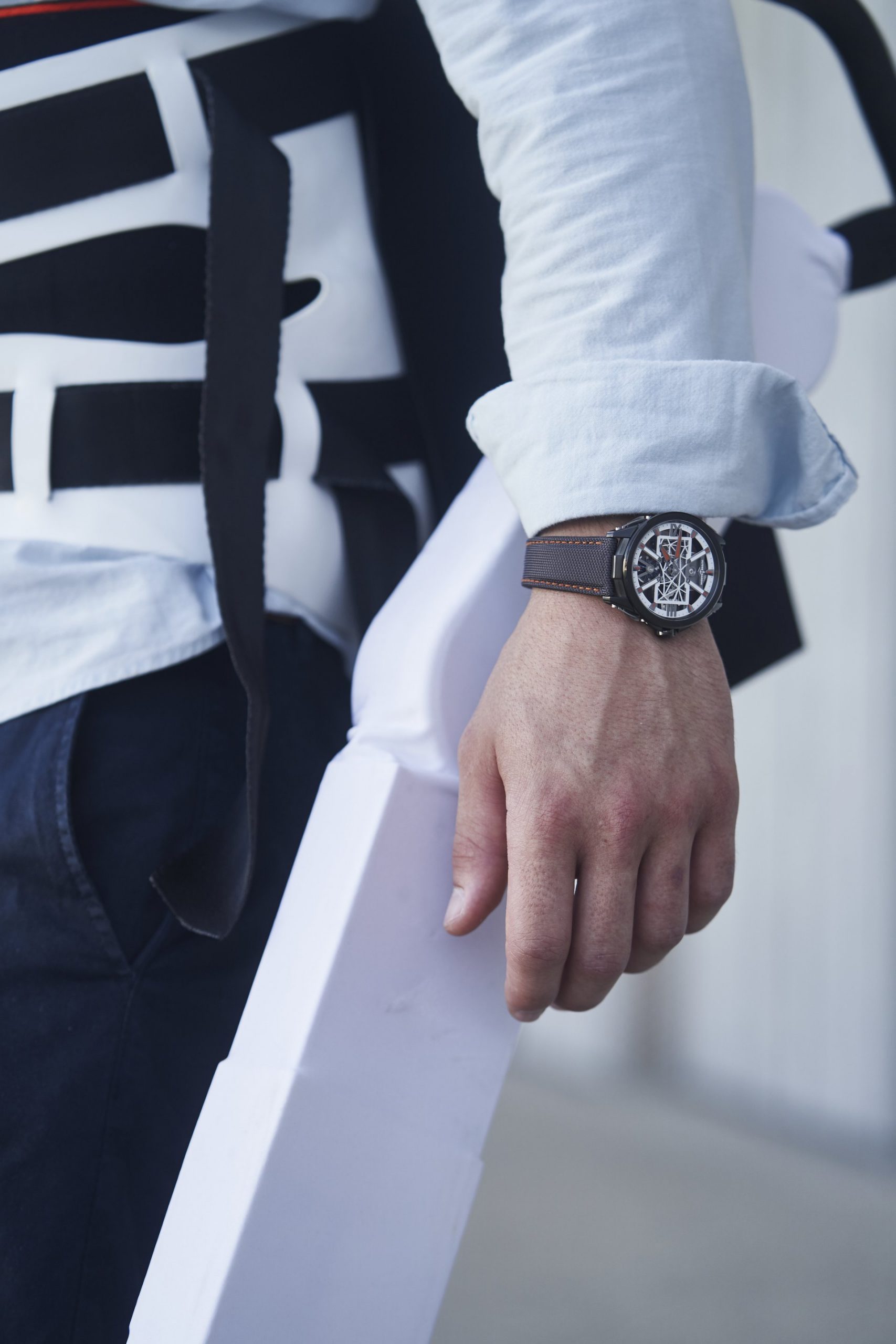 The SKELETON X, launched at SIHH in January 2019, sports a carapace giving it a bionic look and accentuating its ergonomic design. The flexible double blade is attached with two screws, one on the case and the other on the lug, enhancing the flexibility of the piece by allowing some movement between the lug bar and the case. The piece features an easily adjustable, non-integrated strap which accentuates its ergonomic features. This textile strap evokes the supple straps of medical exoskeletons, designed to be an optimal fit for the wrist. Featuring an anthracite grey PVD bezel, splashes of orange Super-LumiNova on the indexes and hands further enhance the appeal of the timepiece. In place of the dial, a white design inside the rectangle represents a molecular structure, a nod to the medical purpose behind Only Watch.