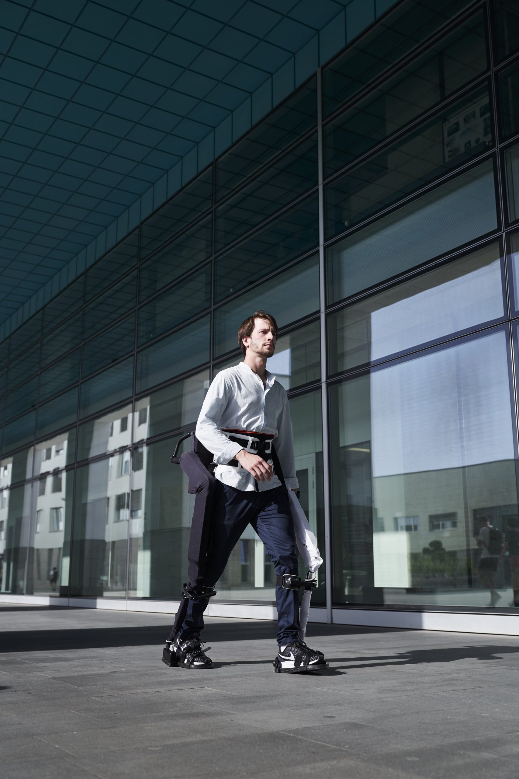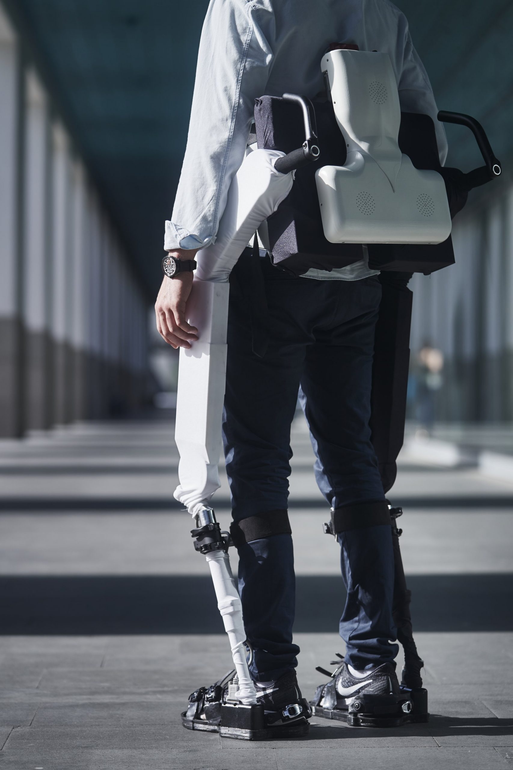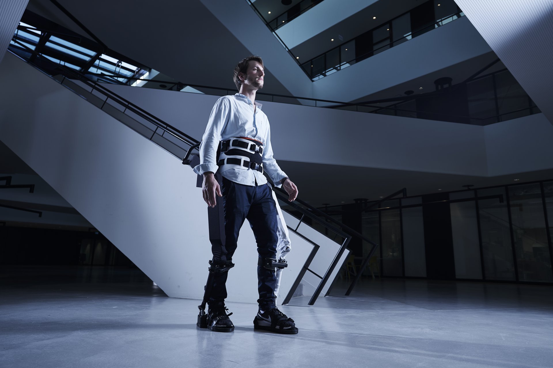 AUTONOMYO is an exoskeleton that meets multiple challenges. In order to allow total freedom of movement, it features 6 motorized axes at the hips and knees, as well as 6 passive axes at the ankles. The exoskeleton allows the user to make complex movements far beyond a robotic walk. The AUTONOMYO team is also working on the concepts of intention detection and balance augmentation, which allow a symbiosis of the movement assisted by the device as well as an increased level of security. Multiple sensors for movement, force and inertia are processed about 500 times a second with advanced algorithms in order to meet these challenges. The exoskeleton currently weighs 25 kg (55 lb) self-standing, which means that the user does not feel the device’s weight at all. It can also be adjusted for heights from 160 cm (63 in) to 200 cm (79 in).