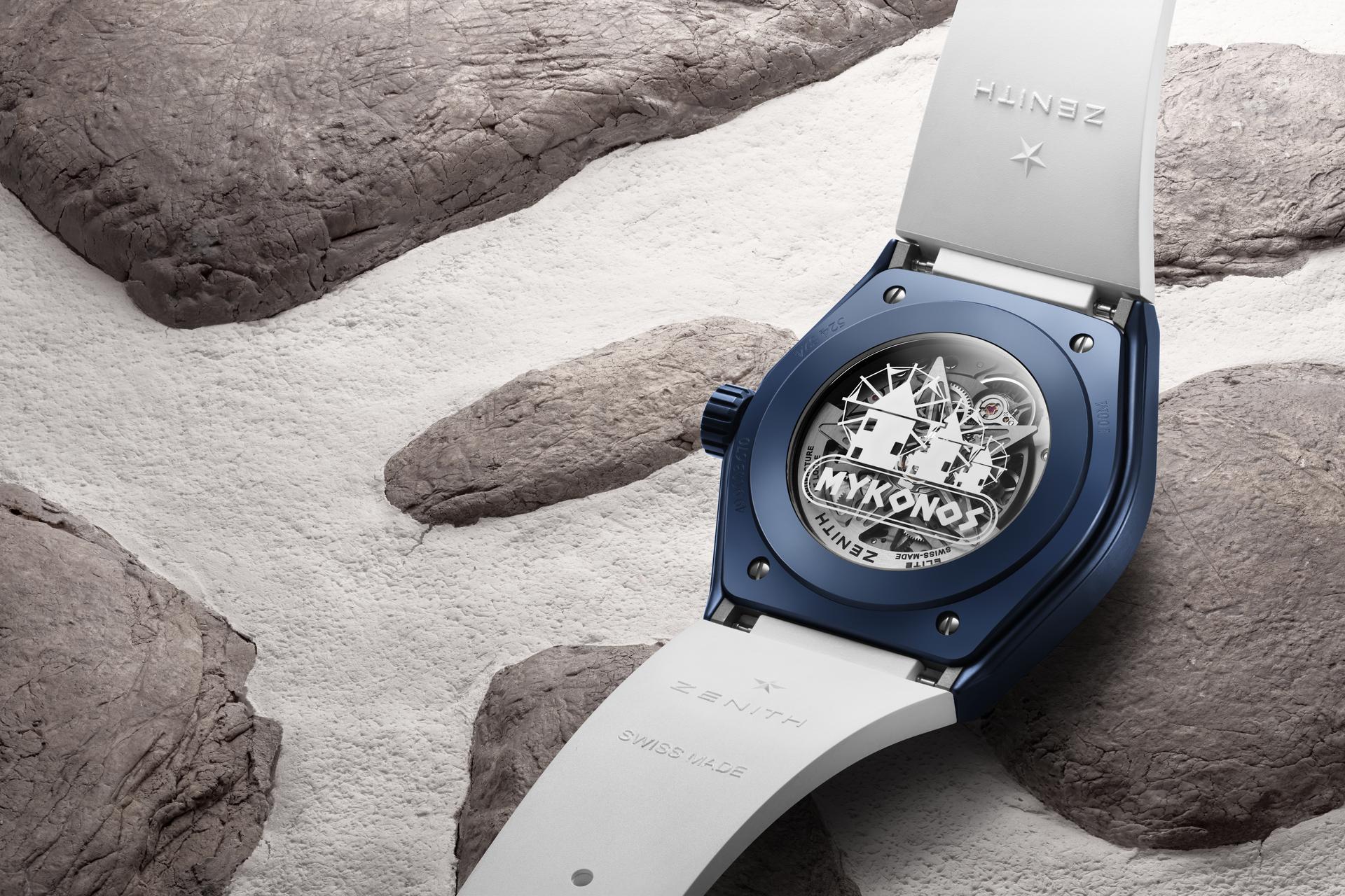 Visible through the dial as well as the case back, the DEFY Classic Mykonos Edition’s movement is a modern remake of Zenith’s staple automatic movement, the Elite. With a skeleton execution of the main plate, bridges and even the date wheel, the Elite calibre’s modernism extends beyond just aesthetics, featuring a silicon escape-wheel and lever offering precision at a frequency of 28,800 VpH (4 Hz). When fully wound, the automatic Elite movement provides a minimum power reserve of 50 hours. Keeping with the Mykonian theme of this exclusive edition, the sapphire display on the back of the case is emblazoned with the silhouette of Mykonos’ iconic white windmills that have become a symbol of the unique island.
