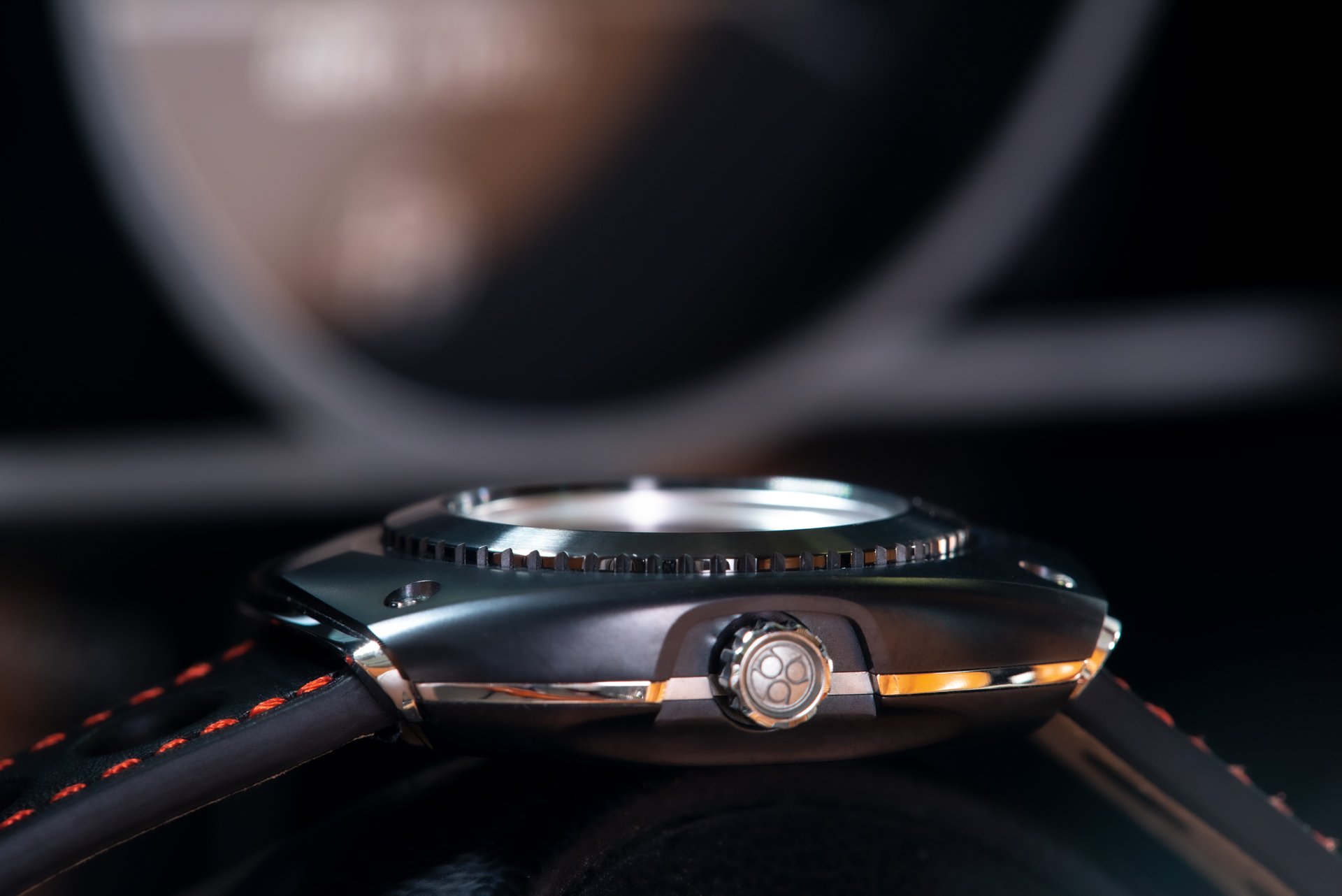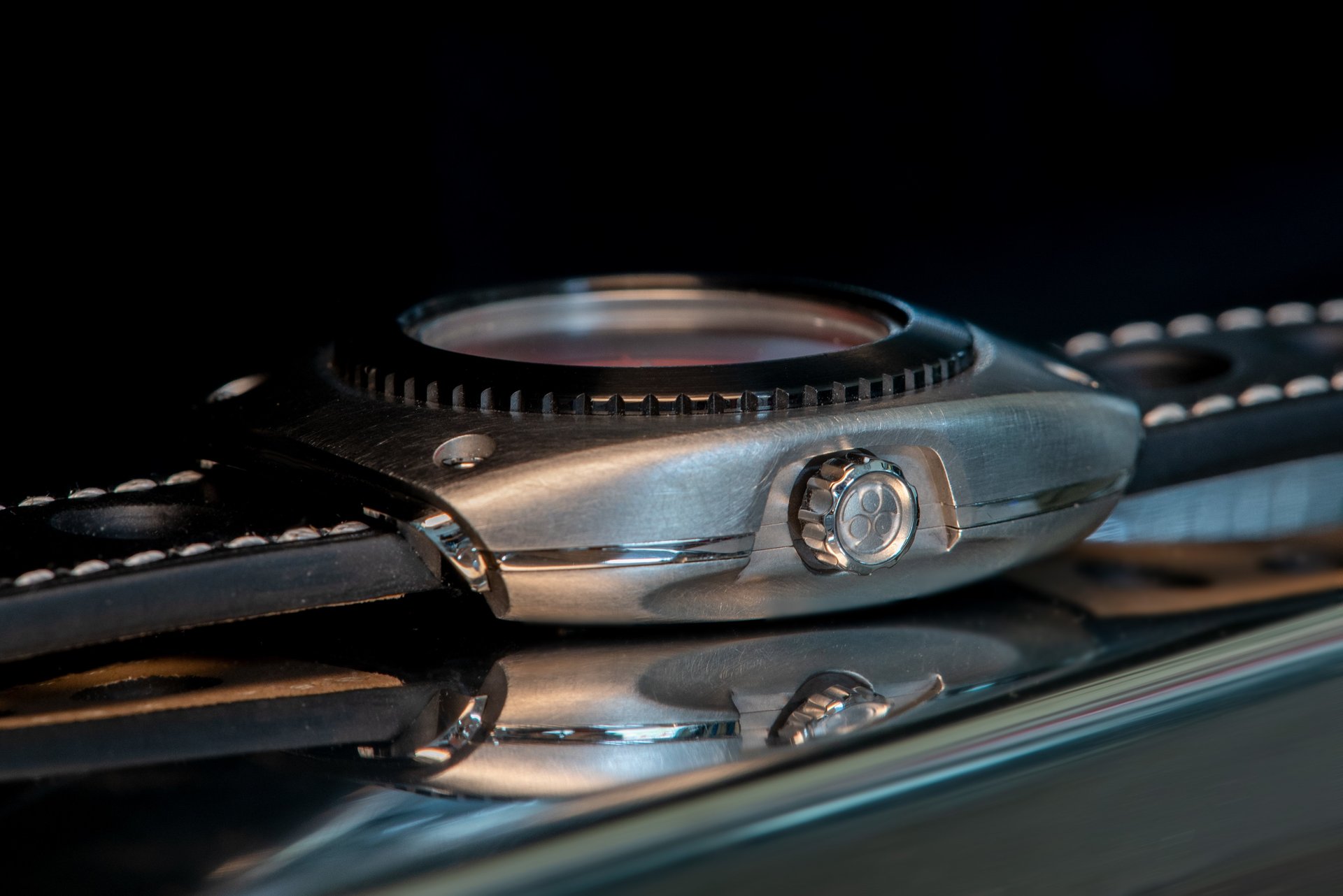 Nero profondo: Black as it can be. The steel carrozzerria is treated with a black high-tech PVD-coating. The red stitching on the strap makes a excellent contrast. Subtle. Mysterious. Fast.