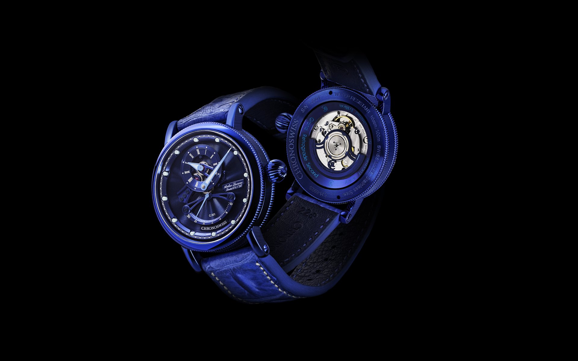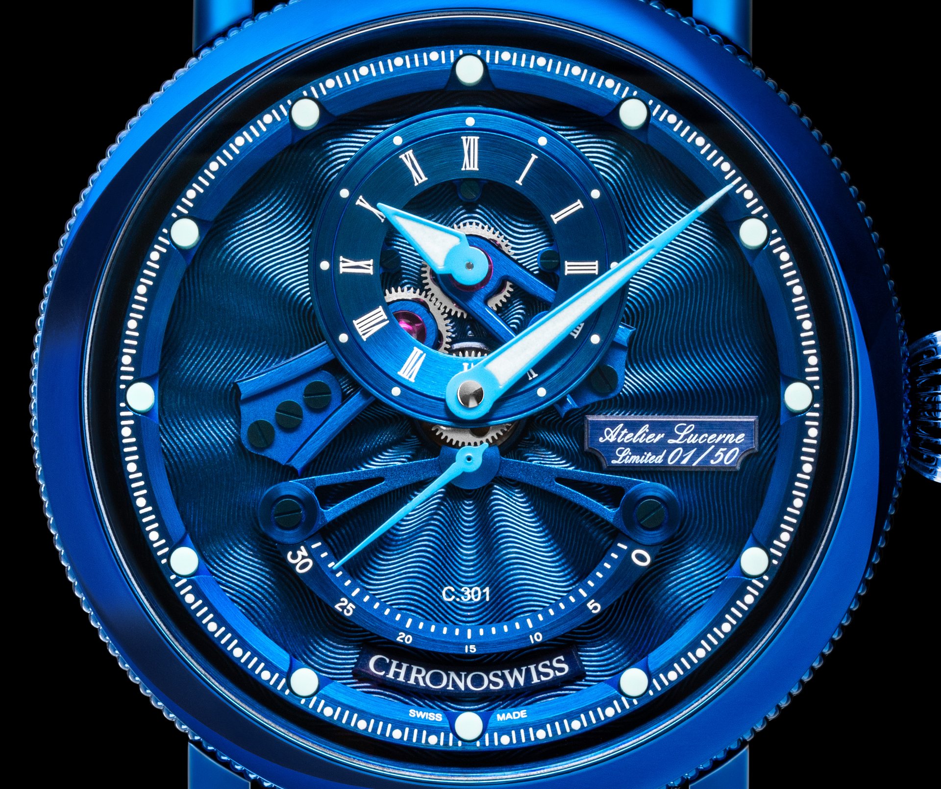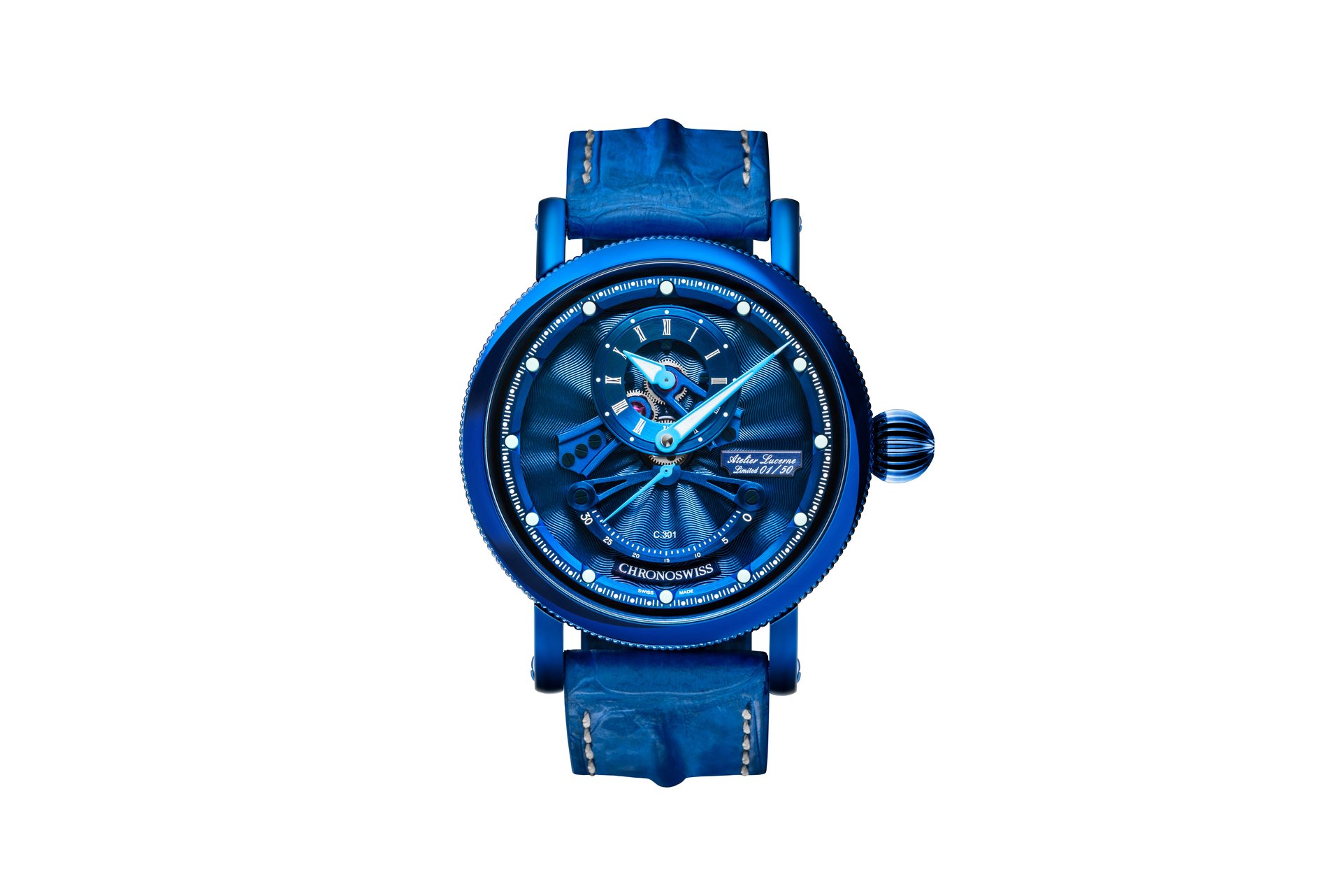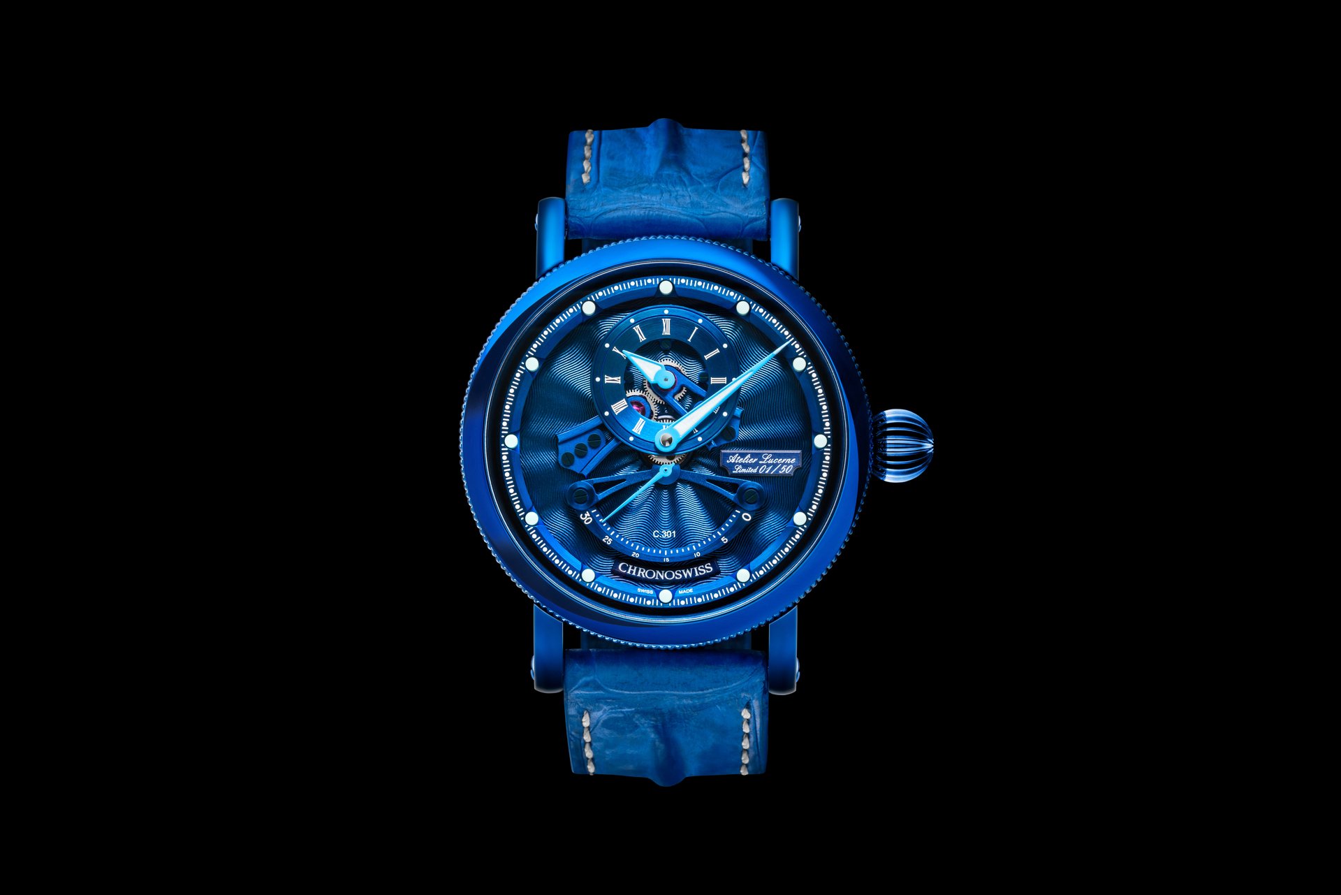 Versatility determines the collection in all five versions. Particularly eye-catching is the model in blue, whose colour is by no means limited to the dial, with its case being entirely “Electric Blue”. It derives its fascinating colour through the coating with a high-quality, extremely scratch-resistant DLC (diamond-like-carbon) finish with a hardness of 4,500 Vickers, also ensuring its irresistible lustre. The components used for the complex dial construction are also coated with blue DLC, such as the skeletonized gear-train bridges and the hour gauge funnel. And even at night, the blue colour variation remains true, because all the fluorescent elements such as the inlays of hands and indices match the blue of the Super-LumiNova Blue Line. It’s no surprise that the bracelet also fits into the colour scheme.