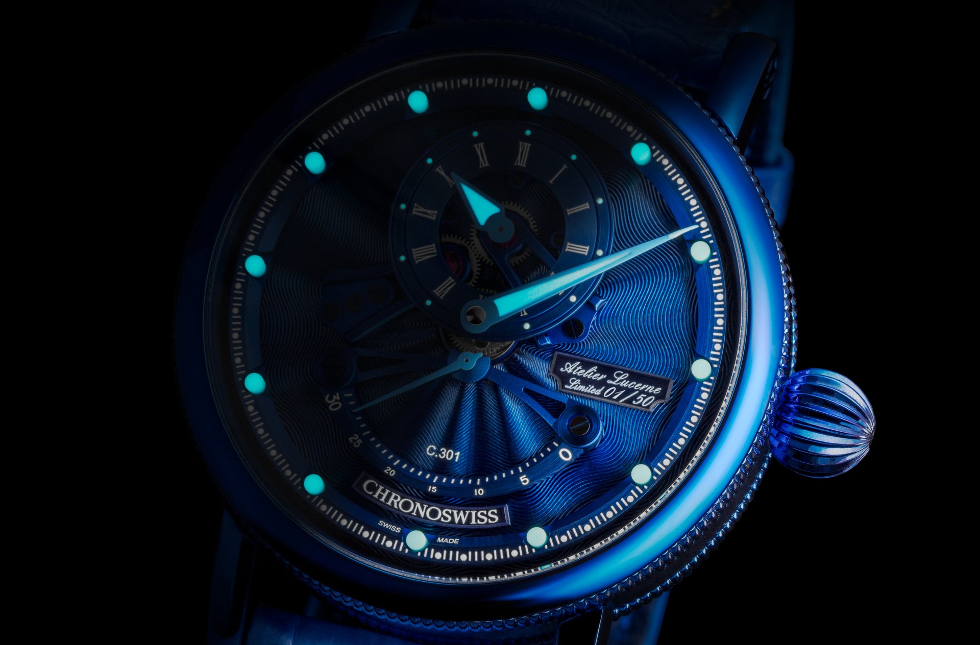 Other noteworthy features include the intense indexes that glow persistently in the dark, made of a mix of Super-LumiNova and ceramics, whose massive cylinder shape provides a perfect match for the 3-D design of the dial. The hands in the shape of elongated triangles and also equipped with Super-LumiNova inlays ensuring optimal night readability were specially designed by Chronoswiss. The rear of the Flying Grand Regulator Open Gear ReSec is also worth a second glance, as the beauty of the embellished movement can be admired through the sapphire crystal back.