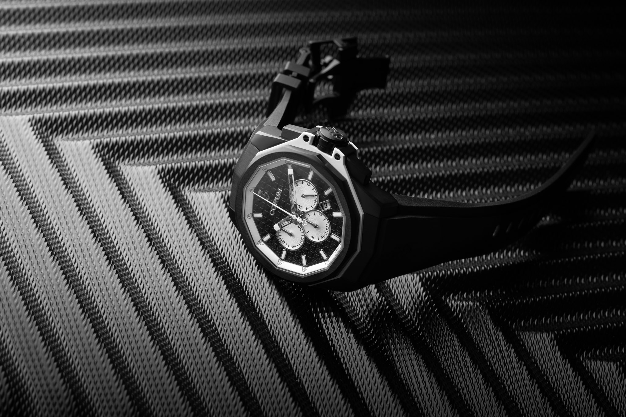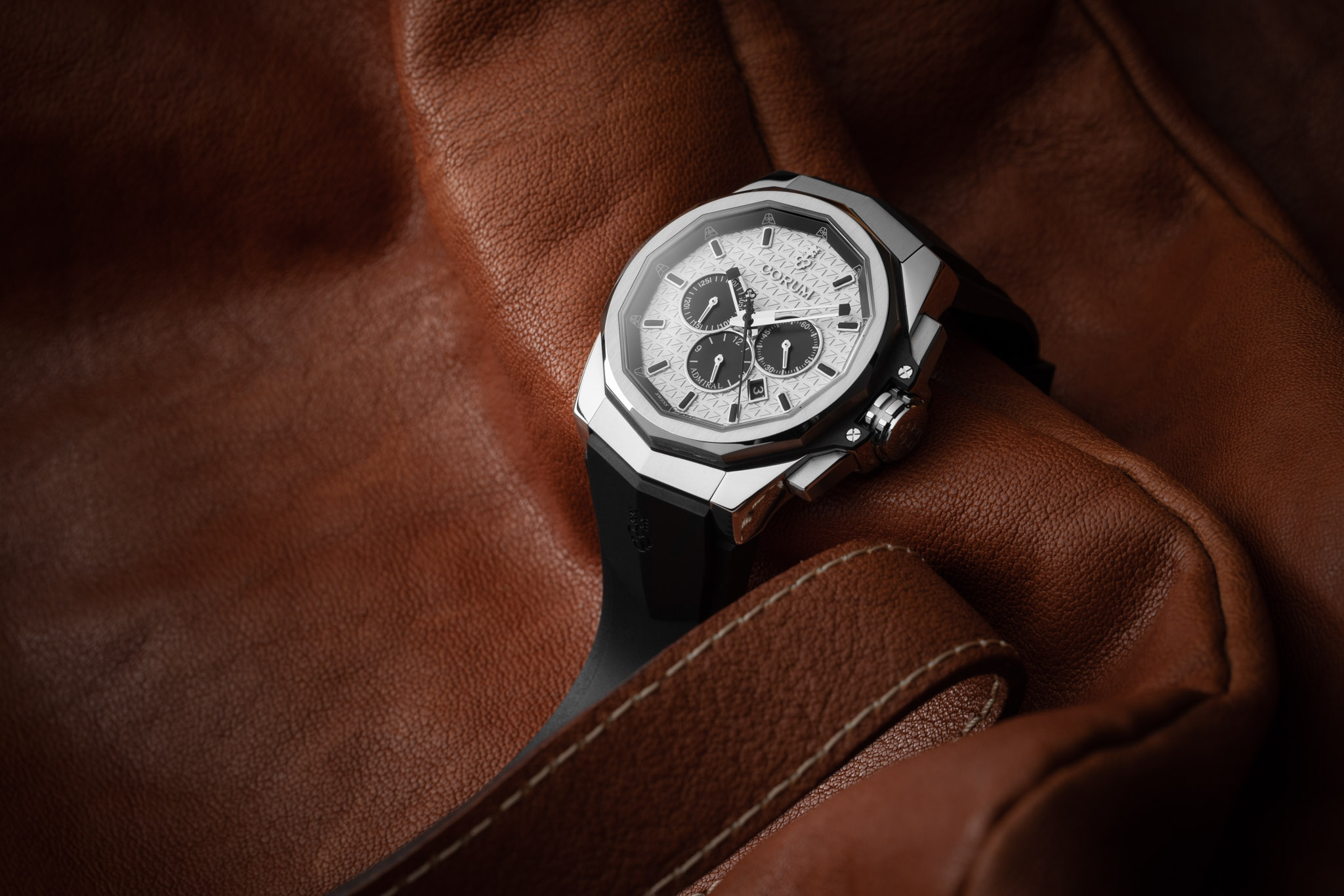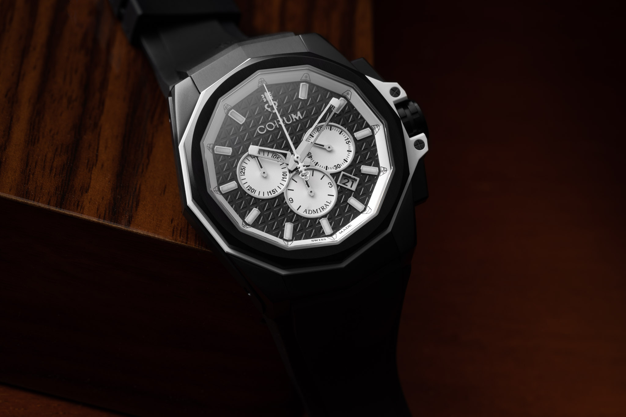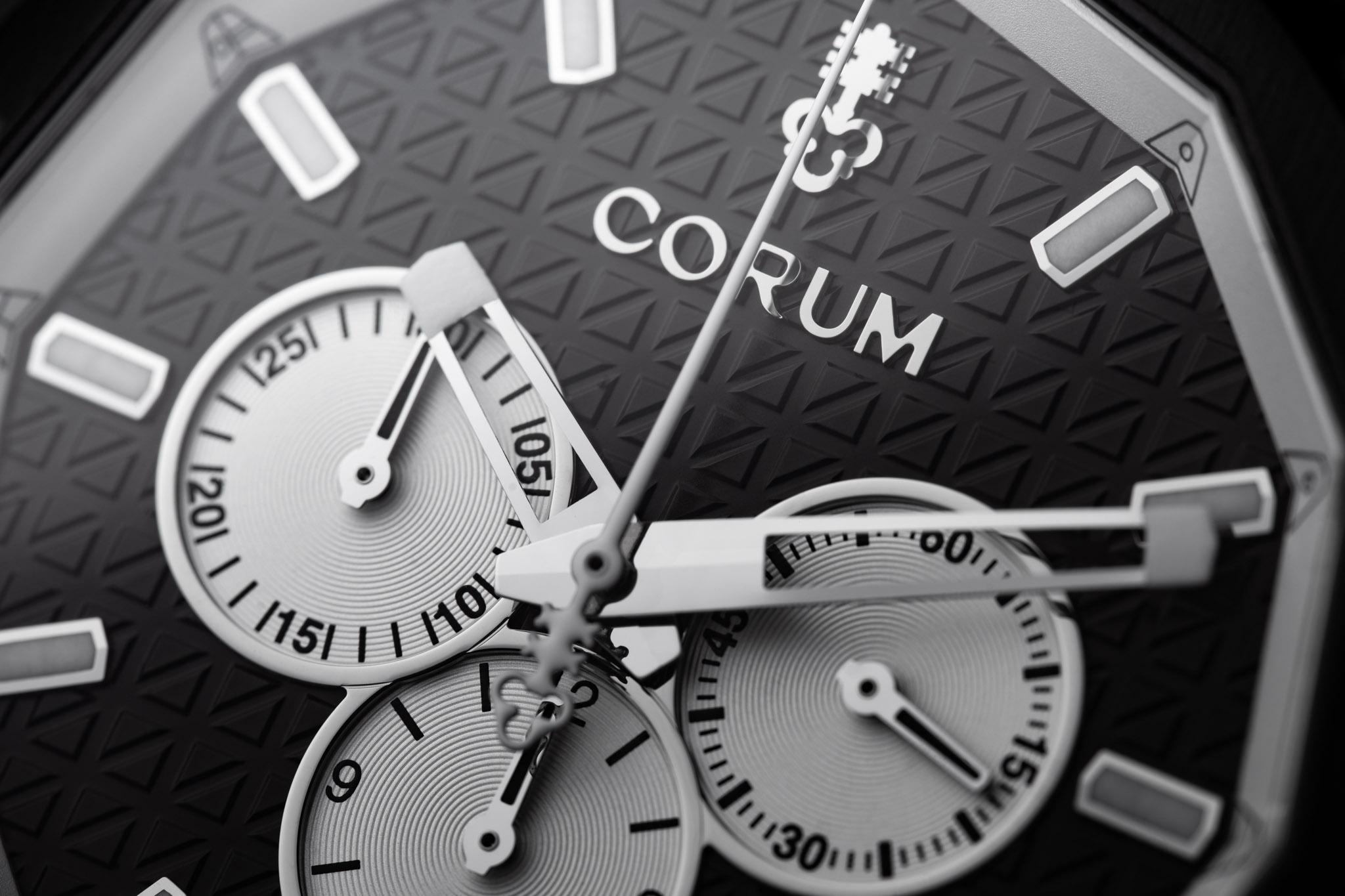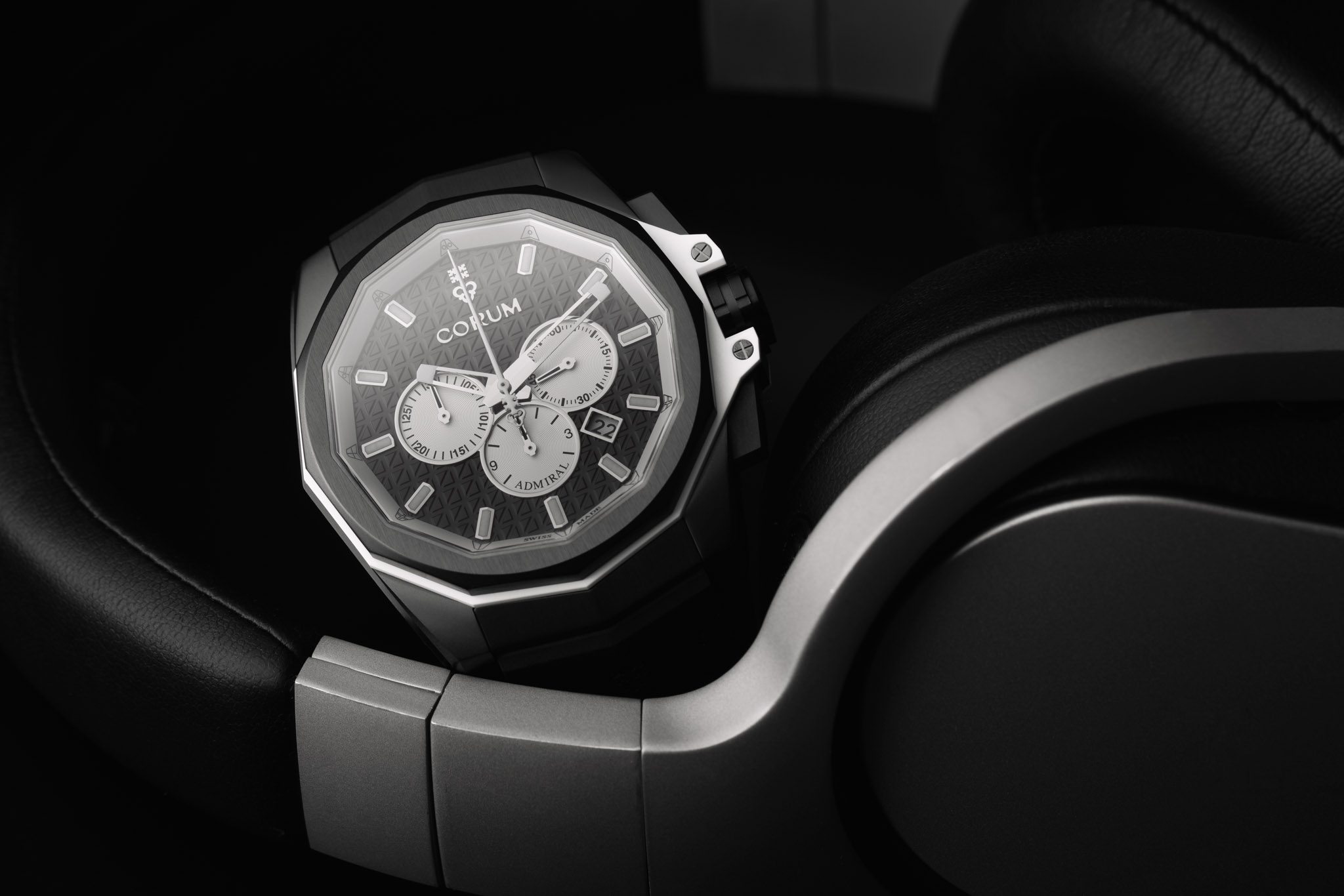 Corum also worked on the case shape of the watch. While it follows strictly to the case shape of the legendary Admiral watch, there is a marked difference—the Admiral AC-One 45 Chronograph features a more angular dodecagonal bezel compared to its predecessor, which boasted more rounded corners in a bid to create a more sophisticated aesthetic. For the new variant, Corum has also included two titanium inserts between the bezel and case so as to offer the option of playing with colours and materials—the possibility of mixing and matching is boundless and is something that the Swiss watchmaker will experiment with in the future. The result lends a more powerful and athletic presence on the wrist, which also makes the watch highly suitable for the rigours of everyday wear.