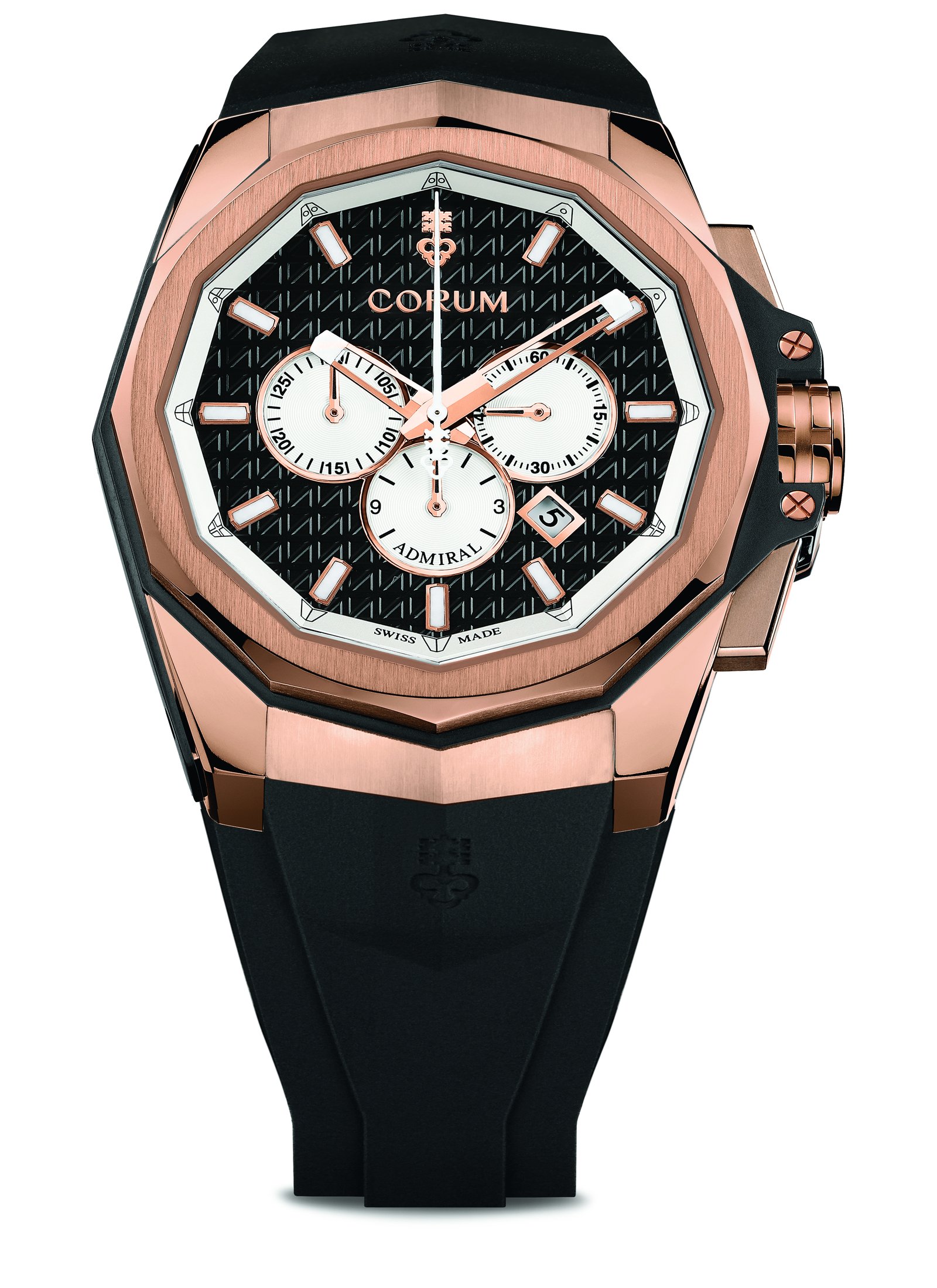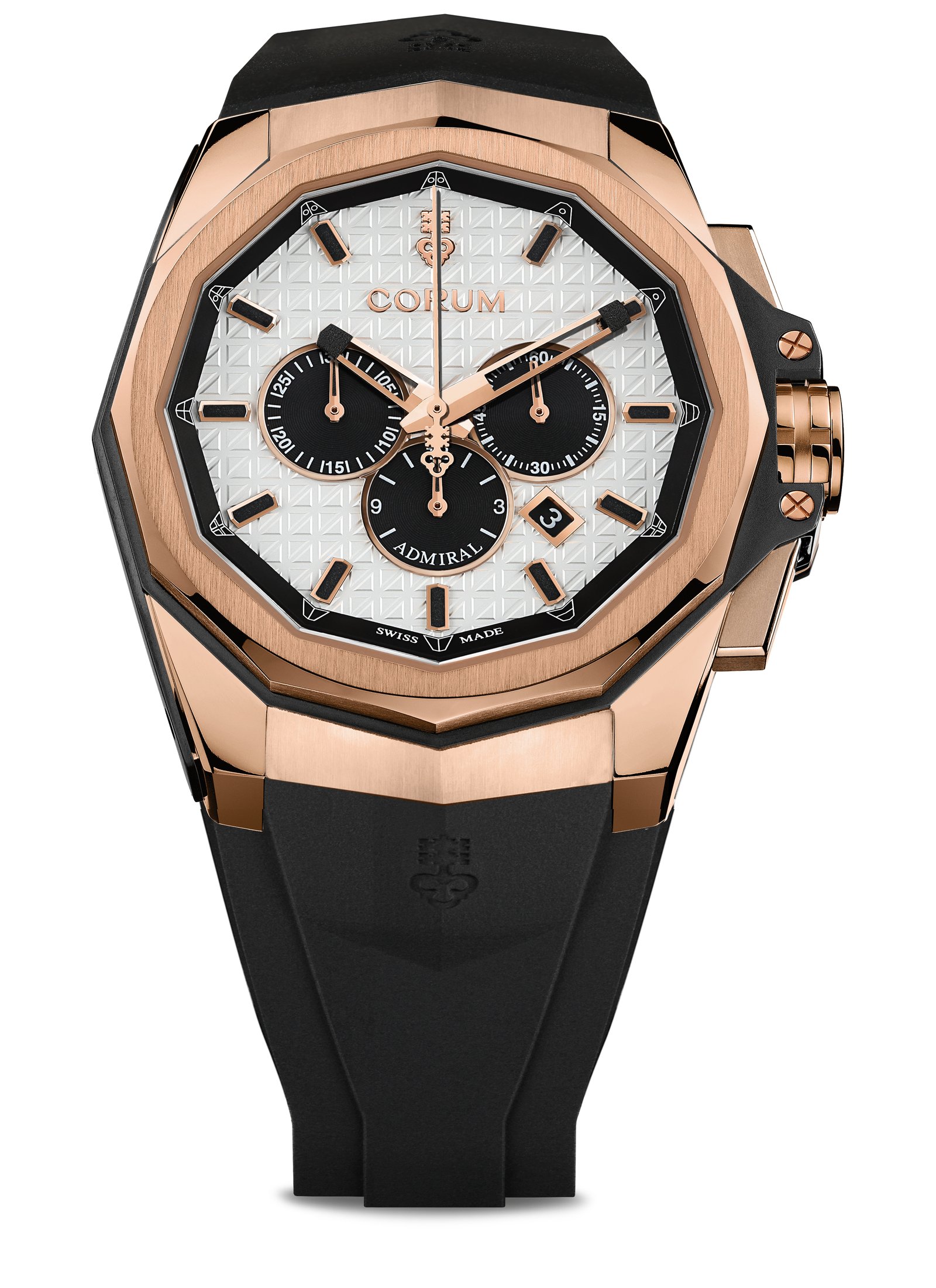 While the previous versions were offered with either the rubber strap or metal bracelet, the new Admiral AC-One 45 Chronograph comes with a vulcanised rubber strap that features a triple folding clasp, which replaces the old tongue buckle. Corum will also offer the watch with either a titanium or rose gold bracelet.