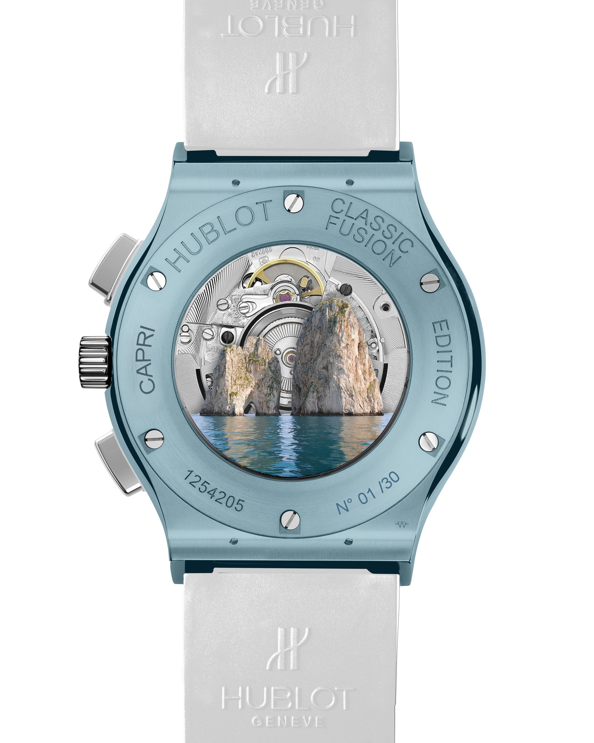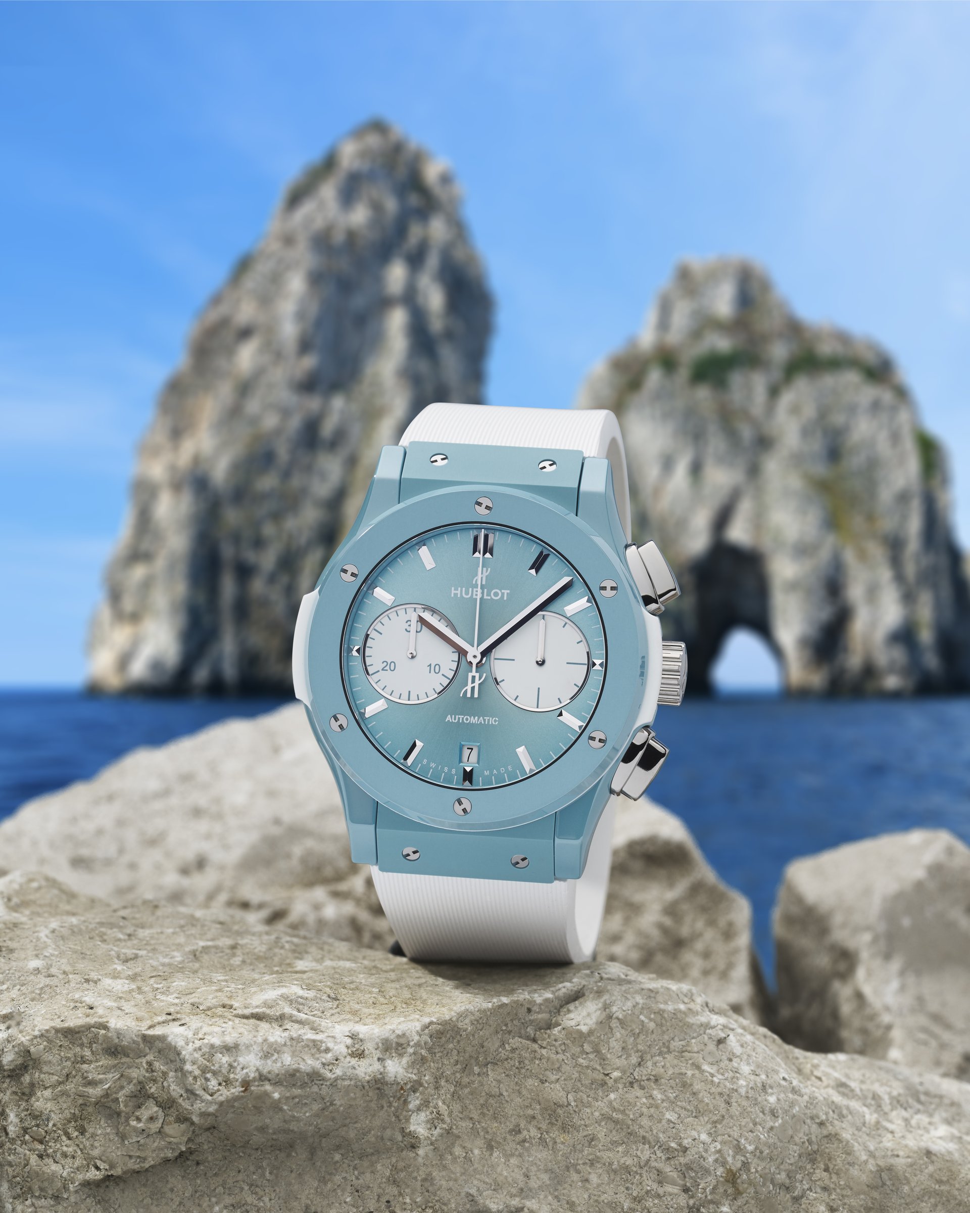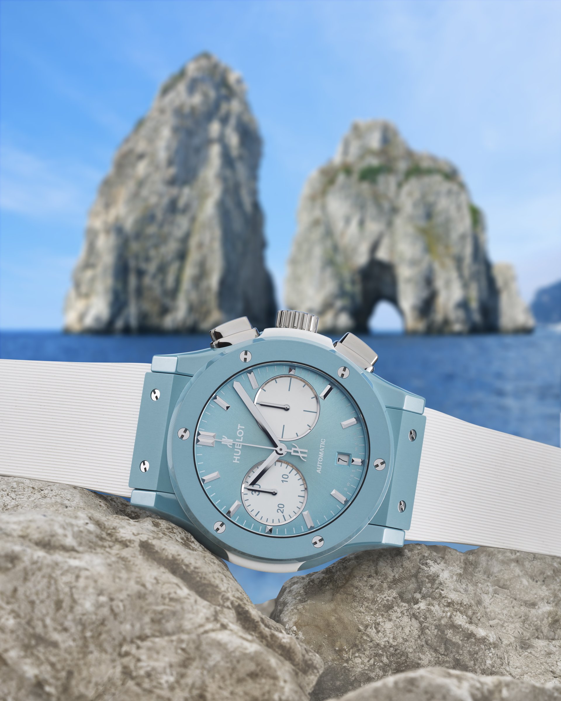 Hublot loves Capri. It is with this in mind that in 2019 we want to pay homage to its unique atmosphere and breath-taking panoramas with a new limited edition timepiece, the Hublot Classic Fusion Chronograph Special Edition Capri, made from innovative sky blue ceramic.