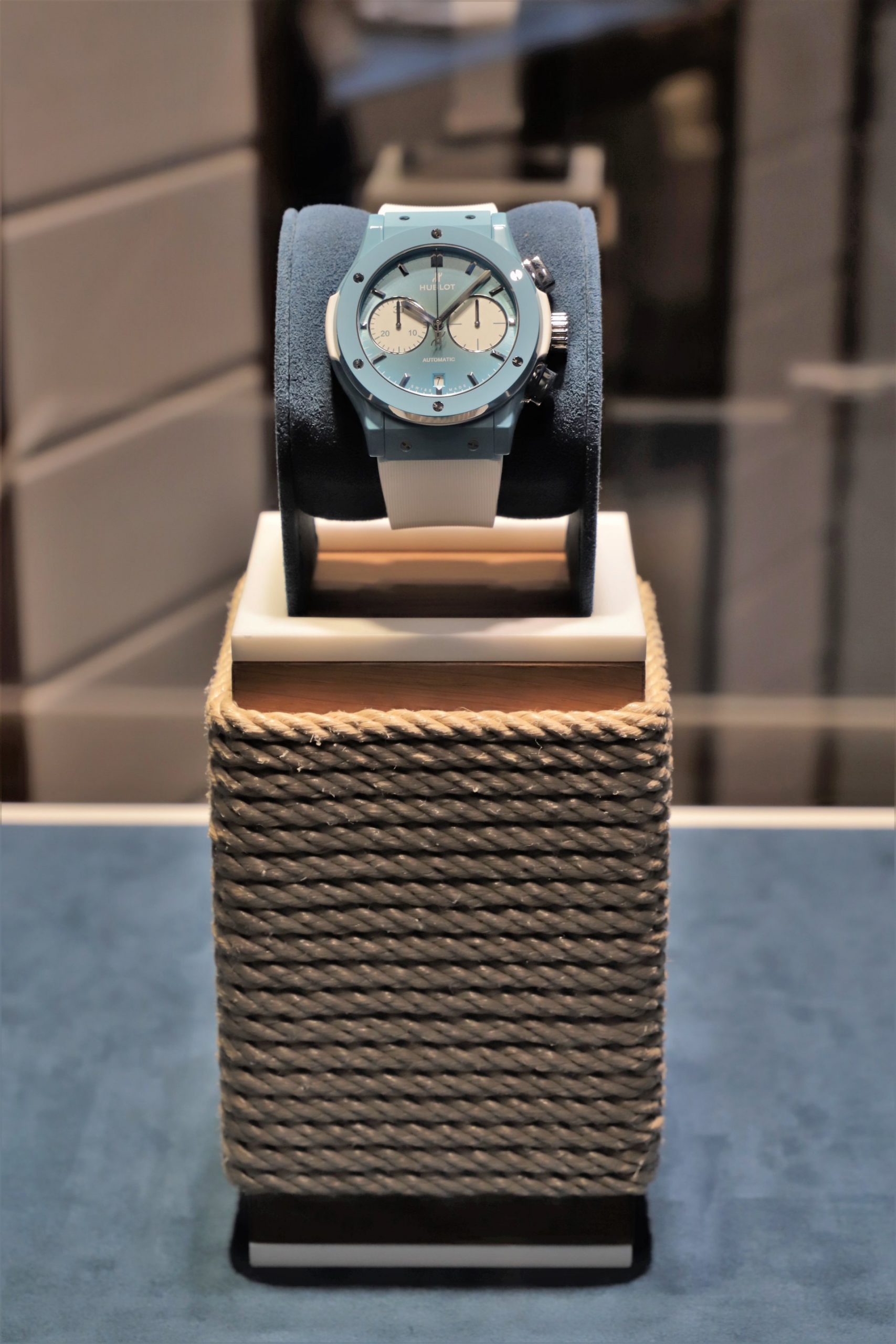This watch is dedicated to summer, as well as to the second anniversary of the boutique which opened in 2017 in via Vittorio Emanuele, right at the very heart of luxury shopping on the island famed for its towering faraglioni coastal rock formations. A special window display, inspired by the sea, reflects the colours of the new chronograph. The limited edition, numbered to 30 pieces, has a decidedly summery, relaxed and contemporary look, and can only be purchased at the boutique on Capri.