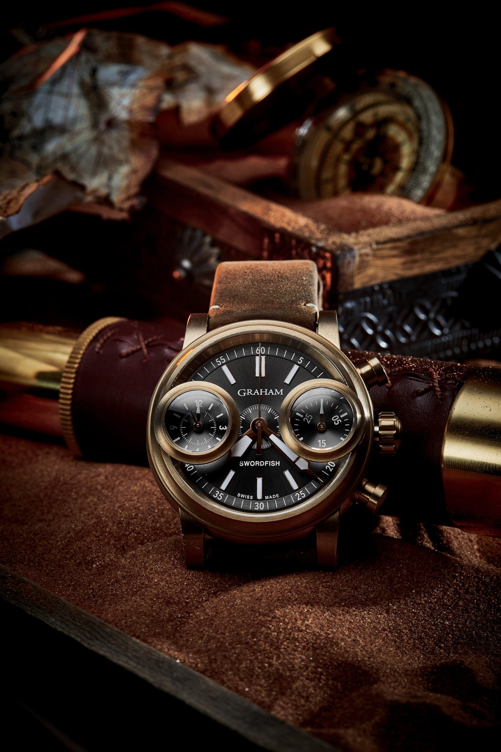 In a world of change, diversity feels perfectly at home. The 2019 additions to the Graham Swordfish family take this reality on board with different metals and the facility to match attachments with moods. There are four new pieces, two in steel and two in the bronze commonly used in the naval industry and featuring a titanium case back. Both ooze vintage appeal. A fish out of water? Never. Standing out from the crowd? Always.