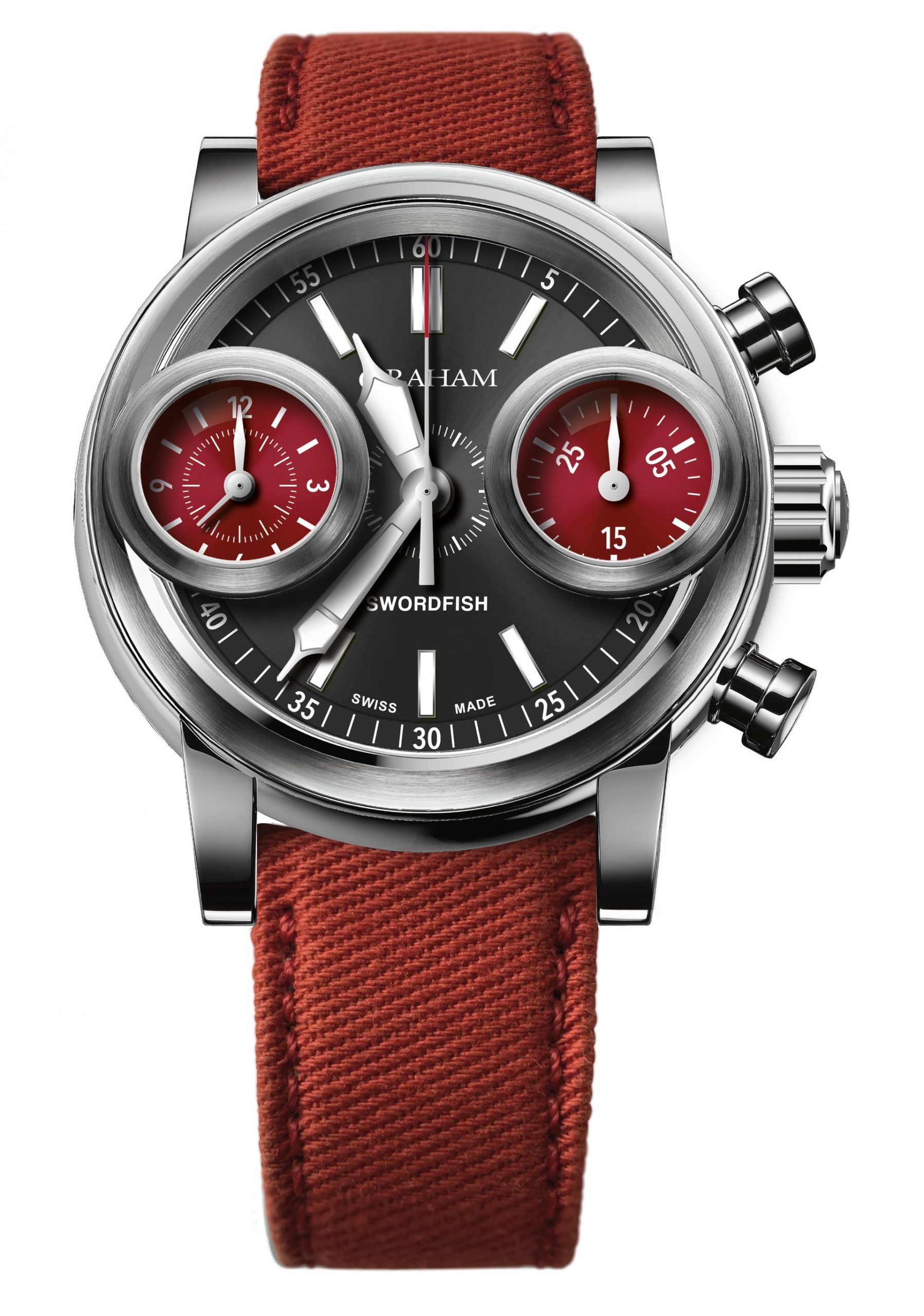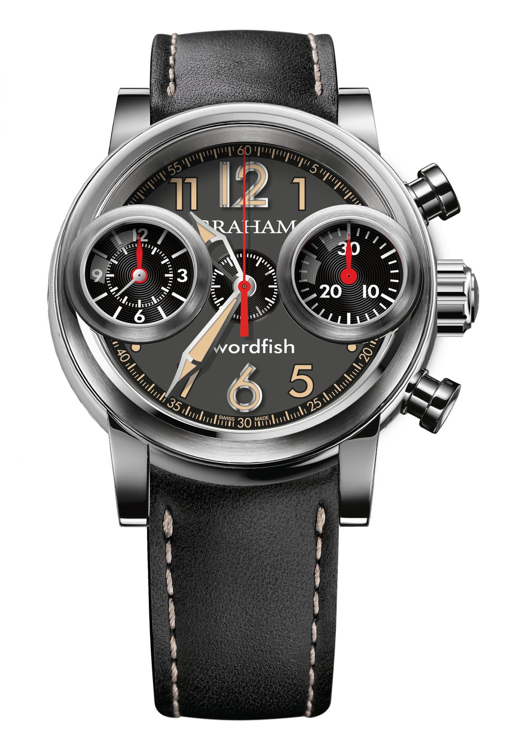Subversive becomes cohesive in the new Graham Swordfish timepieces. Named after a highly migratory predator, they use technical prowess and unconventional design to swim in bigger seas. Two 20% magnifying glasses over the hour and minute counters stare out questioningly at the onlooker. Graham has been turning the trend tide for 15 years. Are you ready to do the same? Unique is the new fashionable.