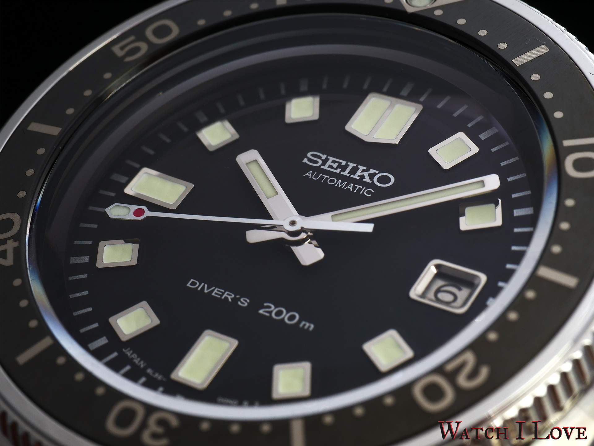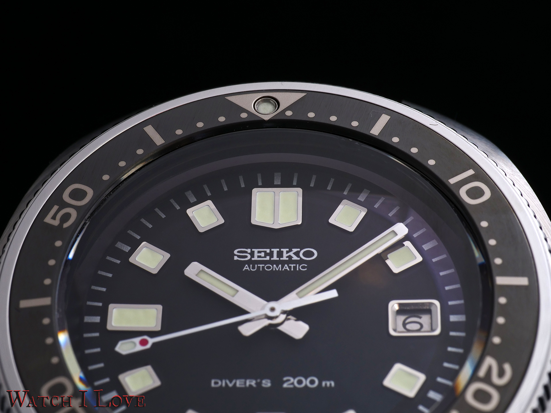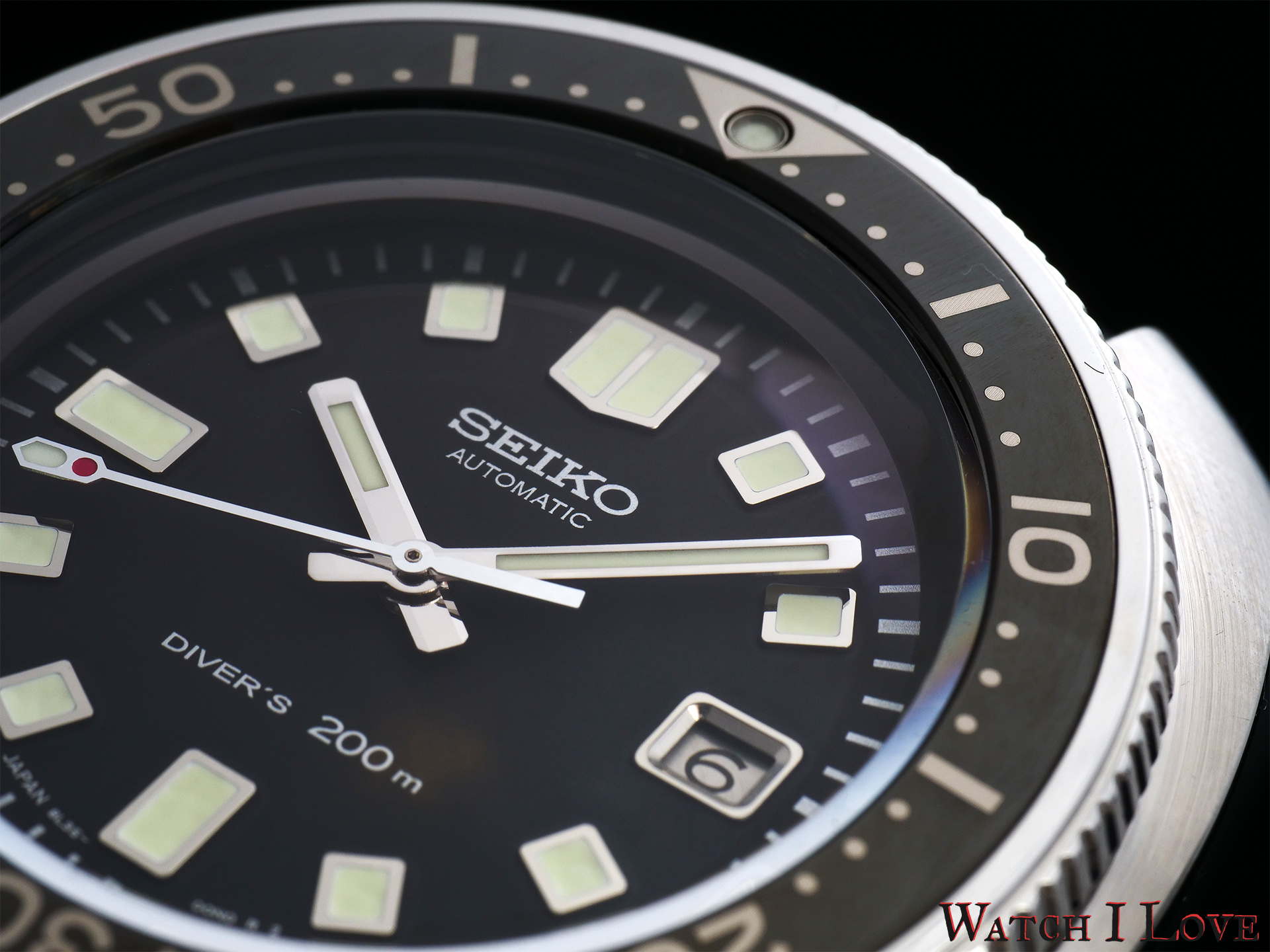 Seiko used a bevelled date aperture with black on silver date disk. The date window balances somehow the 9 o’clock indexes and an attempt to keep the dial symmetrical.