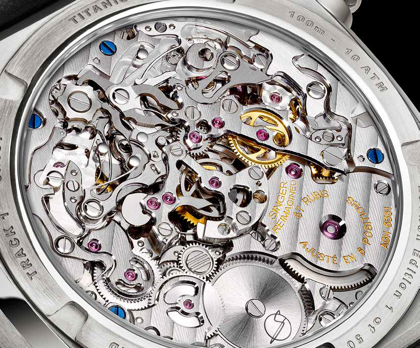 The AgenGraphe, the calibre powering the Singer Track1 stands apart from all previous chronograph movements. The result of a decade of development, this groundbreaking piece of mechanical ingenuity completely redefines fundamental principles that have remained unchanged for decades.