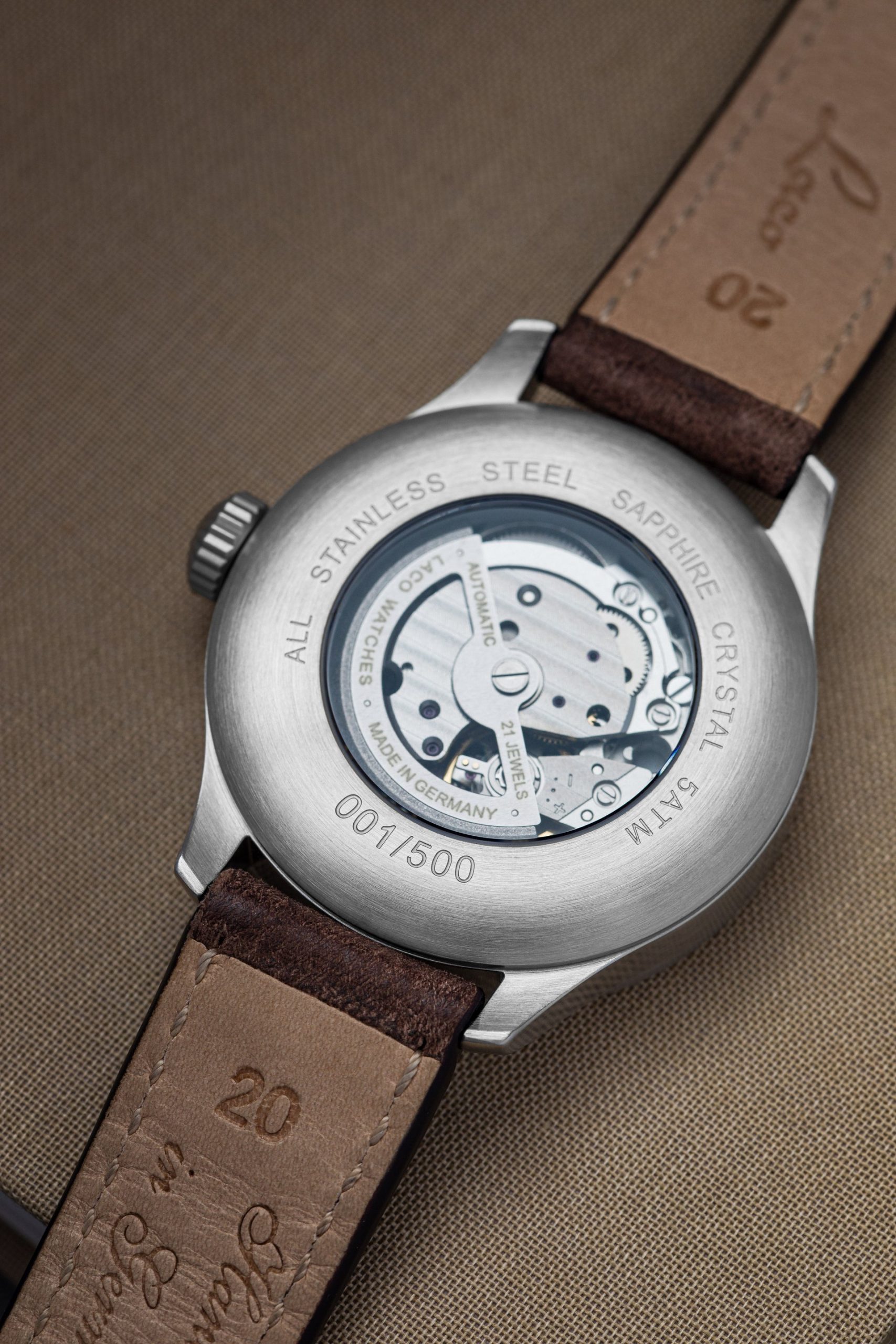 The 42 mm stainless steel case with the distinctive and grip crown assumes the rugged appearance of the classic Laco pilot watches. At the rear, the sapphire crystal base offers a clear view of the reliable clock generator of these three-hand watches: the automatic calibre Laco 21, which is based on the Miyota 821A. Unlike the standard version, the movement will be equipped with a second stop function for these two models. The progressive serial number is also engraved on the back. The watches are completed with a double-riveted brown leather watch strap, which further highlights the vintage charm with a modern touch.