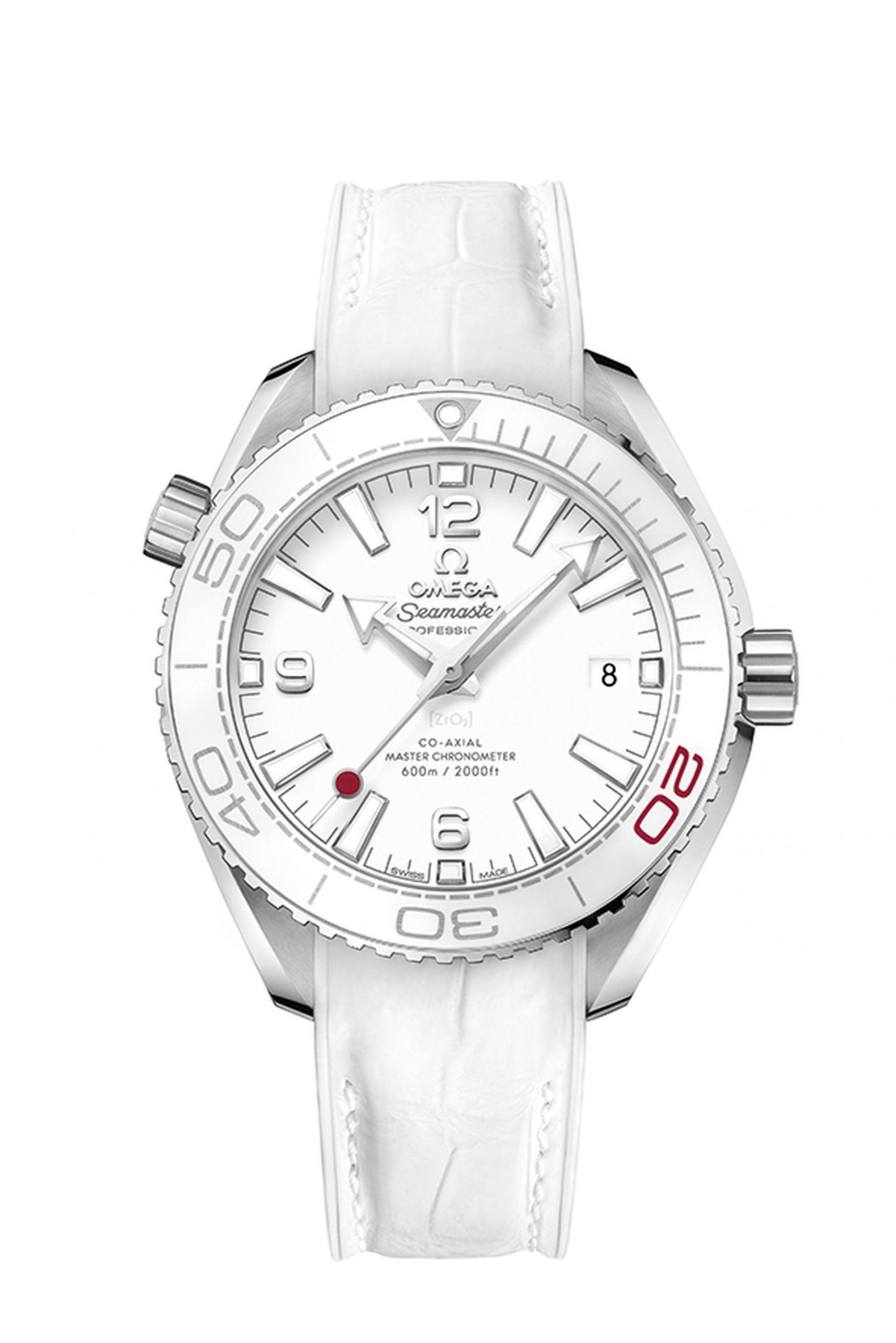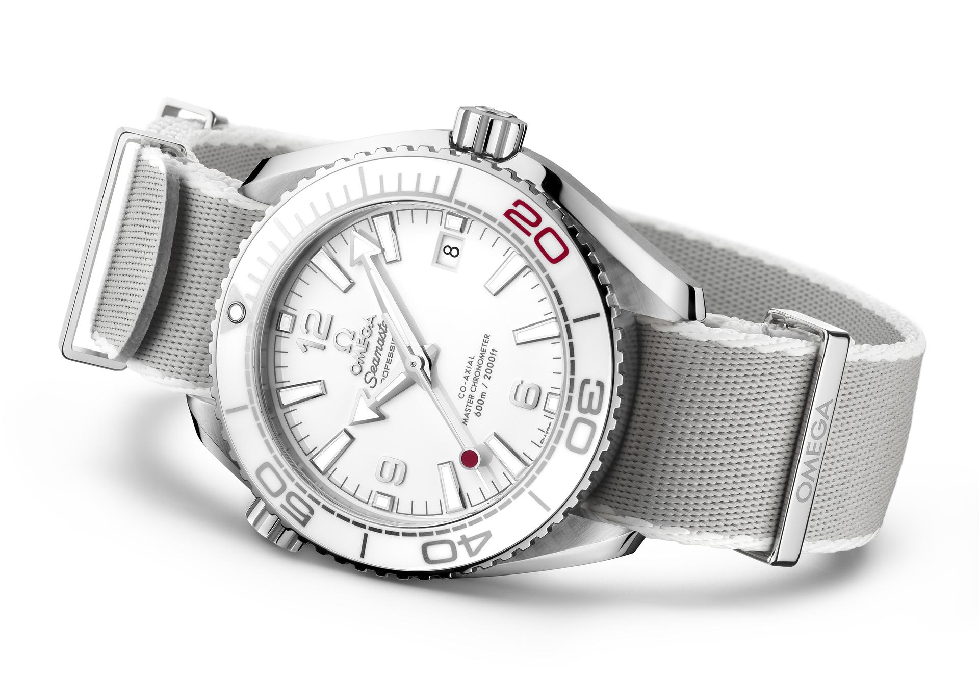 The 39.5 mm case is in stainless steel and includes a white ceramic bezel ring with its diving scale in OMEGA Liquidmetal™. In tribute to the year of Tokyo 2020, the number 20 on the bezel is filled with red liquid ceramic.