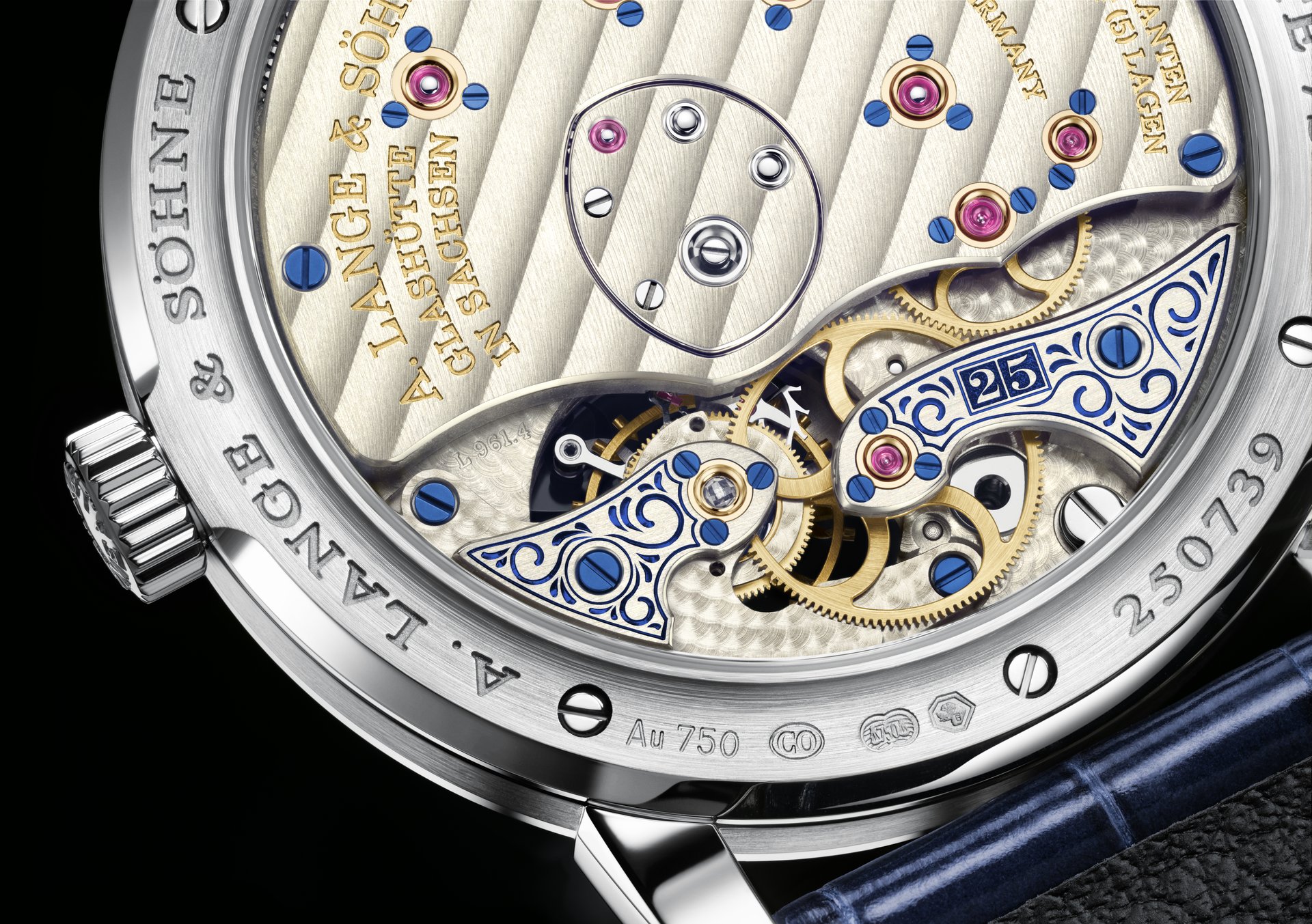 - Lange manufacture calibre L961.4, manually wound, crafted to the most exacting Lange quality standards, decorated and assembled by hand;