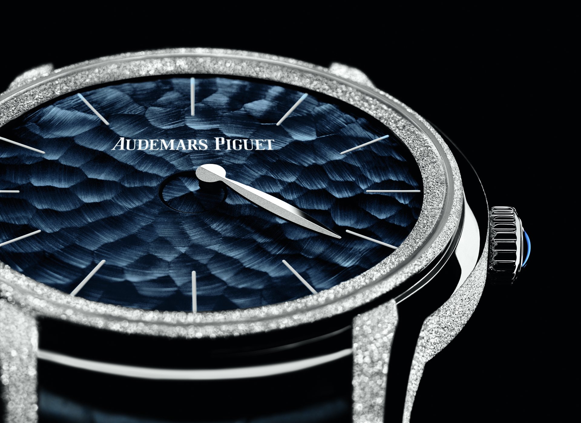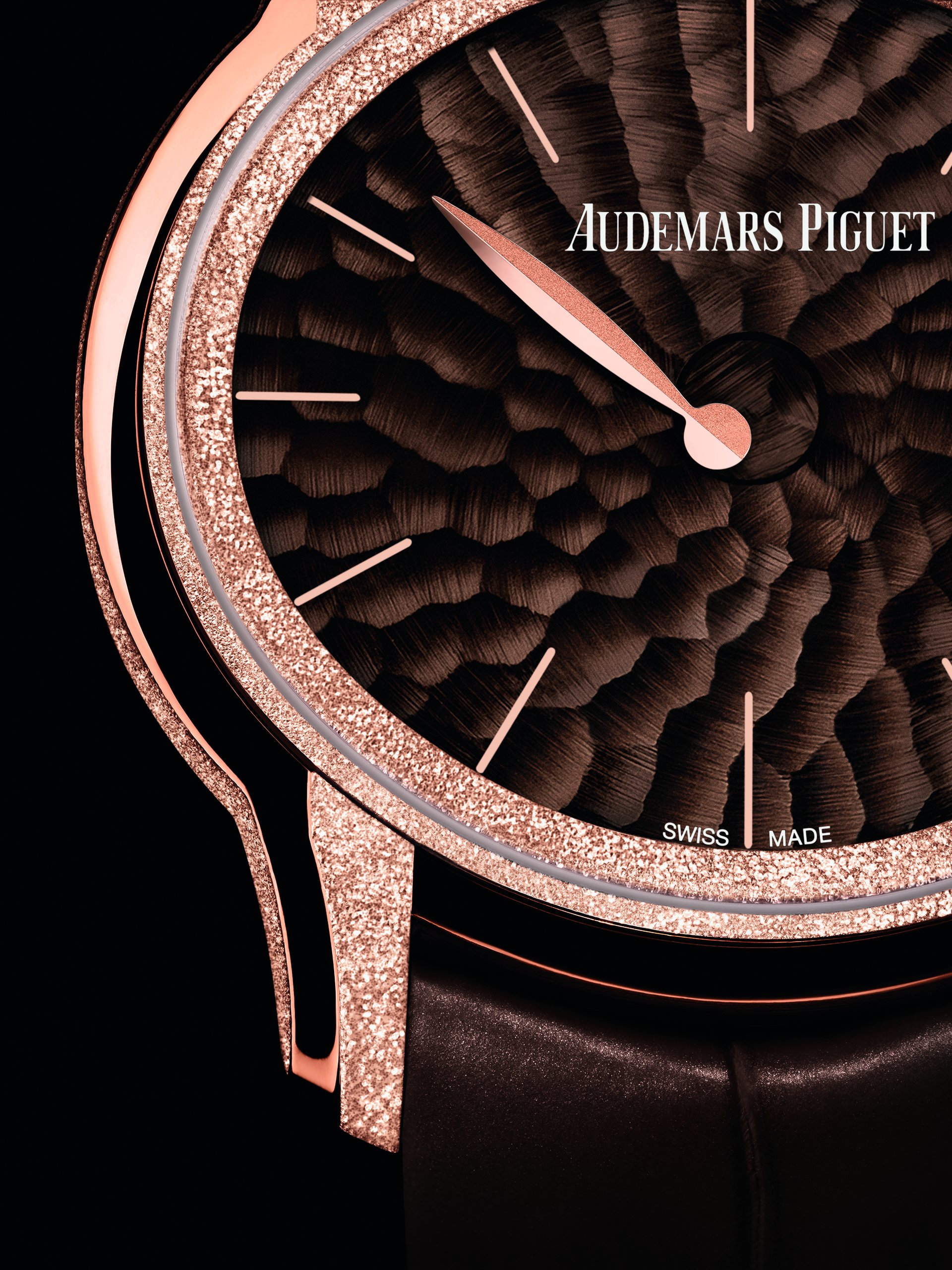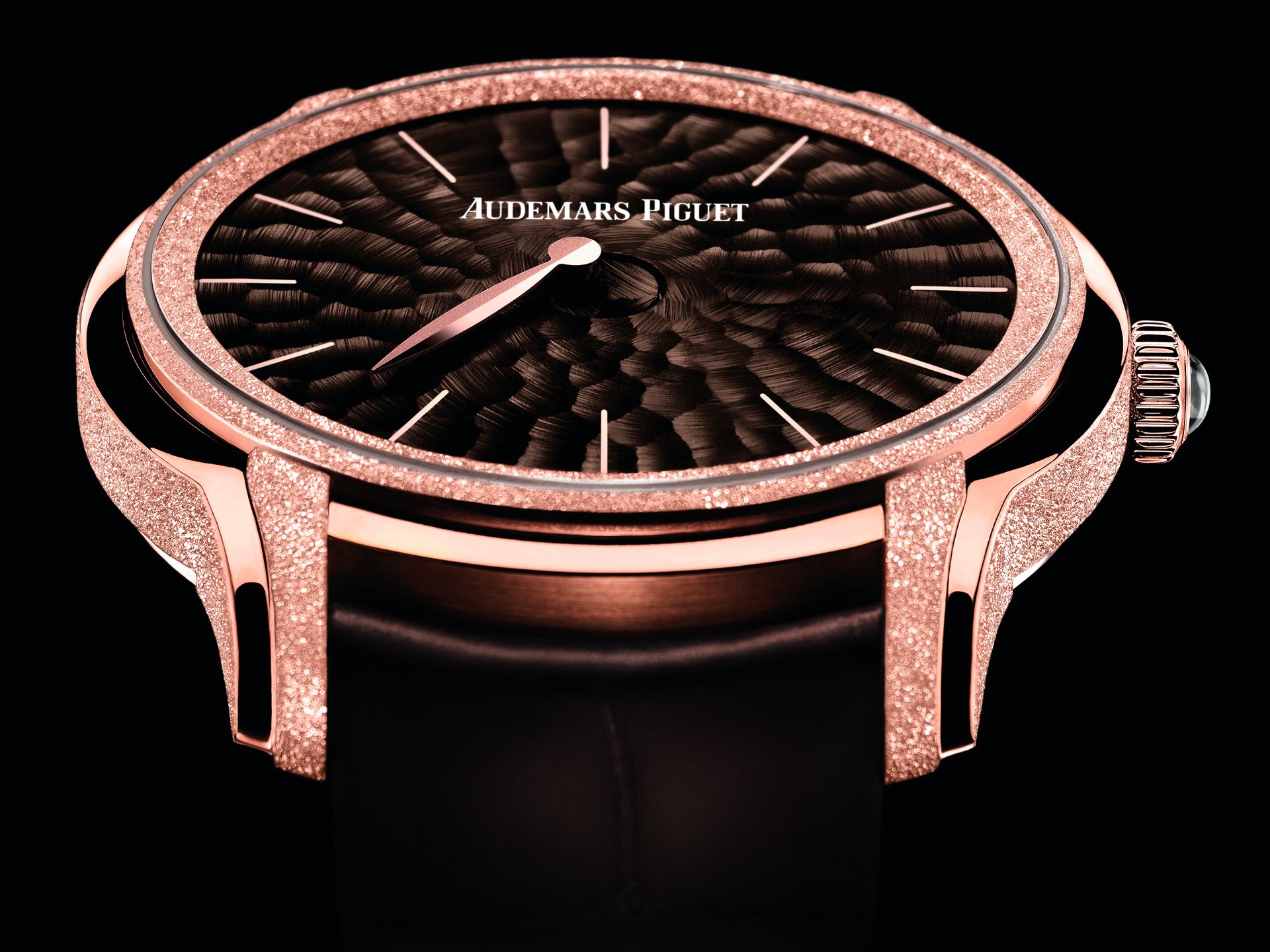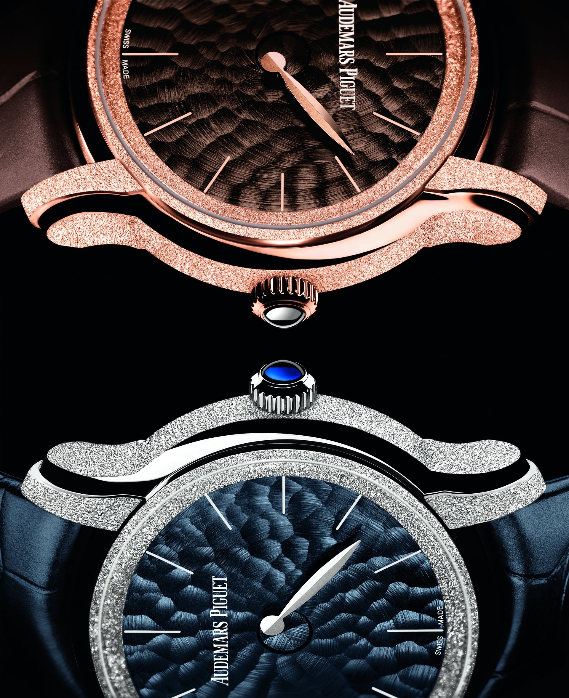 This abstract watch has been meticulously hand-finished by our watchmakers, in the highest respect of Audemars Piguet’s traditions. The 18-carat pink or white gold case presents alternating satin brushing and Frosted Gold finishing, a technique Audemars Piguet owes to Florentine jewellery designer Carolina Bucci. The diamond-dust effect it creates results from hours of meticulous micro-hammering.