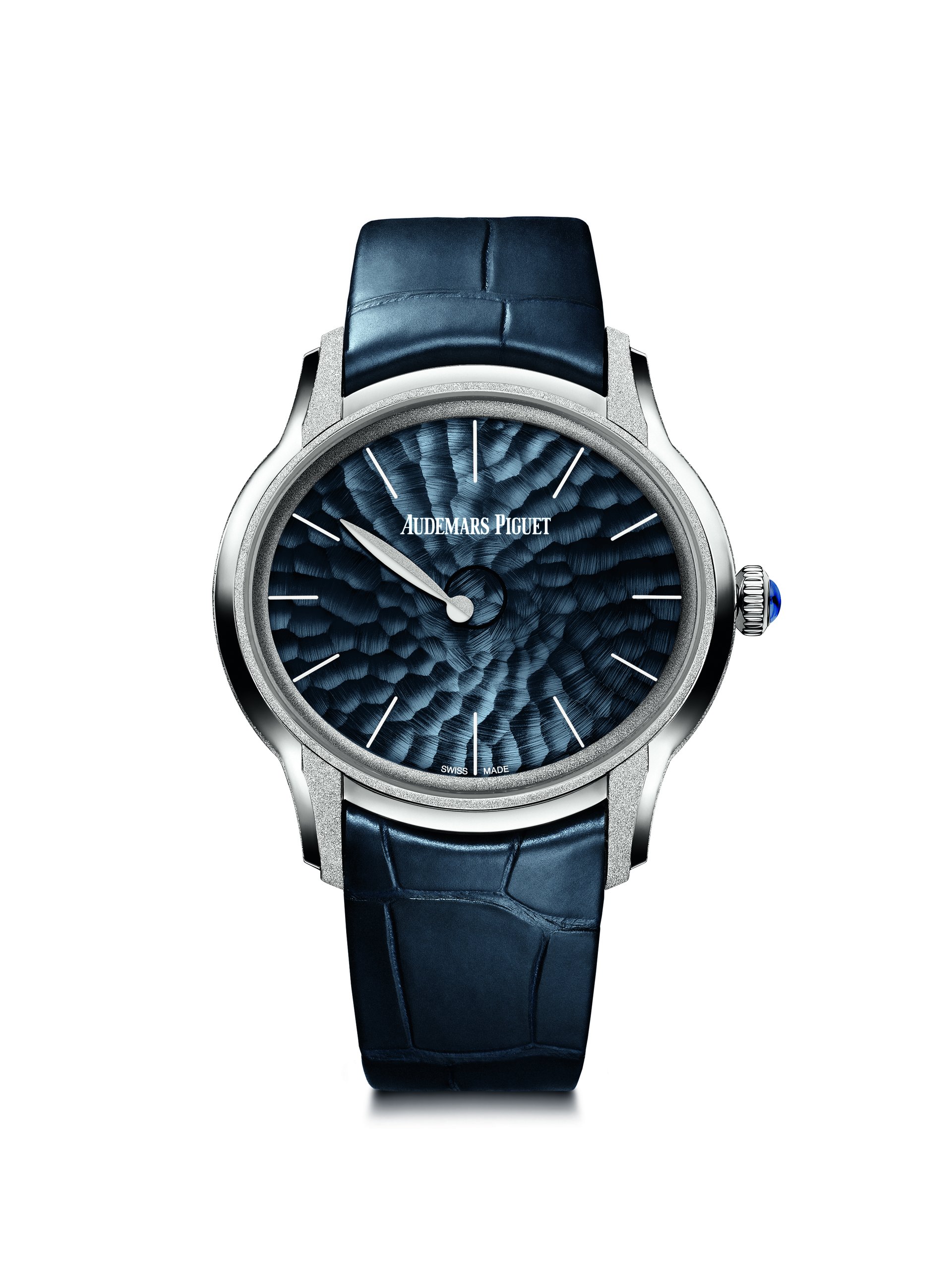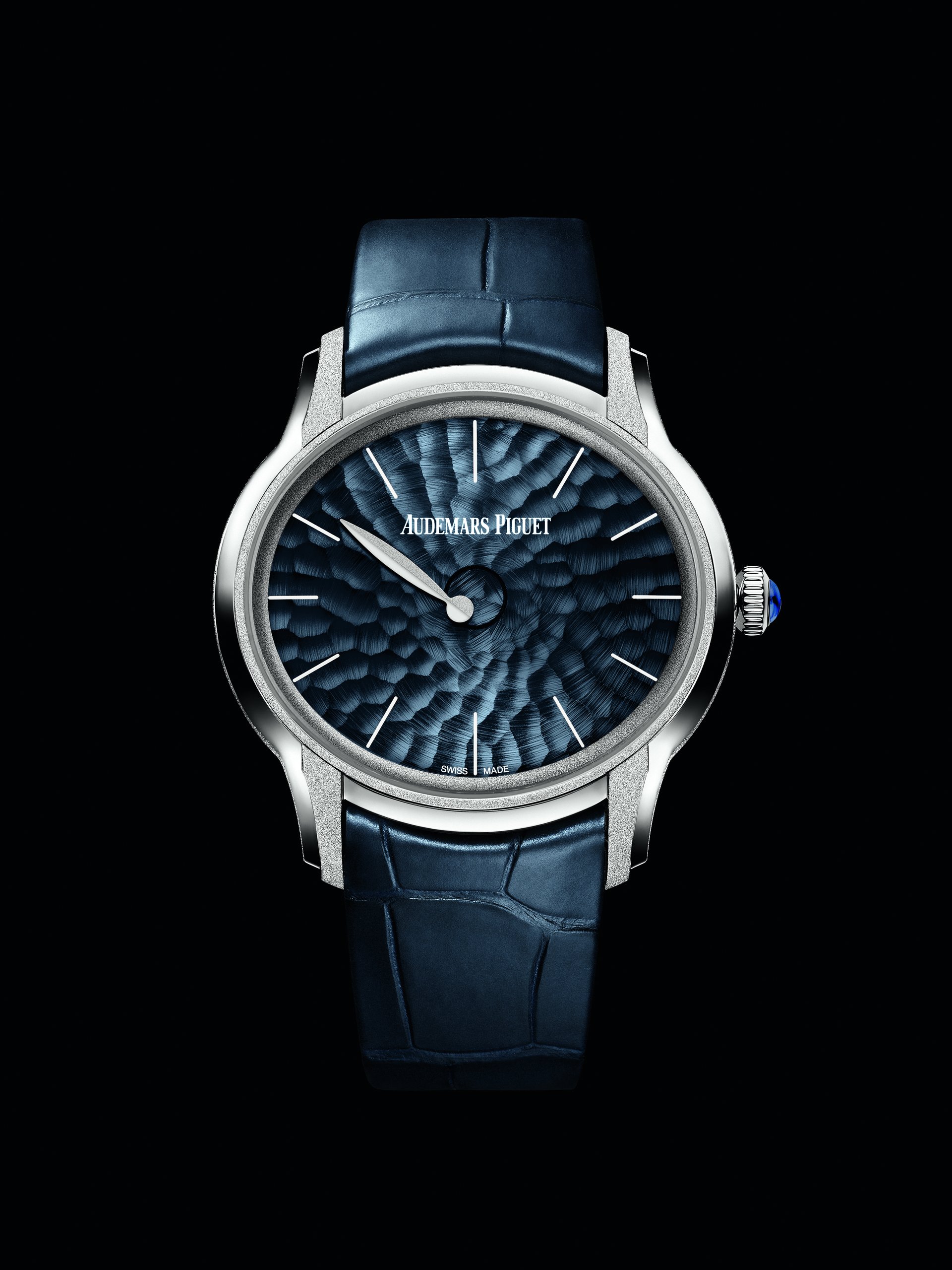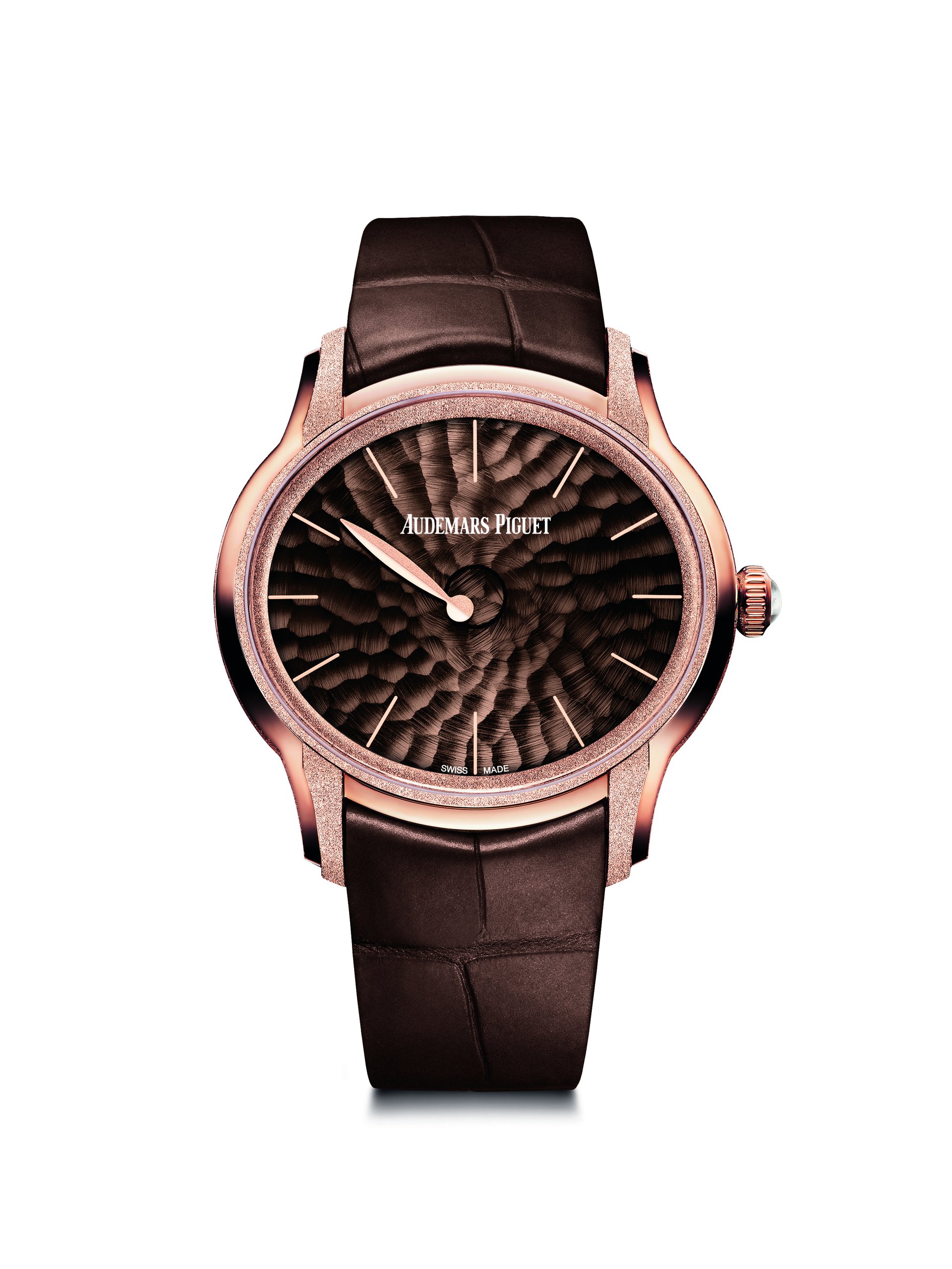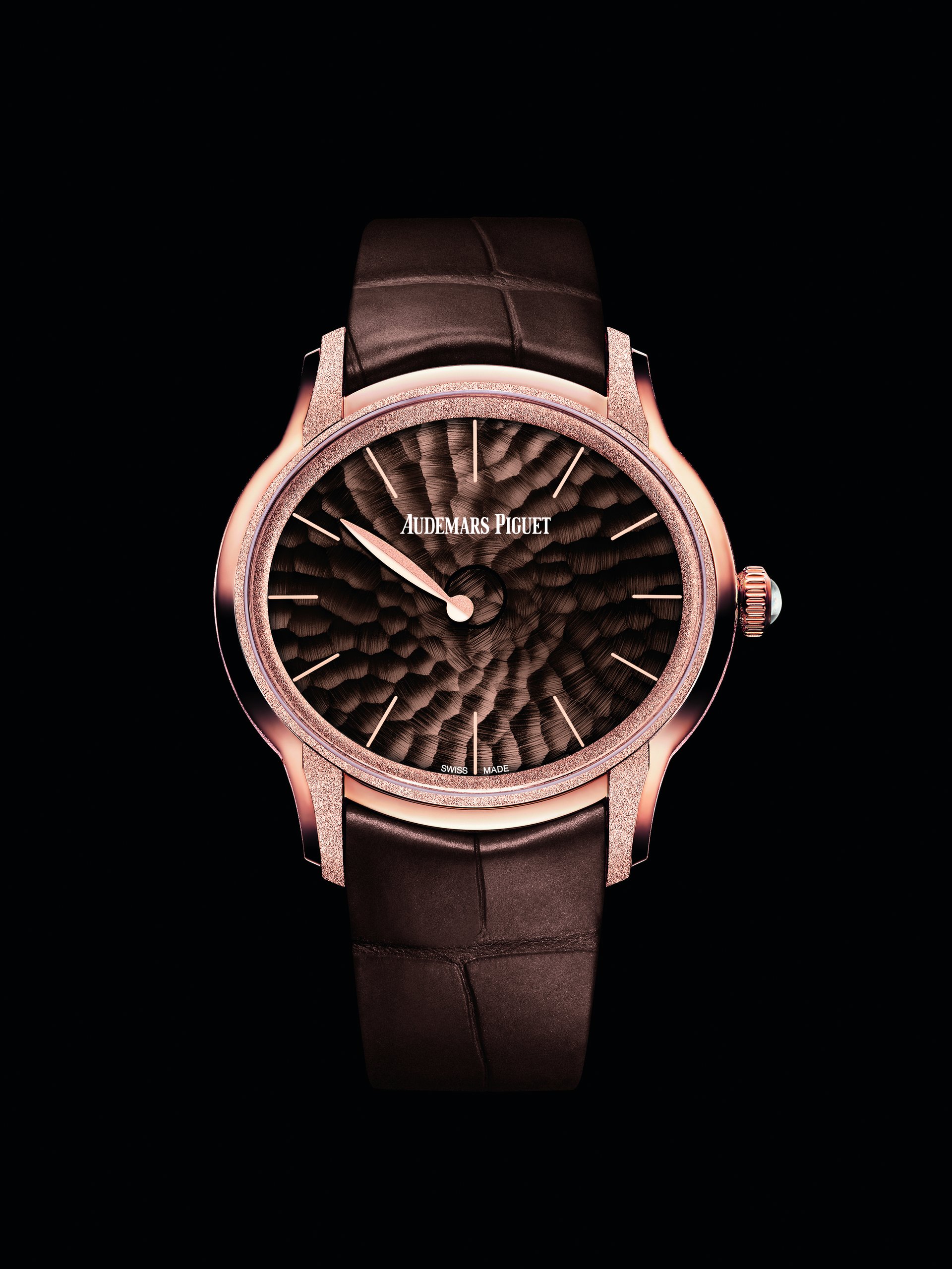 This abstract watch has been meticulously hand-finished by our watchmakers, in the highest respect of Audemars Piguet’s traditions. The 18-carat pink or white gold case presents alternating satin brushing and Frosted Gold finishing, a technique Audemars Piguet owes to Florentine jewellery designer Carolina Bucci. The diamond-dust effect it creates results from hours of meticulous micro-hammering.