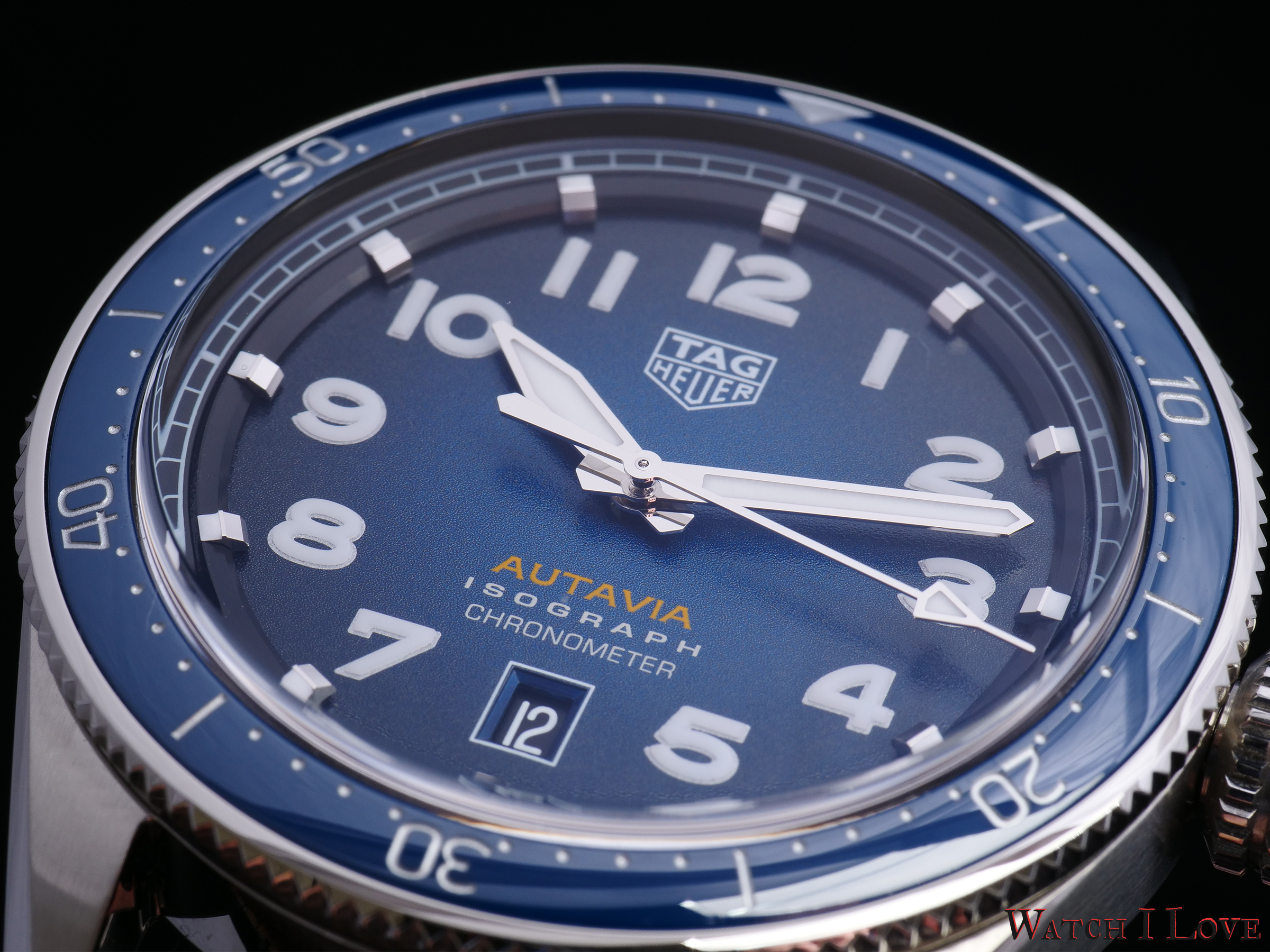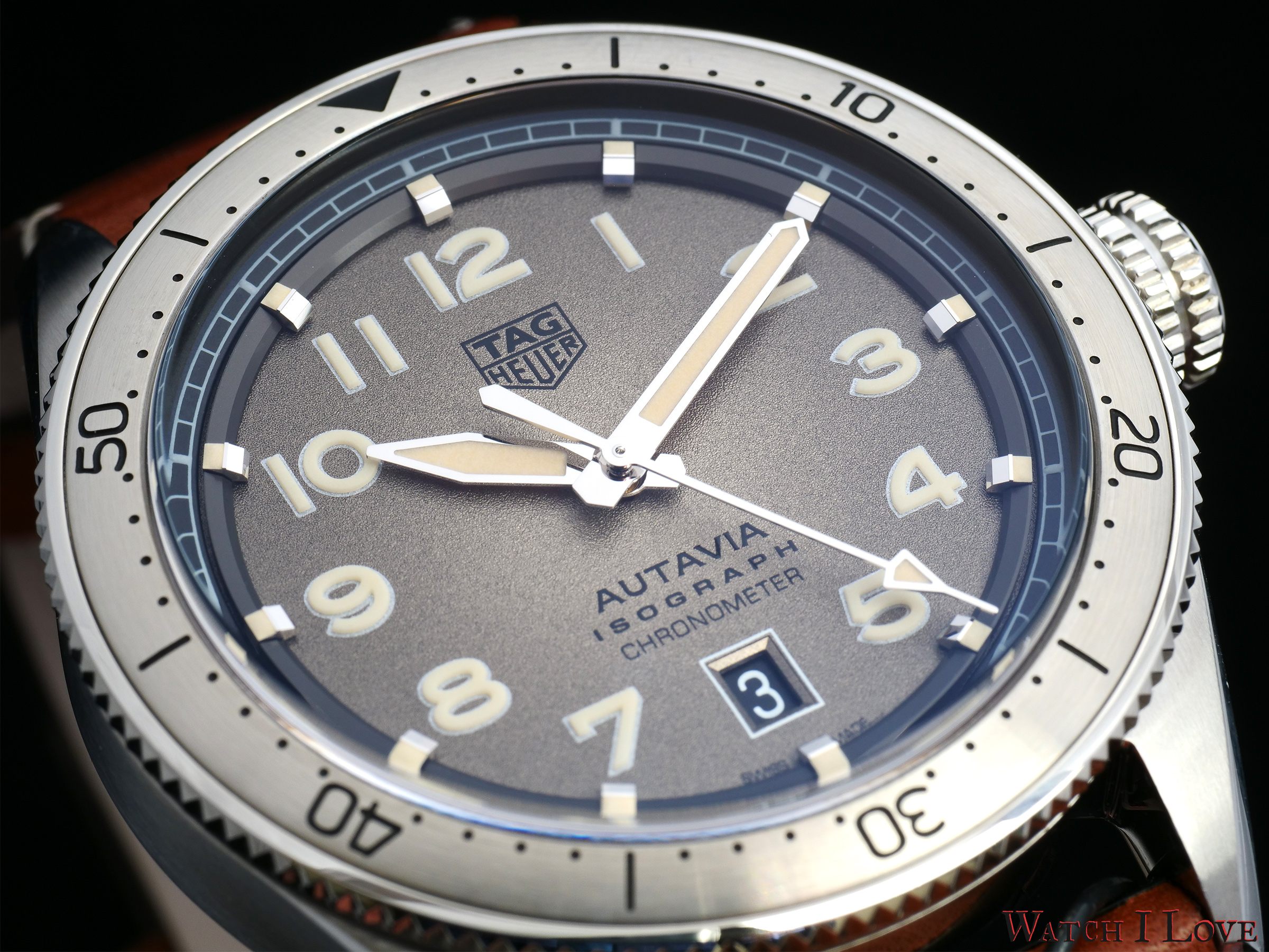 The case is covered by a bidirectional rotating bezel. Depending on the watch, the bezel insert is blue or black ceramic or stainless steel. The bezel’s minute/seconds register, including the 12 o’clock triangle is identically marked on all bezel variants. Autavia is fitted with a raised sapphire crystal with anti-reflective treatment.