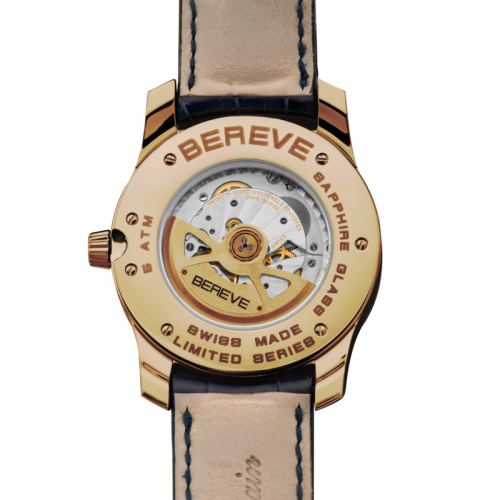 The Maison collaborates with the most prestigious Swiss manufacturers in the sector, and equips its timepiece with a calibre of the highest level, the “Vaucher 3002”, made entirely in Switzerland, adapted by the house to the construction specifications of Bereve Timepieces, with luxury treatments for bridges and gears and oscillating weight in tungsten, which are admirable thanks to the sapphire caseback. The 18k-4N gold case has a diameter of 42 mm and is completely made in Switzerland, equipped with two anti-reflective sapphire crystals, and water resistance of 5 ATM.
