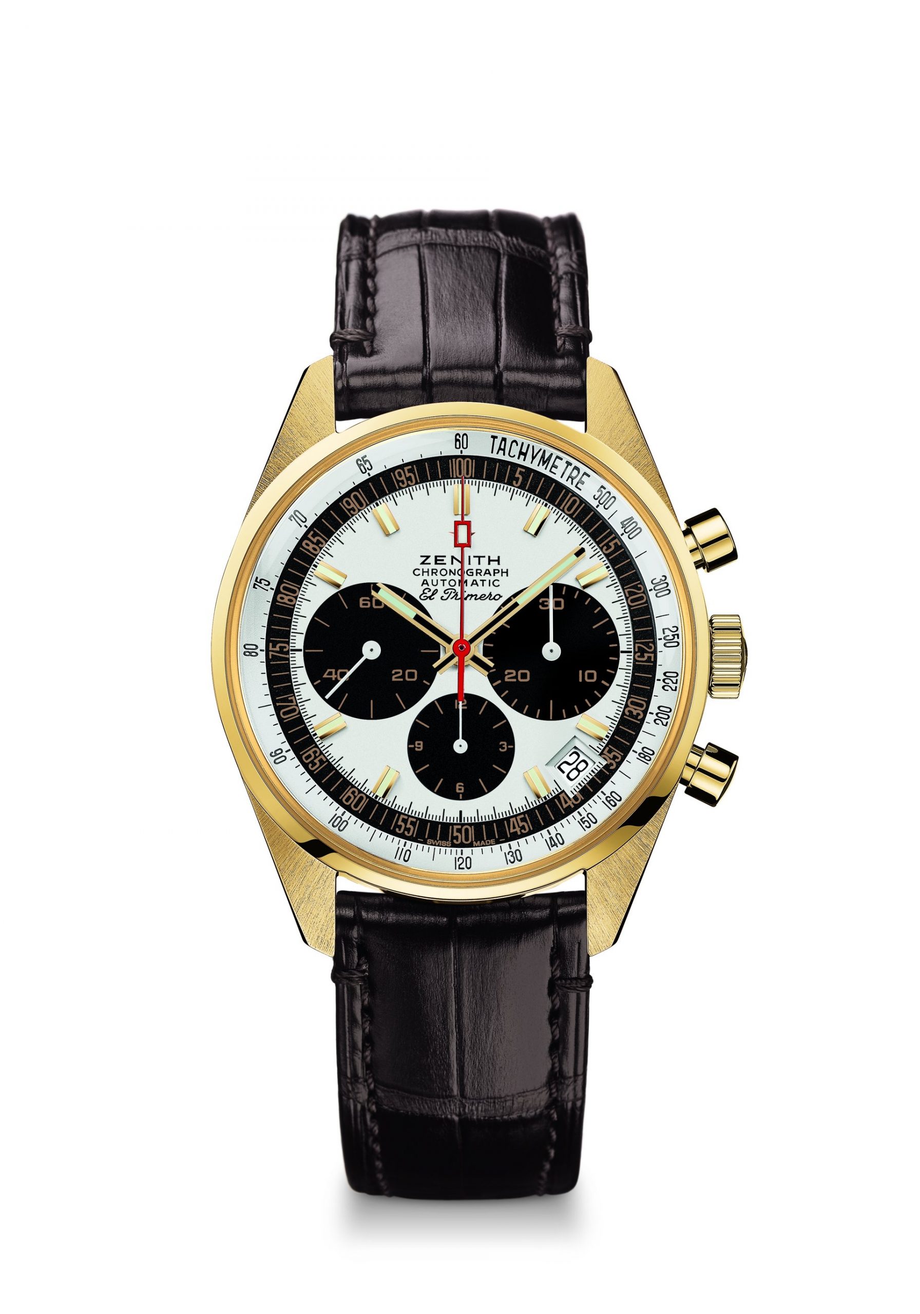 The Zenith Limited Edition El Primero Revival G381 is a faithful interpretation of the Swiss brand’s iconic timepiece. With its yellow gold 38mm case, white lacquered dial with overlapping black “Panda” subdials, and slightly smaller chronograph pushers and crown, the Zenith El Primero Revival G381 pays homage to the original watch born alongside the revolutionary El Primero movement. Housed inside this limited edition is the Zenith calibre 400 El Primero chronograph movement, visible via the sapphire caseback. The caliber 400 is the modern iteration of the same high-beat heart that powered the original G381 in 1969. Like the original El Primero, the caliber 400 is a fully integrated column-wheel chronograph movement that ticks at 5 Hz and has a power reserve of 50 hours.