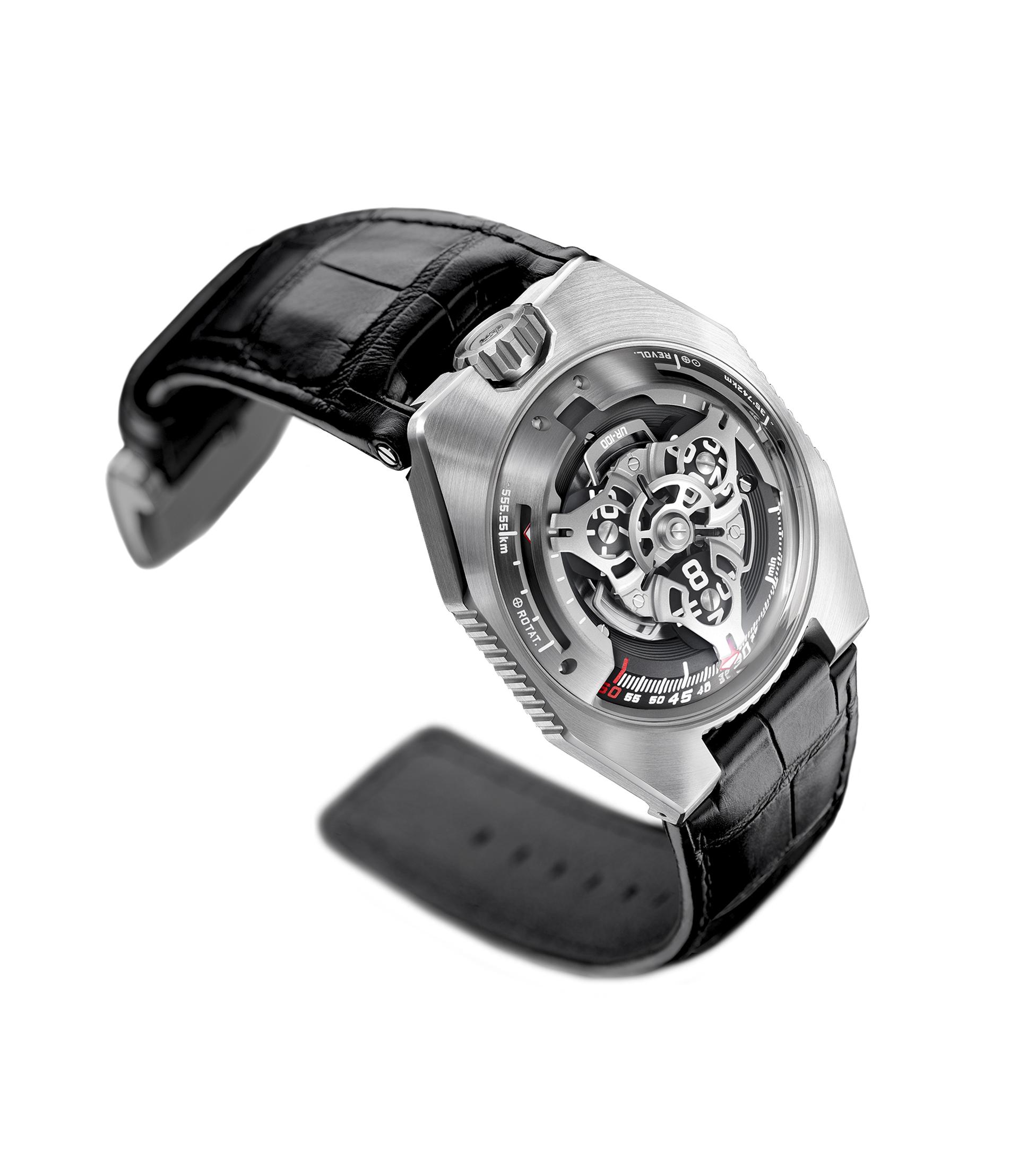 The UR-100 takes us on a journey through both time and space, two concepts at the very core of URWERK. Using its orbiting satellite hours and minute hands, the UR-100 displays both time (hours and minutes) and space (distance travelled), merging these two concepts in the creation of the all-new UR-100 SpaceTime.