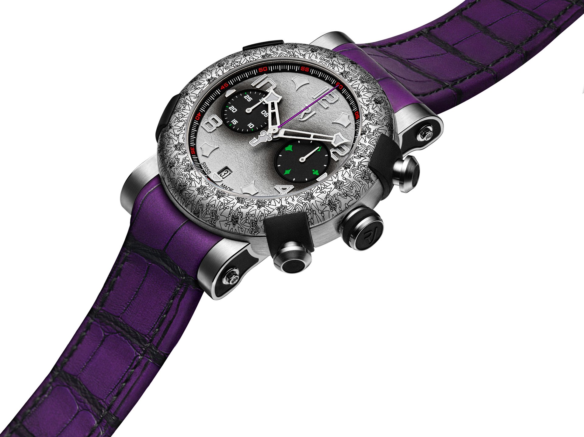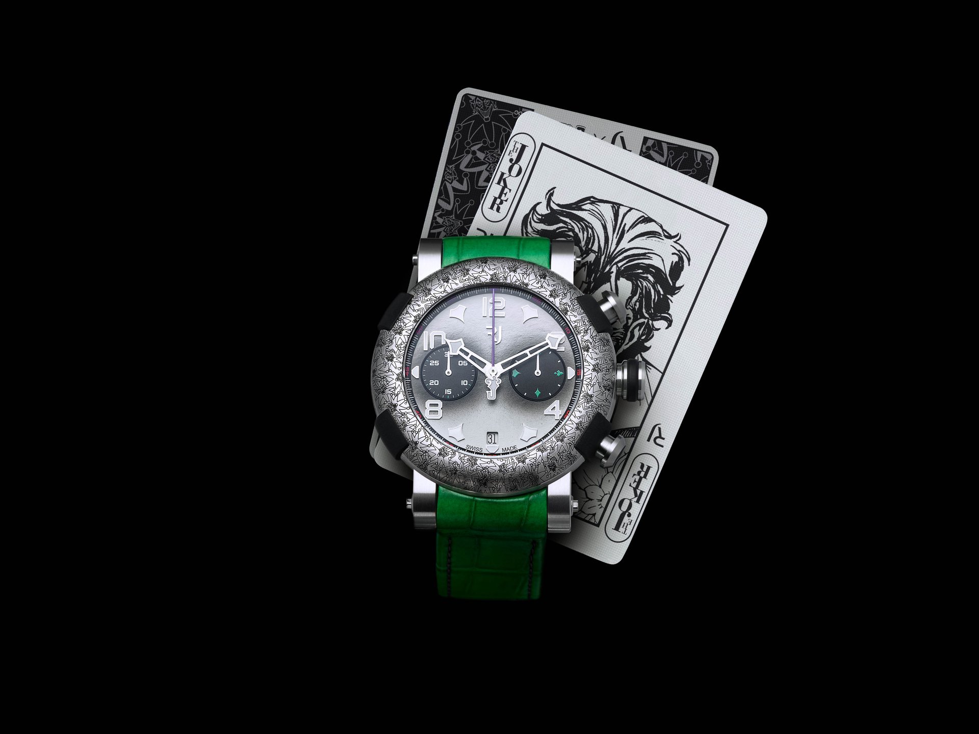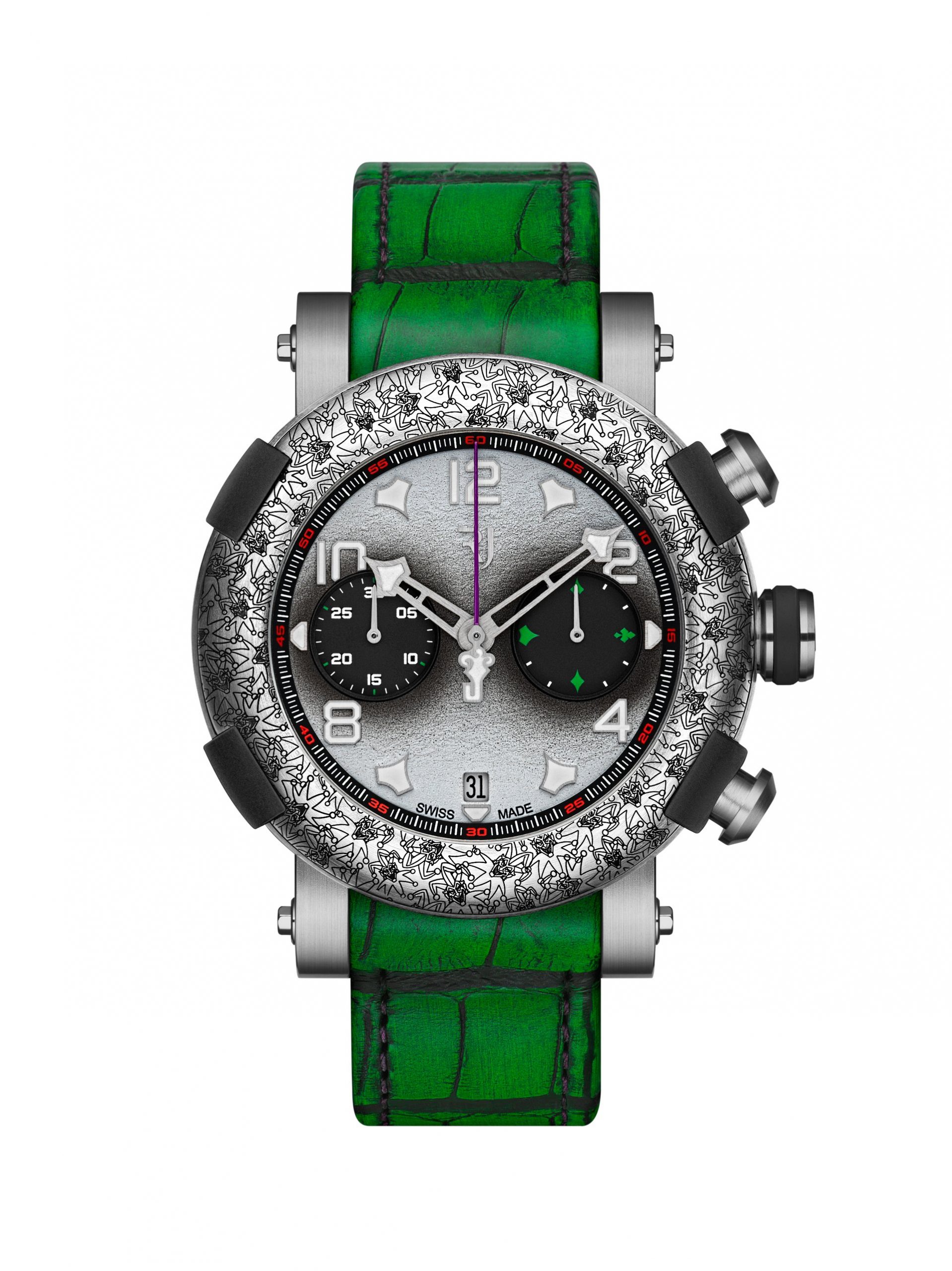 The Joker chronograph, limited to only 100 pieces, is inspired by the criminal mastermind and perfectly reproduces the aesthetic of the comic Super-Villain.