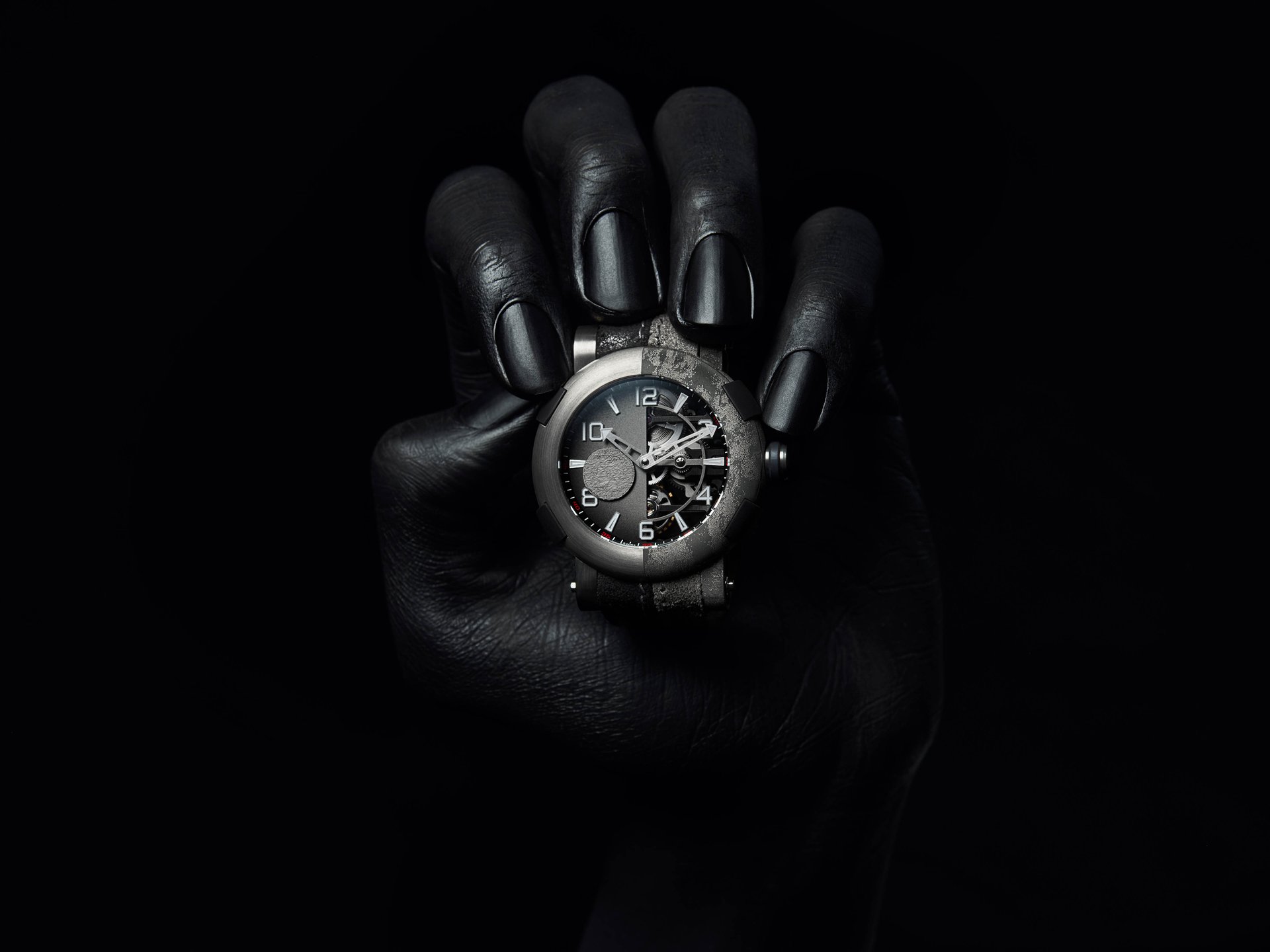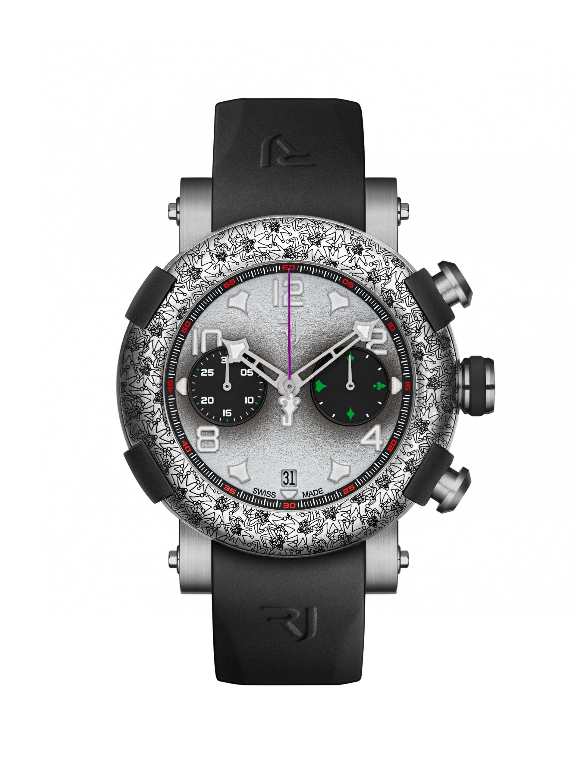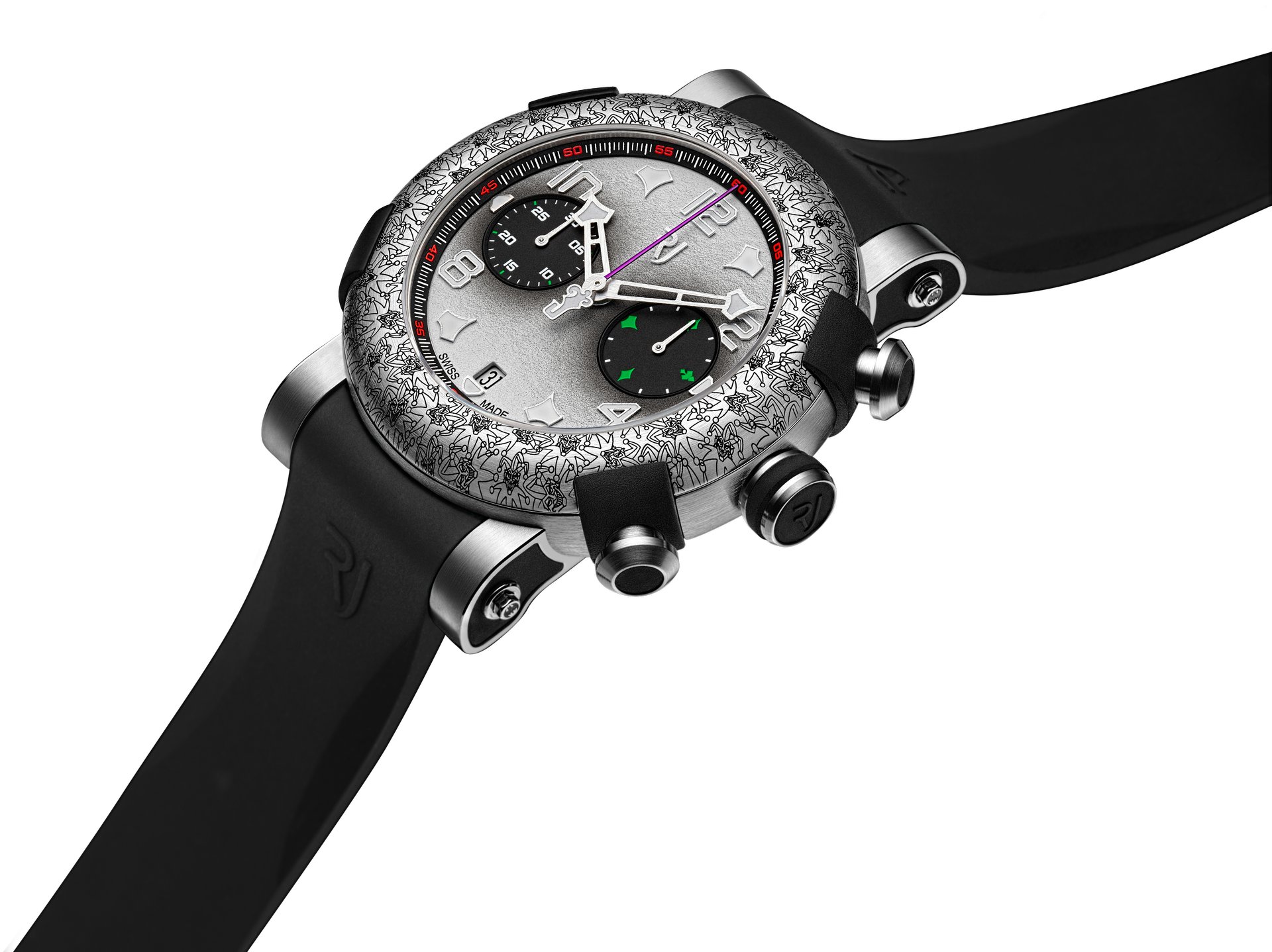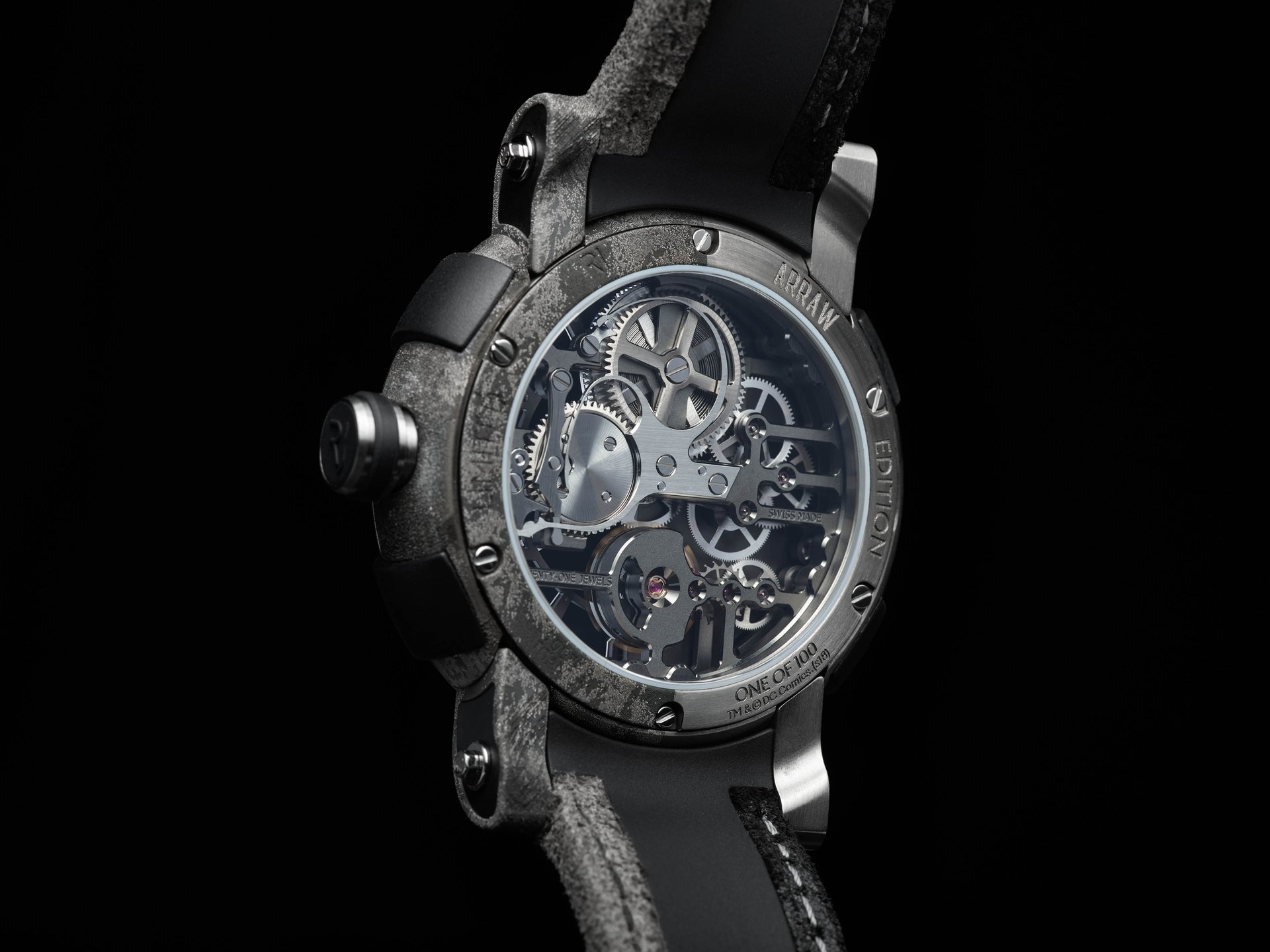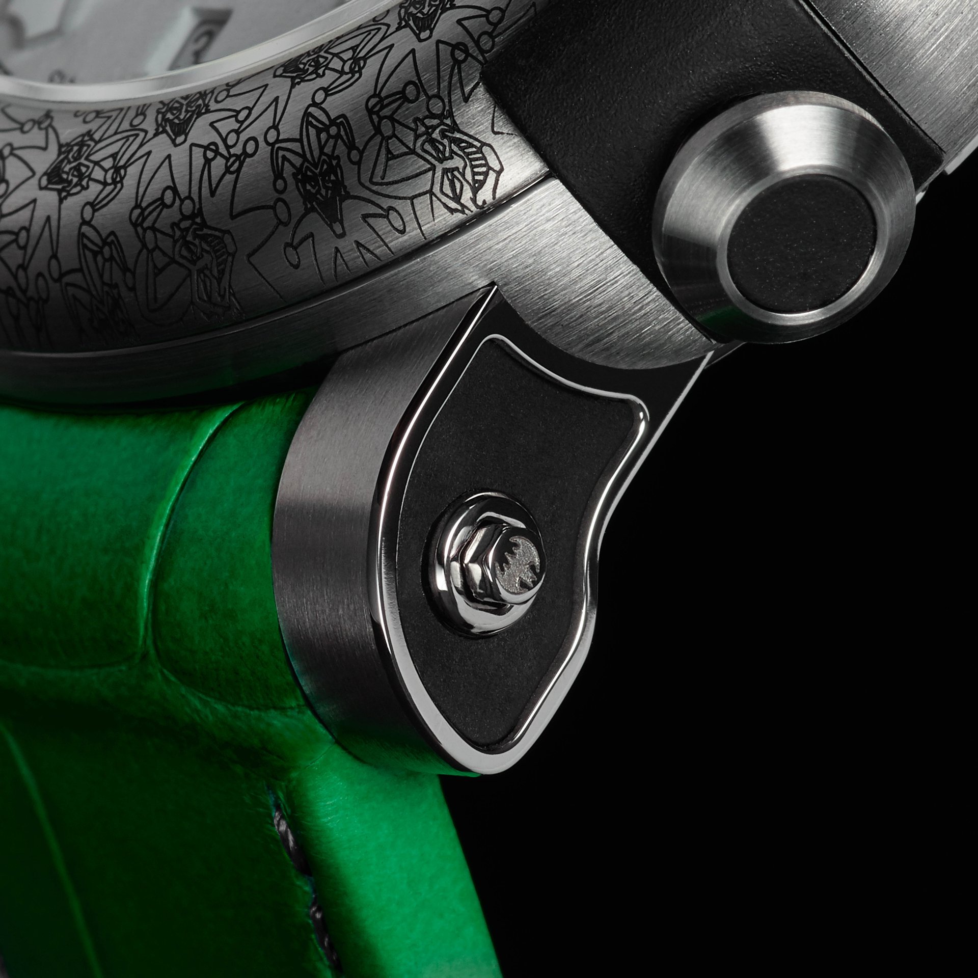 Distinguishable thanks to the iconic rubber RJ BUMPERS™, and neatly-shaped lugs, the 45 mm ARRAW case is crowned by a titanium bezel that is laser engraved with an intentionally chaotic The Joker motif. The ARRAW hands are also uniquely stylized with playing card “Aces” at their tips. The back of the titanium case features a bold laser-engraved portrait of the Joker himself.