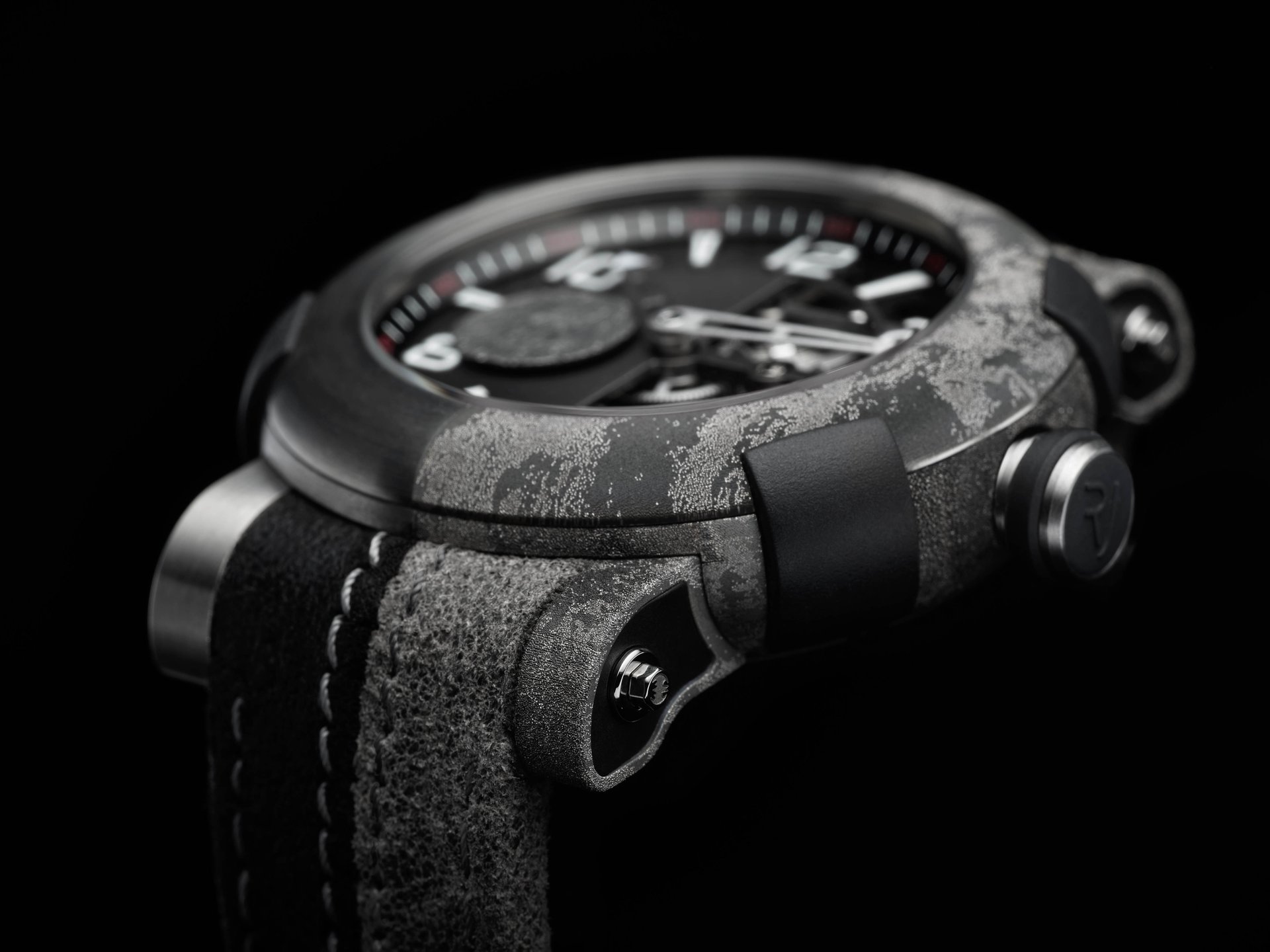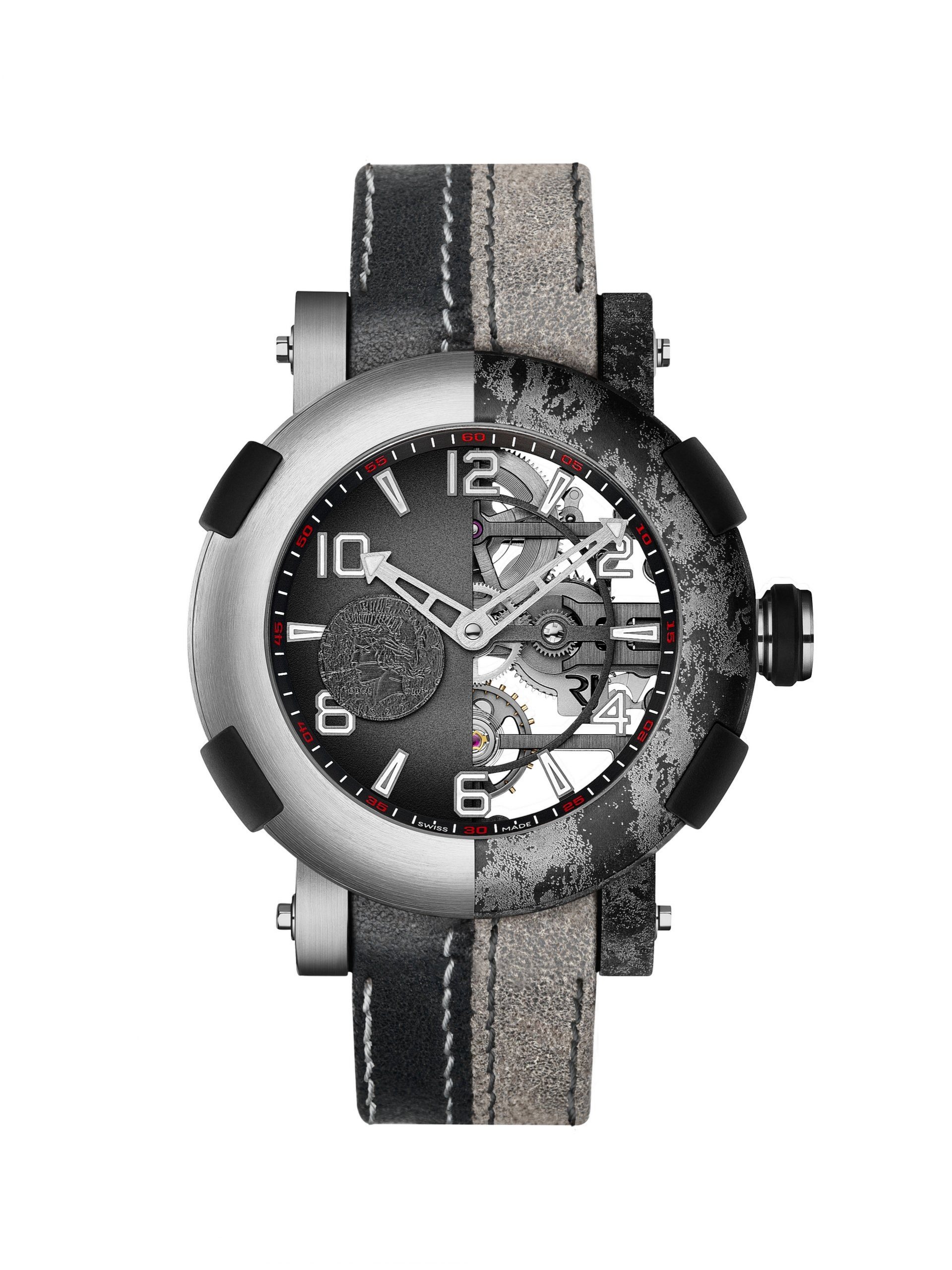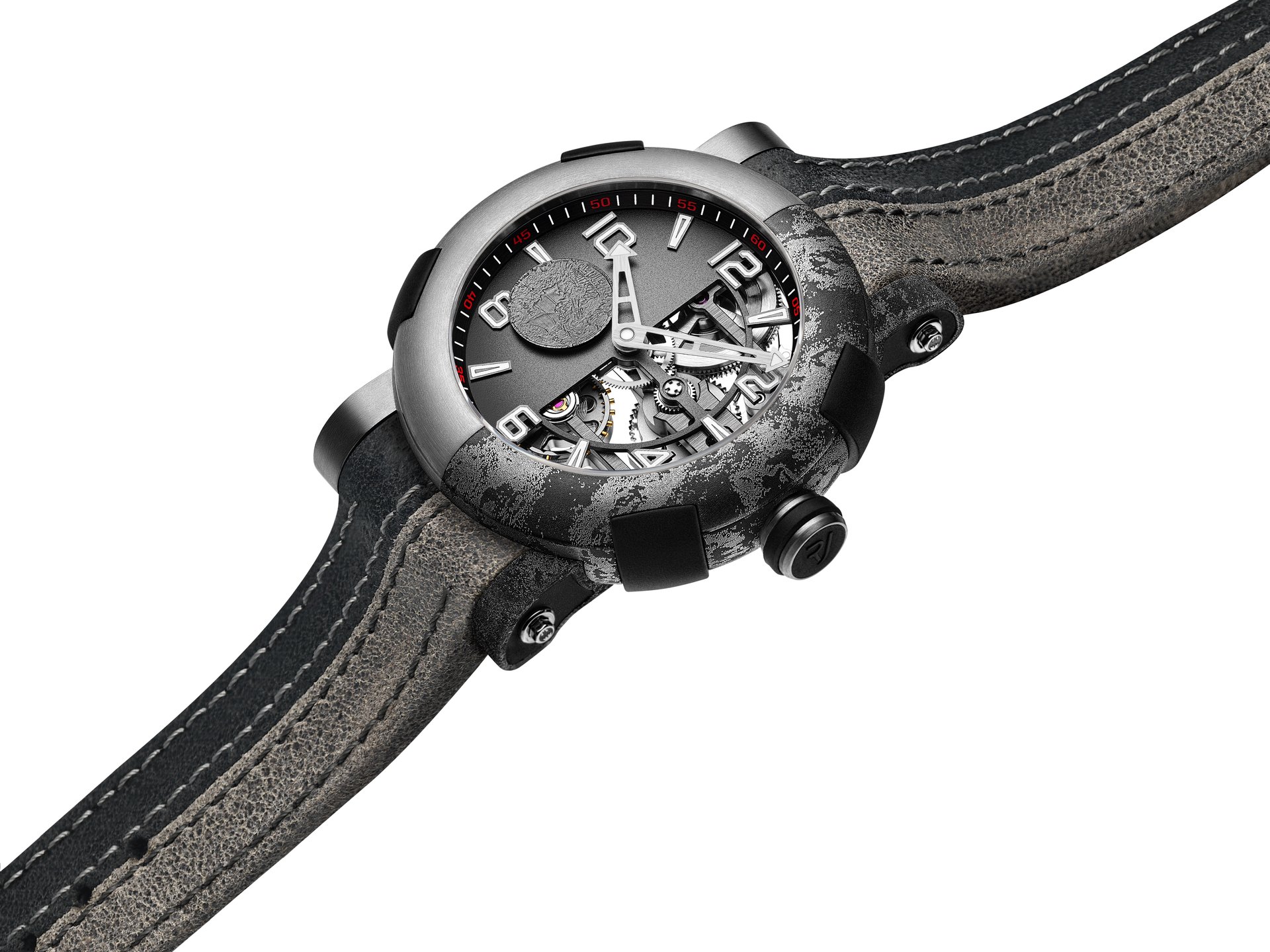 The half-exposed manual skeleton movement sits within a circular, satin-brushed 45 mm titanium ARRAW case sporting the iconic features of RJ watches, including the four RJ BUMPERS™ made of rubber, contrasting lugs and arrow-shaped hands.
