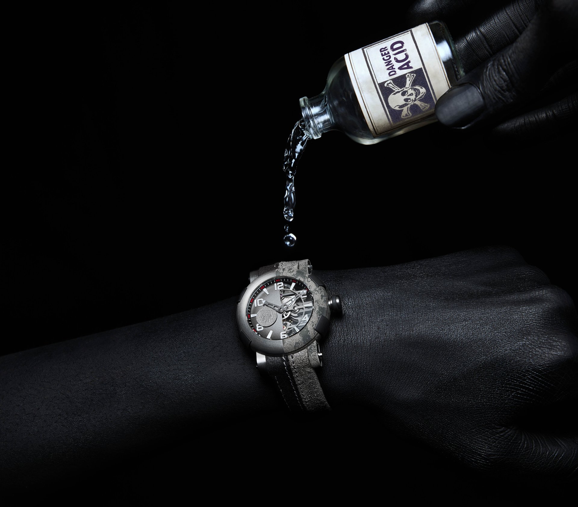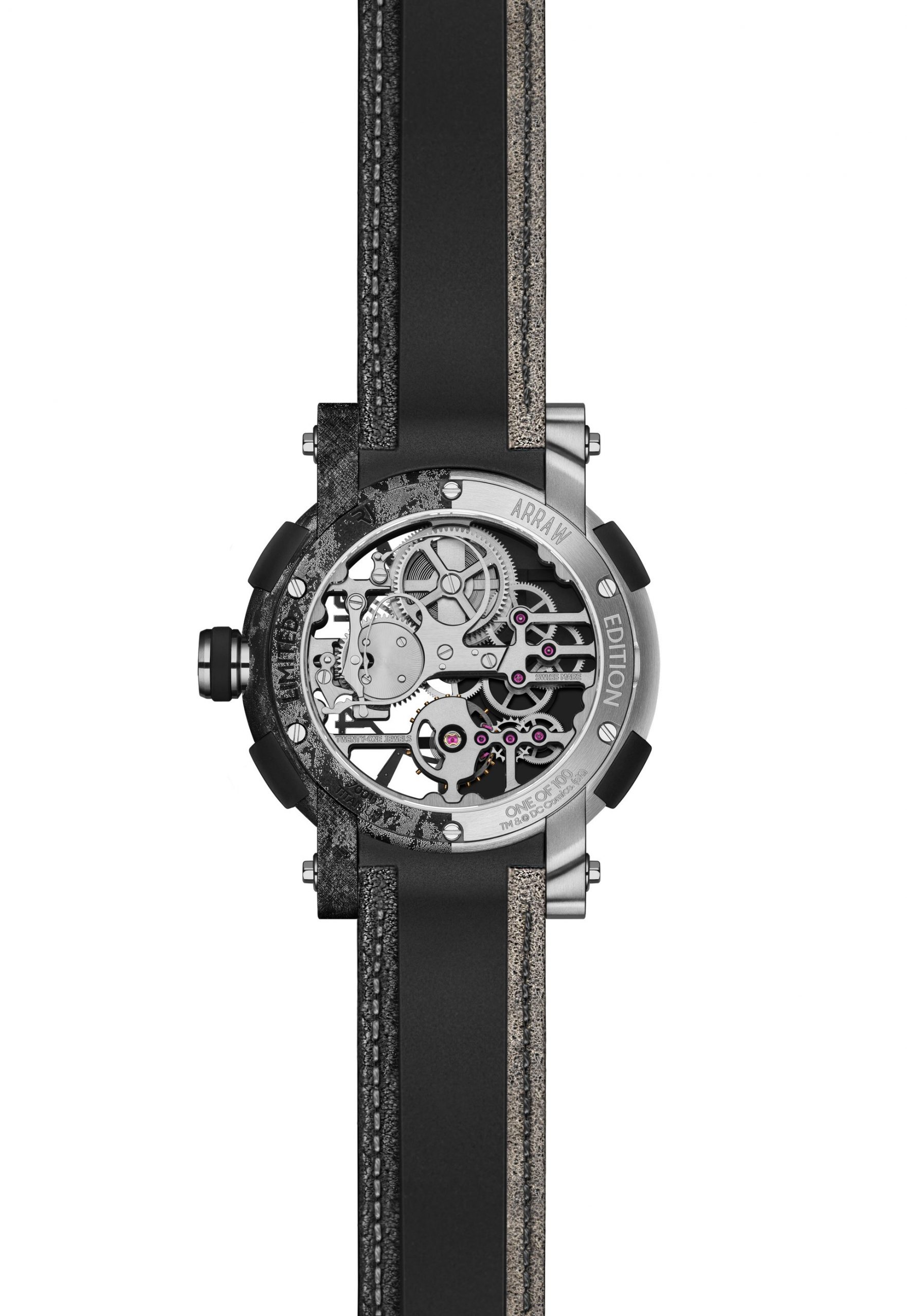 Like the watch itself, the calf leather strap is designed to have one clean and one distressed side. The straps that come with the ARRAW Two-Face can easily be swapped by simultaneously pressing the screws with the Batman logo on the watch lugs.