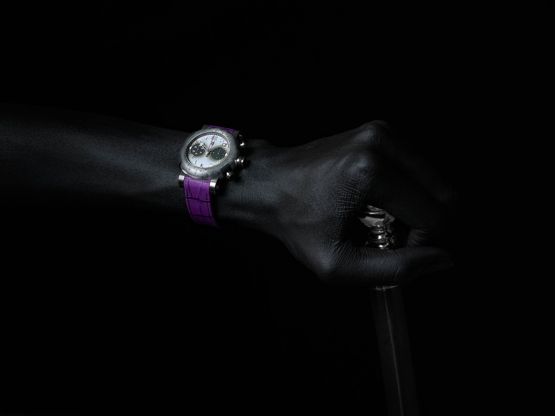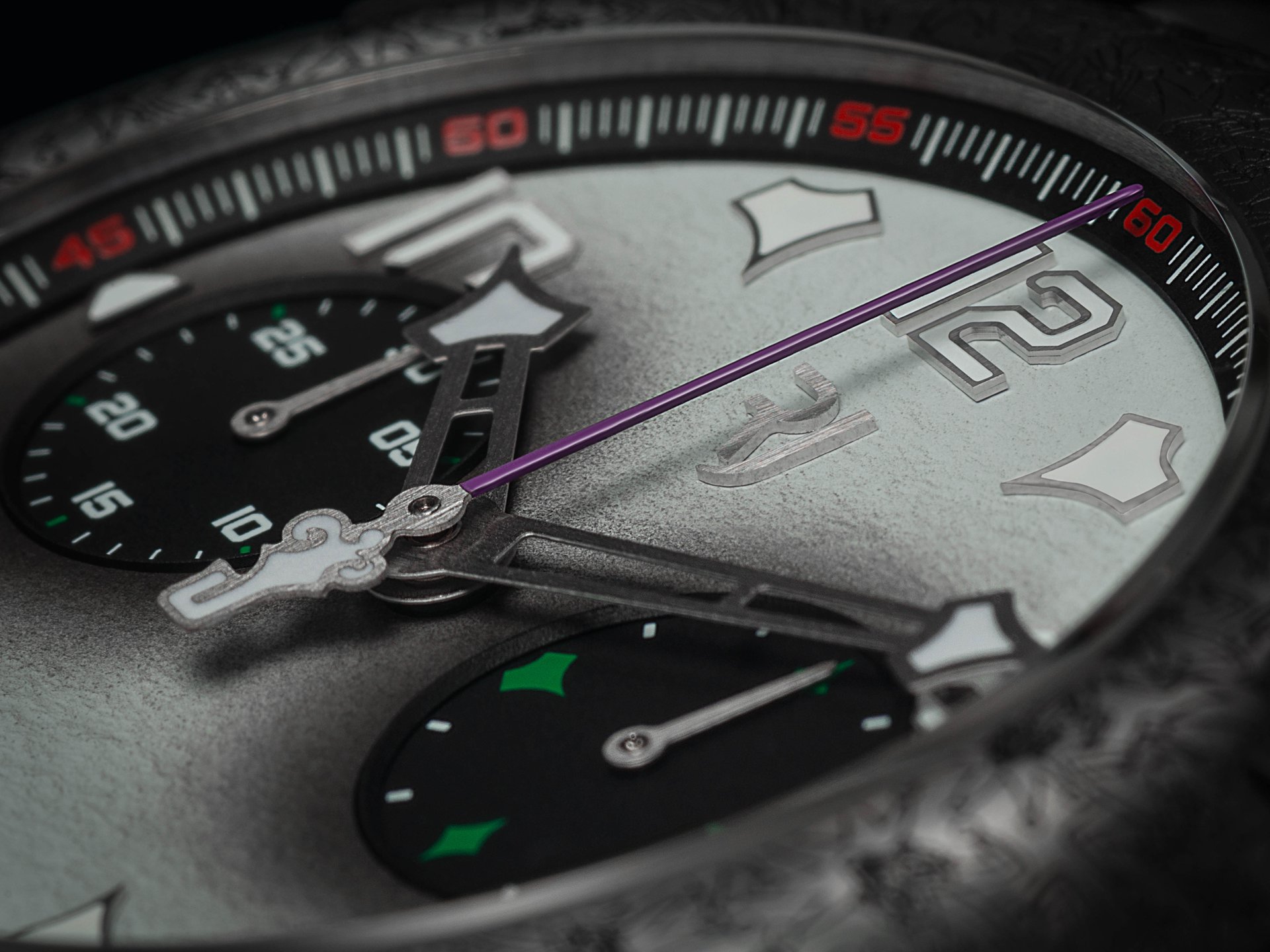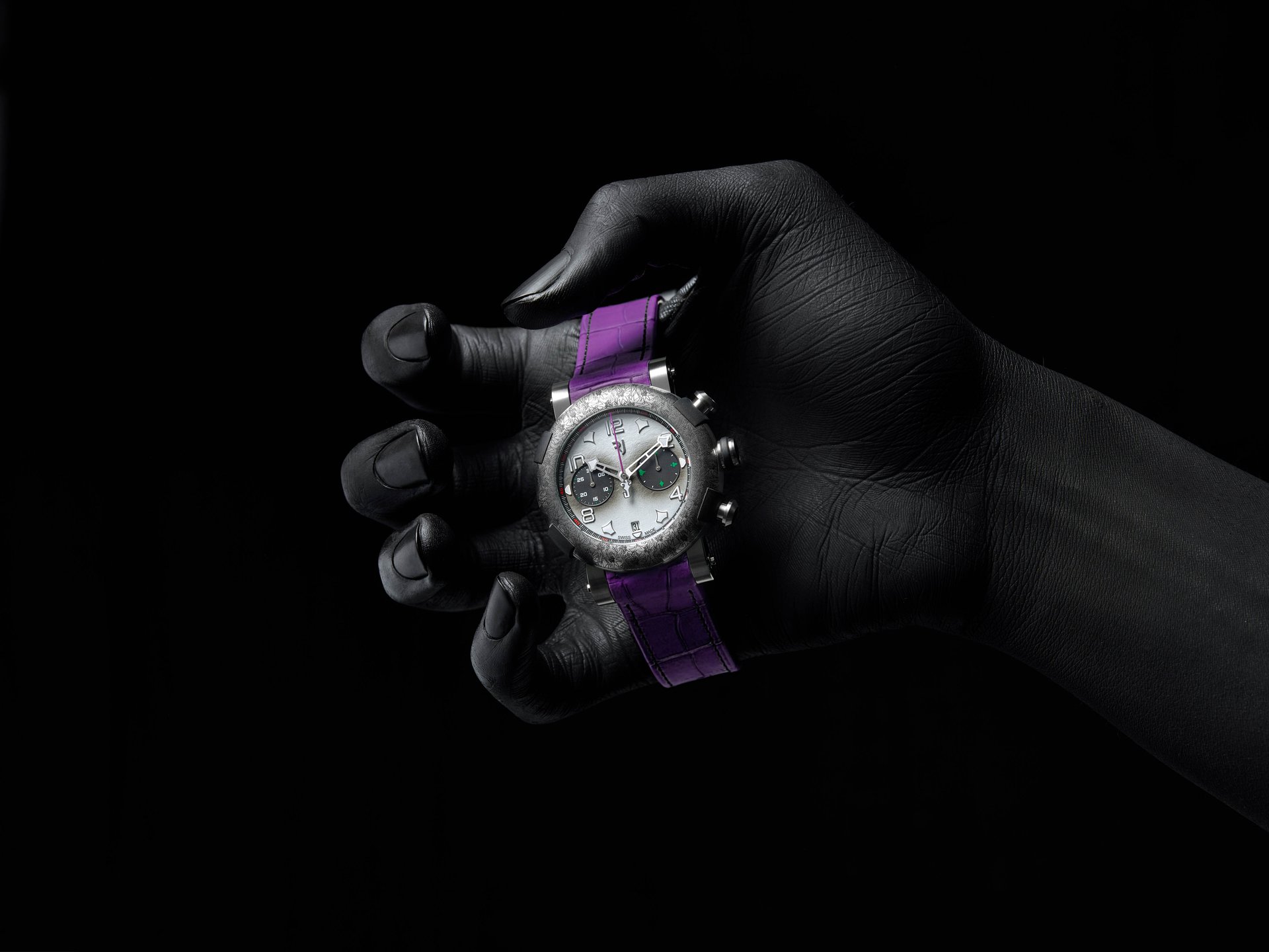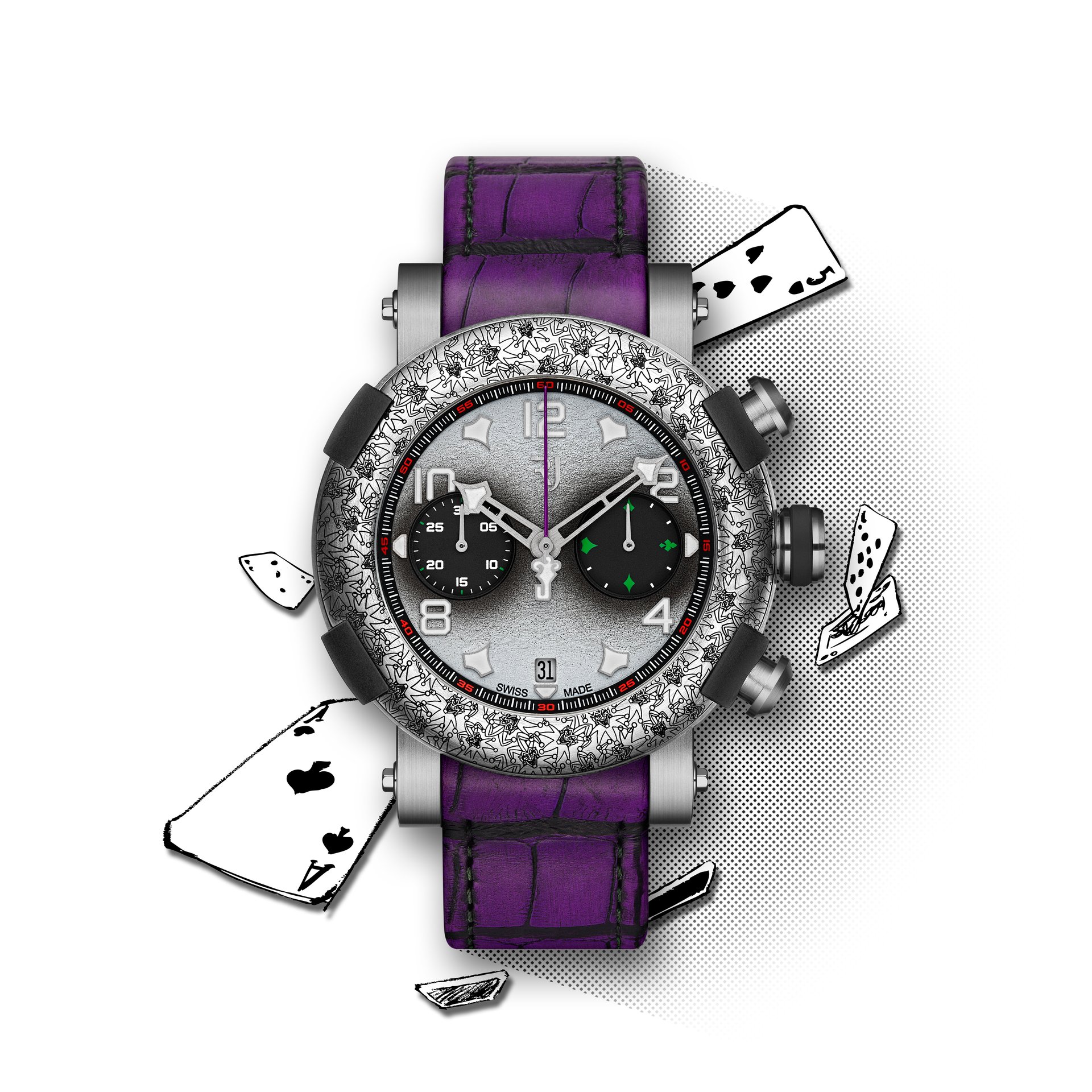 Rhodium-plated and satin-brushed with “green emission” SuperLuminova. Central chronograph hand in « The Joker » purple color and featuring the character’s logo.