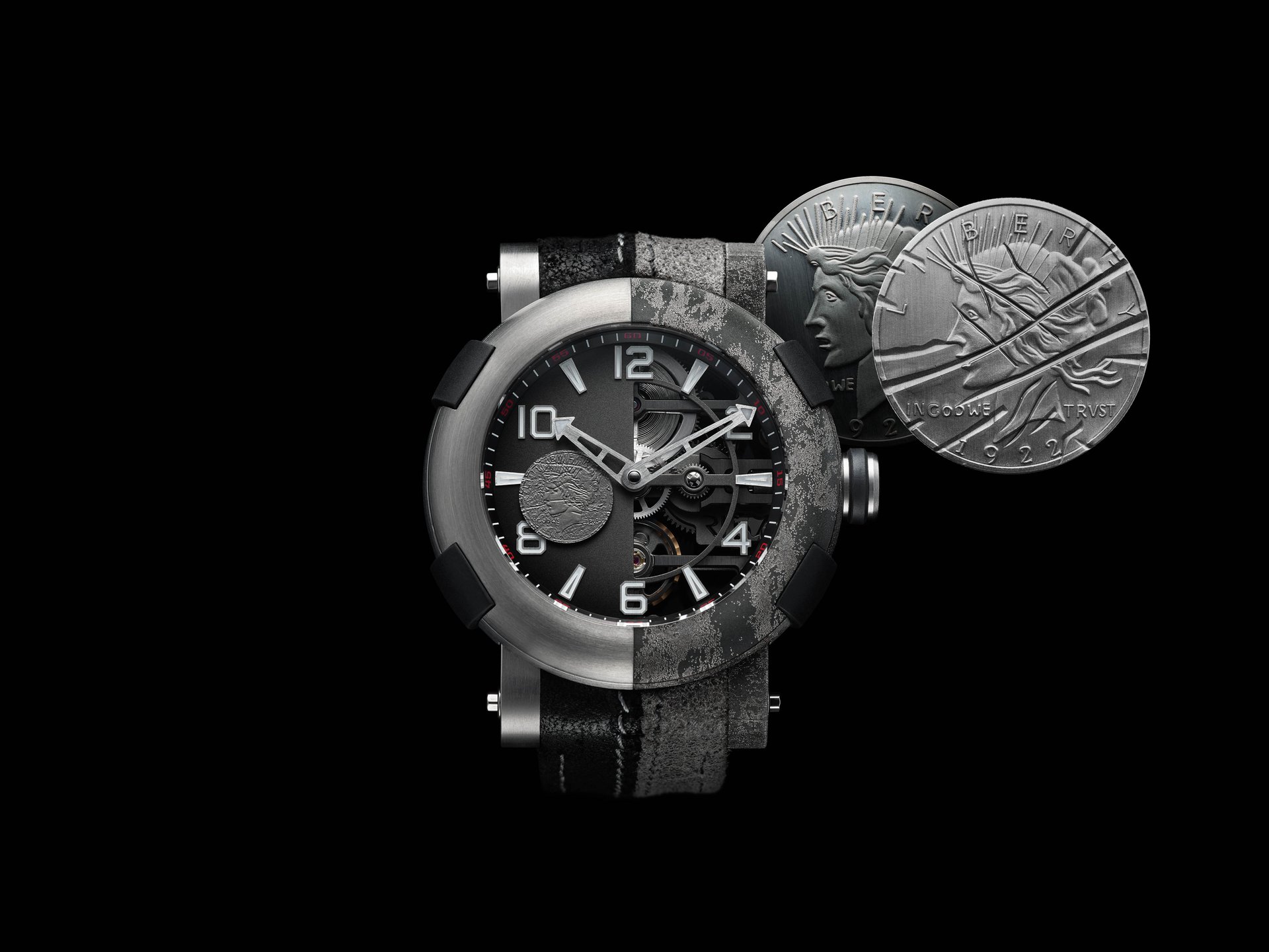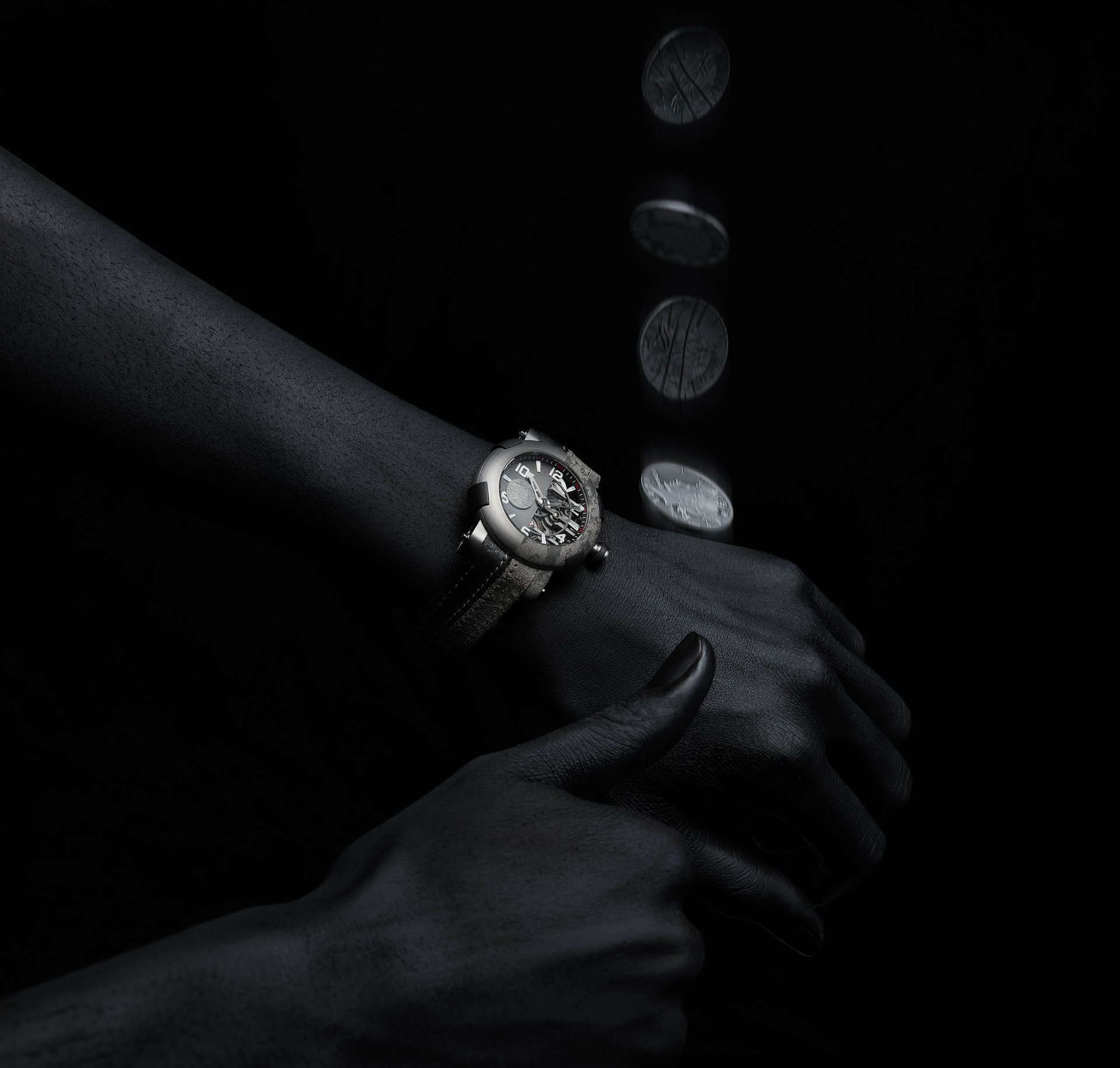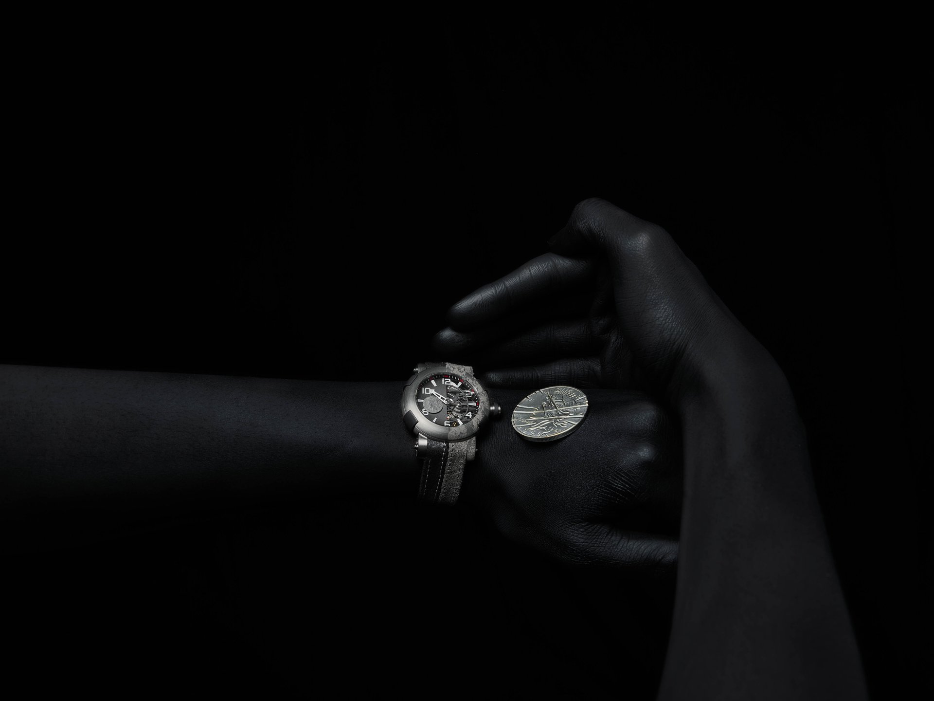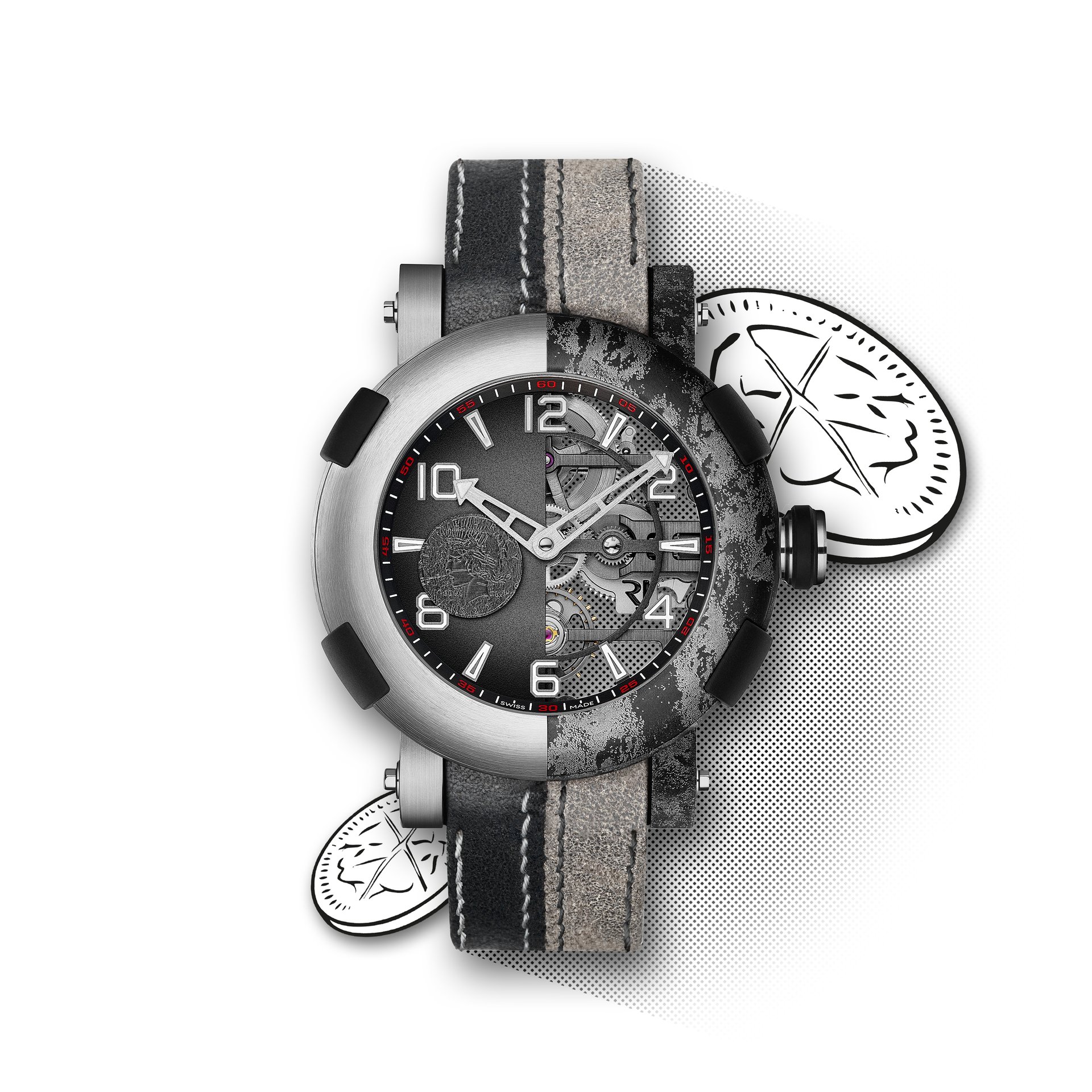 RJ designed the ARRAW Two-Face to be instantly recognizable with a distressed outer bezel, in which the laser-engraved titanium bezel and calf leather strap have been intentionally structured along the right-hand side to echo the symmetrical disfiguring of Two-Face. The clean, structured left side carries a laser-engraved coin, which Two-Face famously flips to make life and death decisions. On the watch, it serves as a rotating second hand.