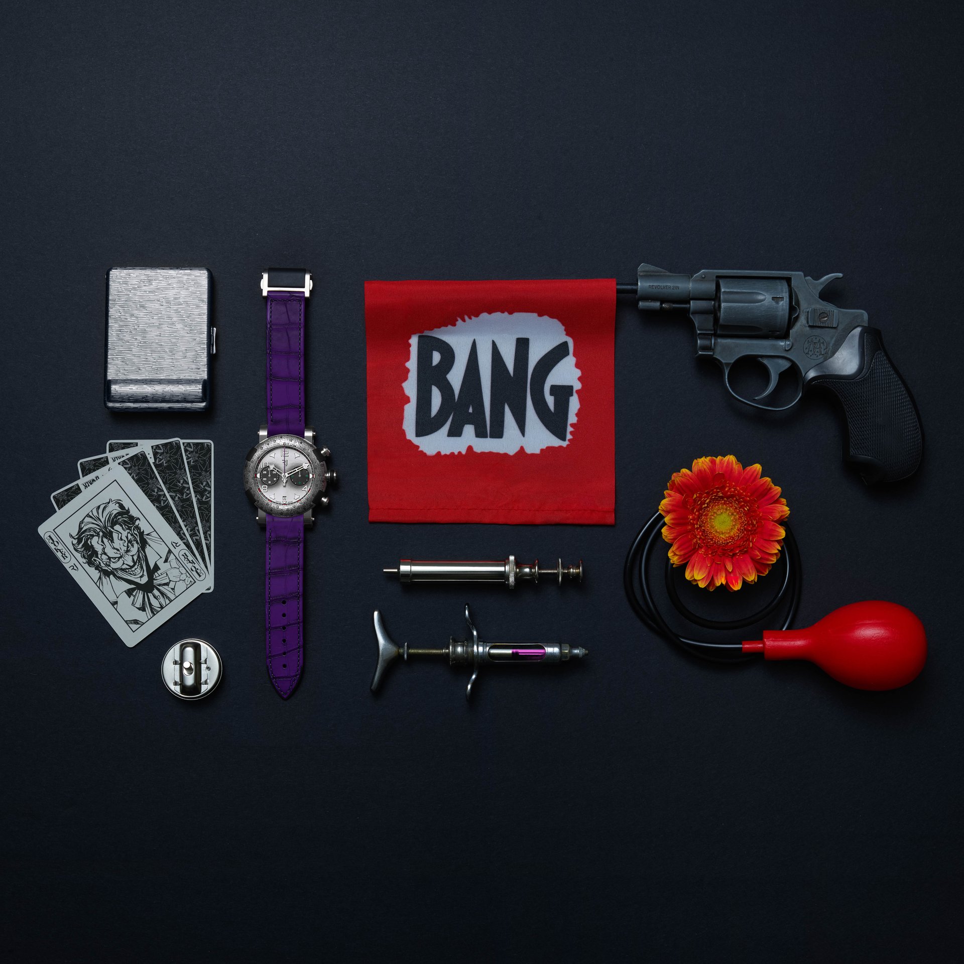 Design cues from his flamboyant character appear through the watch, from his lethal razor-tipped playing cards to his striking facial make-up. The dial itself is a stylistic reinterpretation of The Joker’s face, with a finish that is intricately airbrushed to evoke the make-up of the Gotham villain.