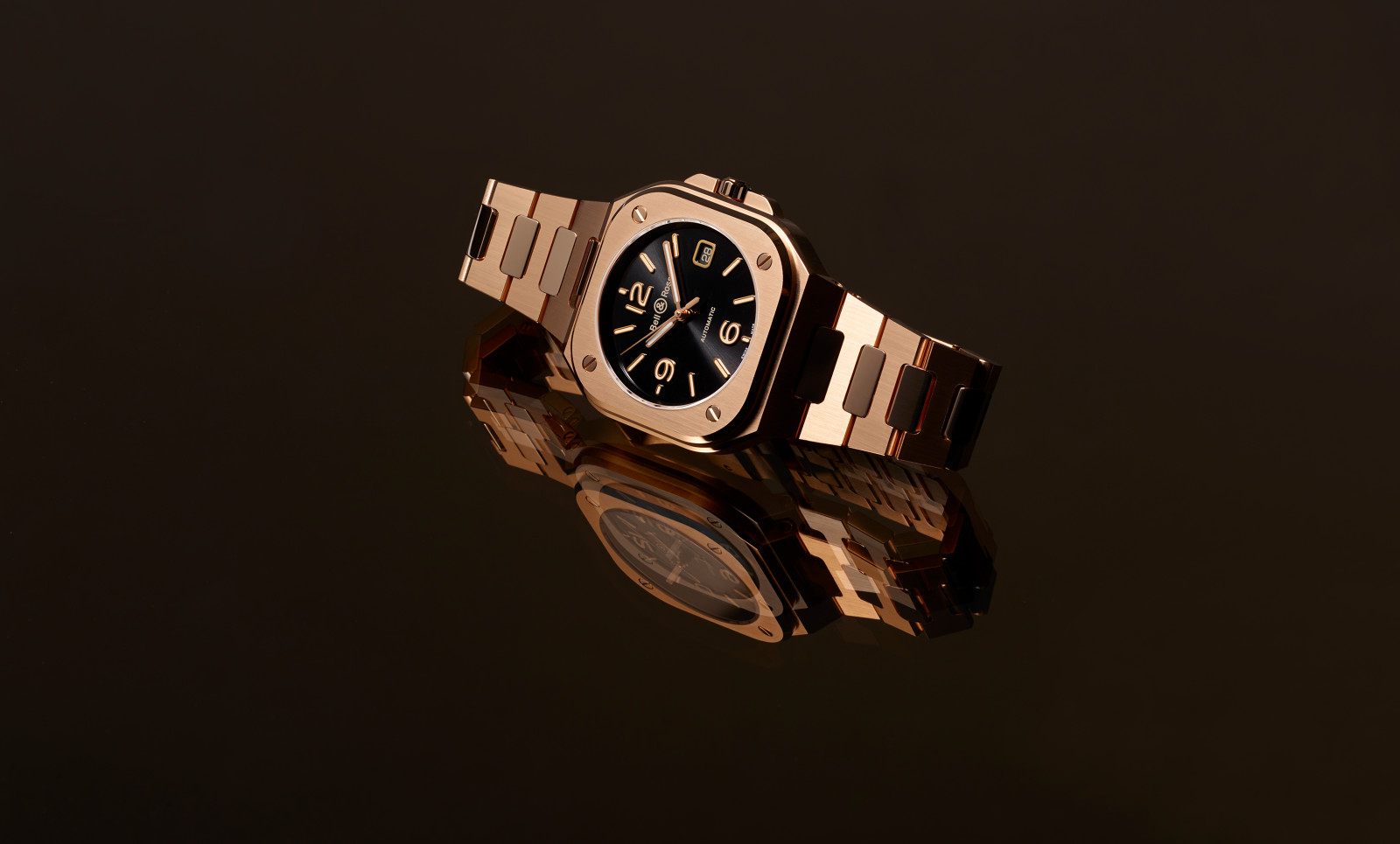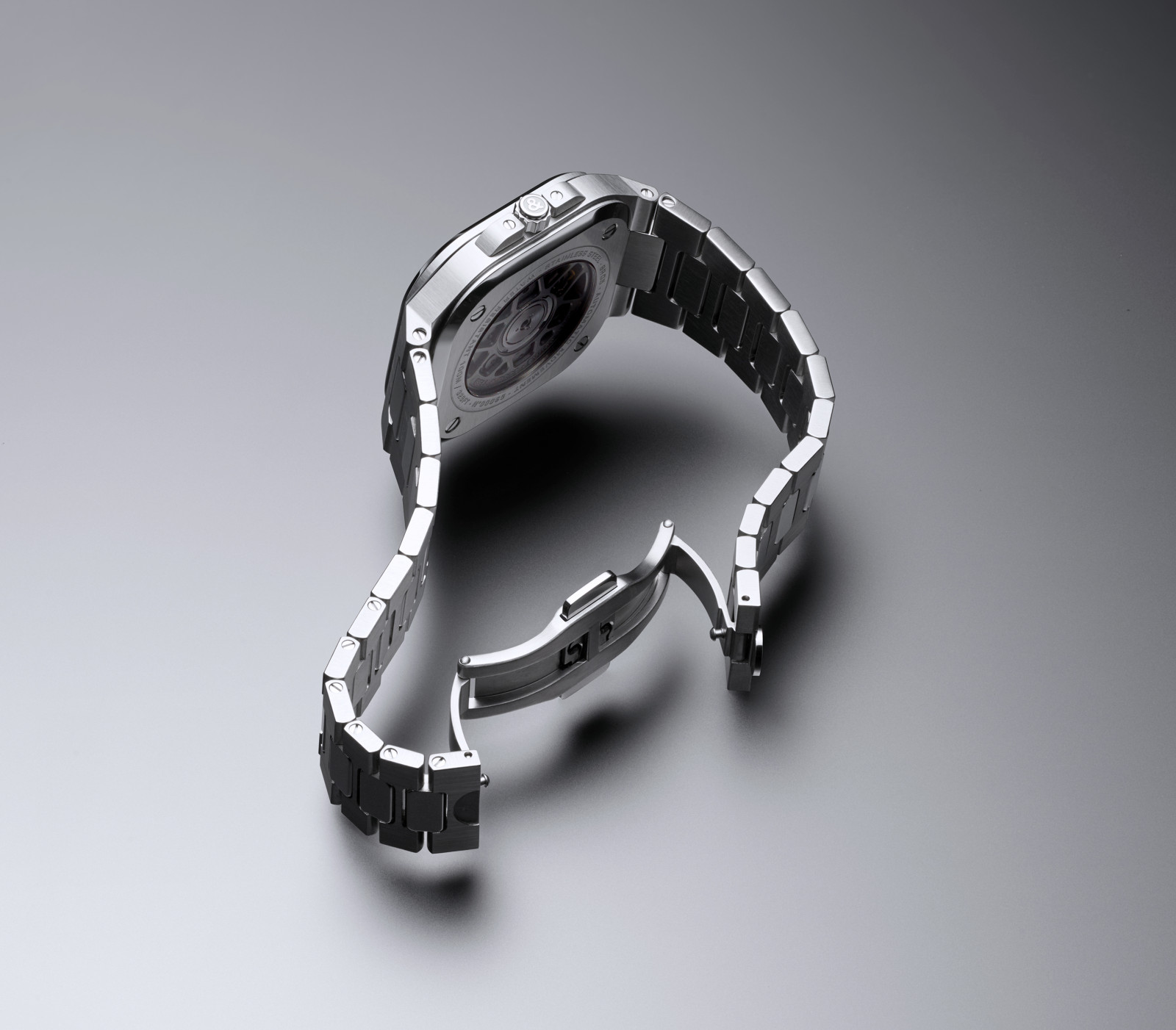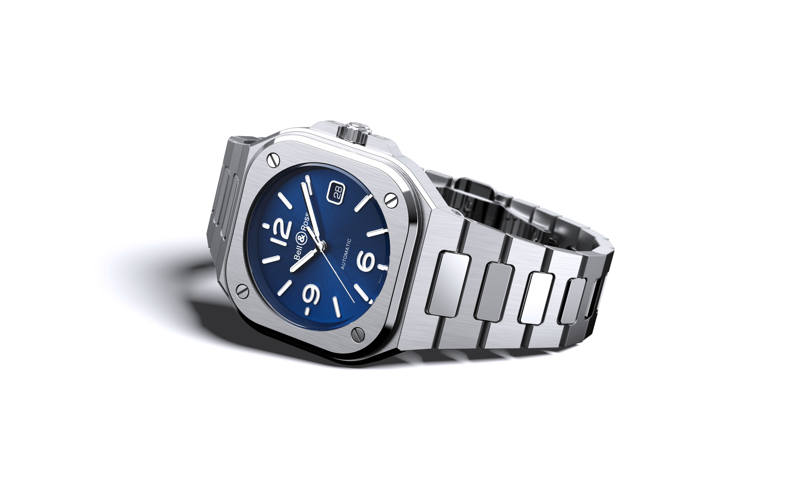 The rich finishes of the BR 05 draw the eye. Its 40 mm case is angular. The satin-finished surfaces are perfectly flat. The polished bevels emphasize and enhance the volumes they contain. These alternating satin-finished and polished surfaces are also found on the remarkably flexible steel bracelet. Particular attention has been paid to the arc of the curve, allowing all the components to be perfectly aligned and ensuring the bracelet can adapt seamlessly to any wrist.
