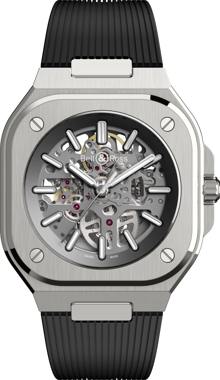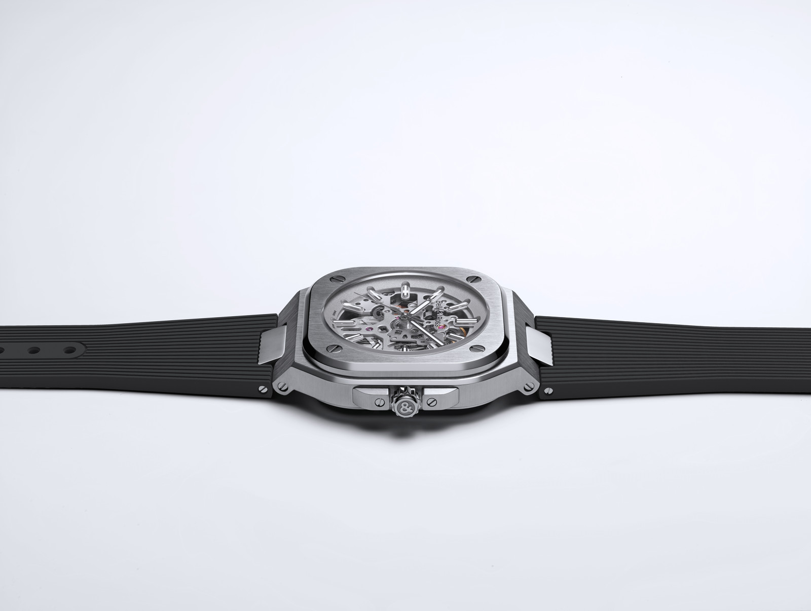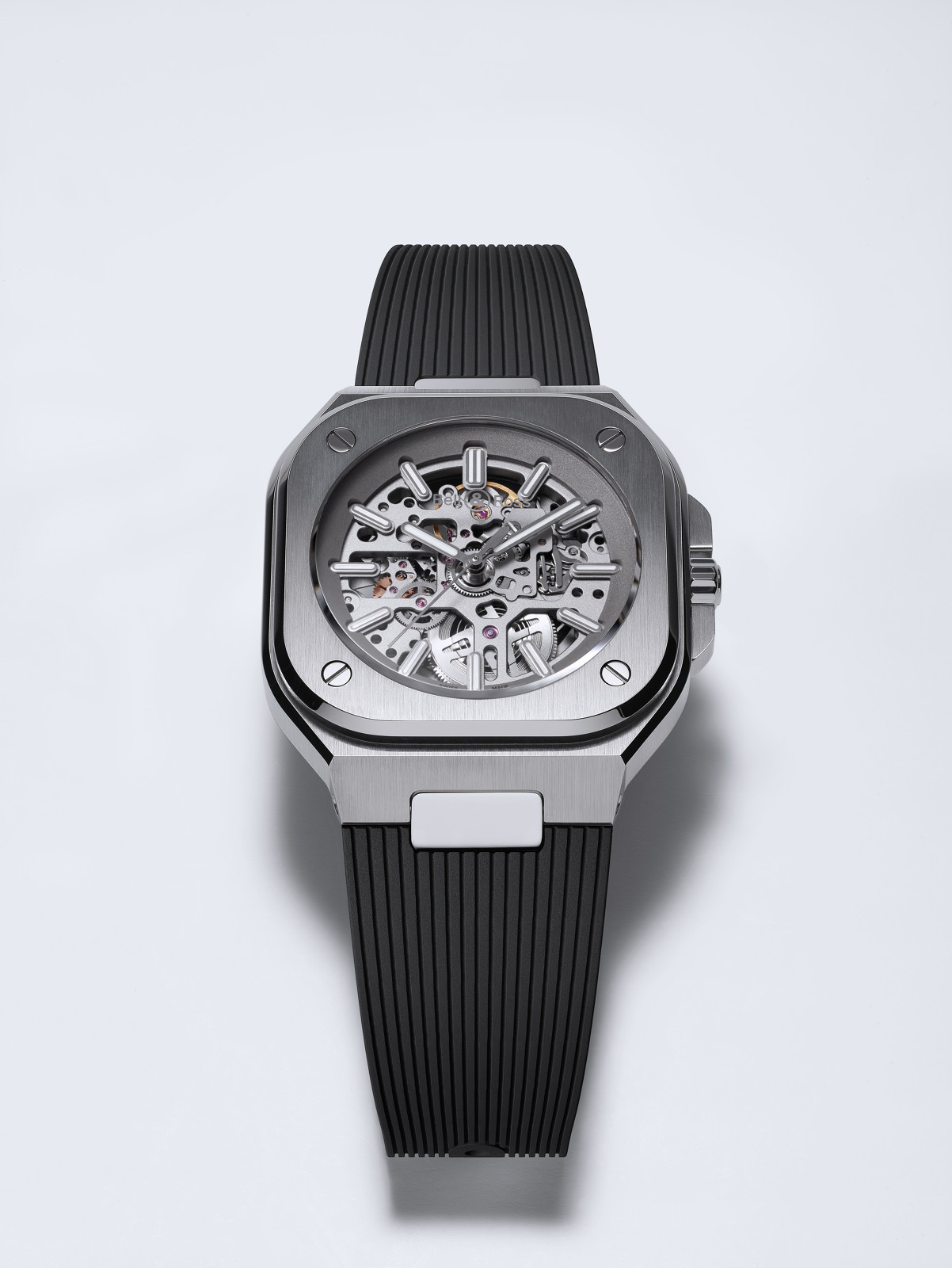 The new collection is also available with a ribbed rubber strap, a truly stylish alternative. The dial of the BR 05, radiating with a subtle sunray finish, offers optimum legibility. It is available in silver grey, navy blue or deep black. These different colourways are complemented by another model, with a skeleton dial and mechanism.